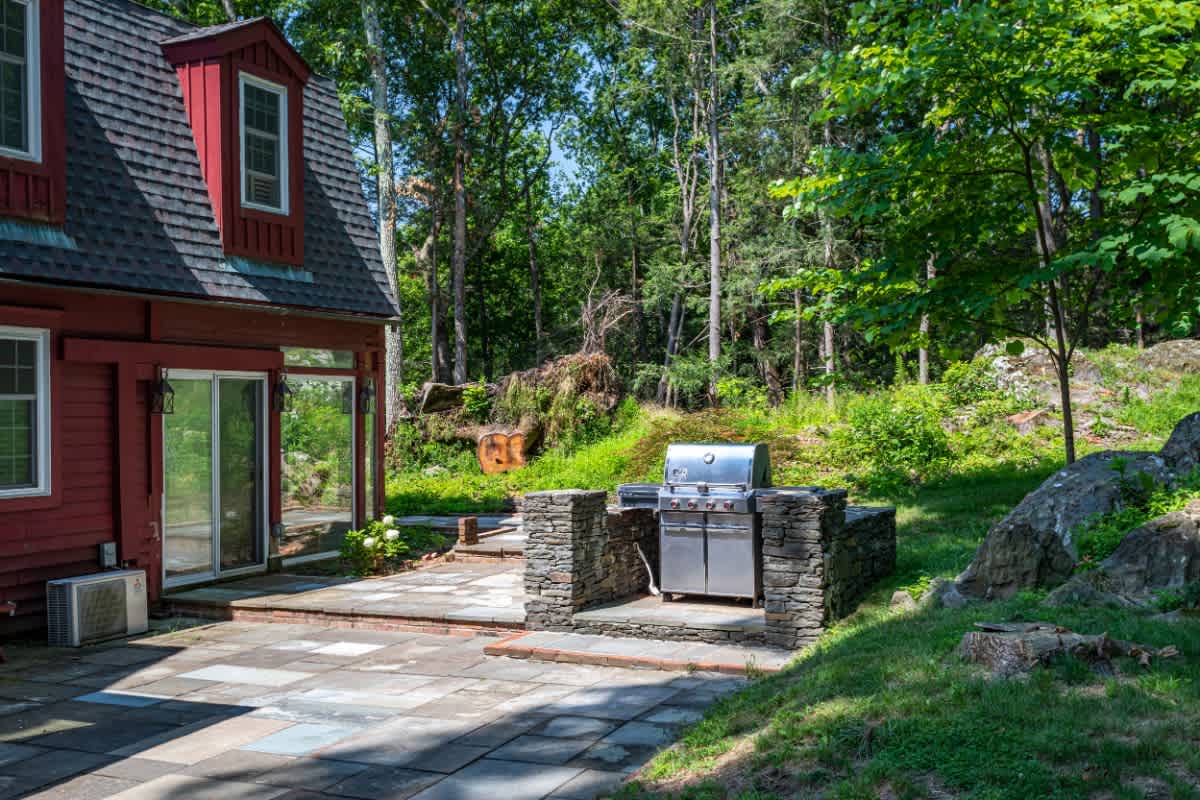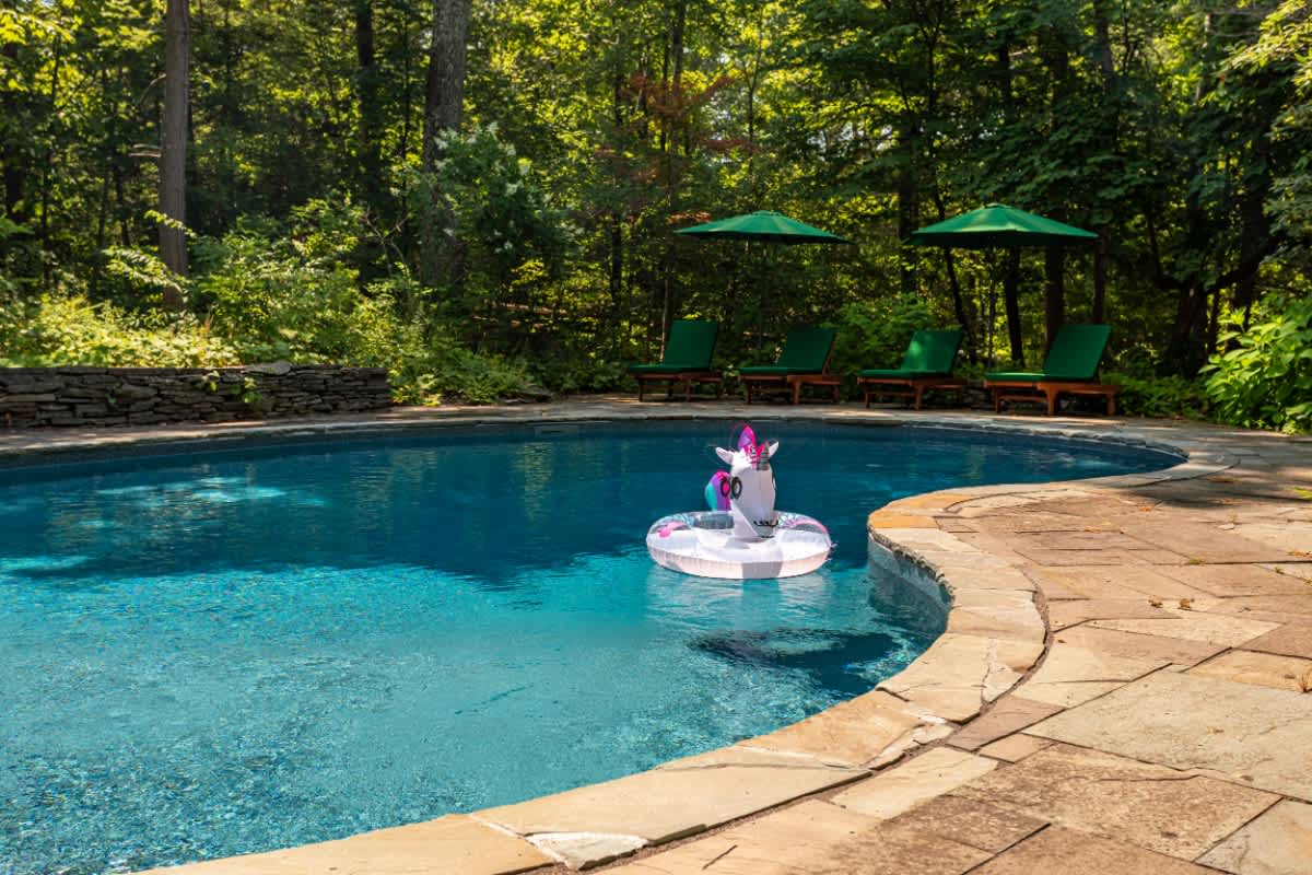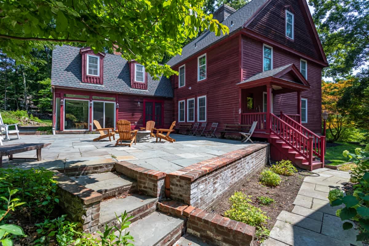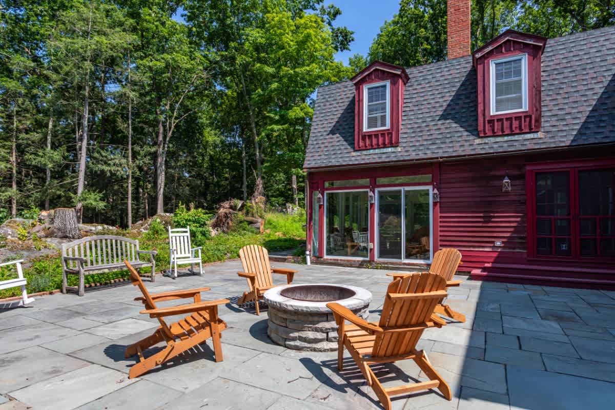 As you arrive at Cardinal Crossing, you’ll step into a soaring double-height entry vestibule that sets the tone for a home designed to welcome both memorable gatherings and quiet moments. A fully stocked, open chef’s kitchen with a glass atrium flows into a sun drenched breakfast nook—perfect for your morning coffee and a croissant from Bread Alone—while just beyond, a long dining table seats ten comfortably for family meals or entertaining. On cooler days, migrate to the living room and gather around the wood-burning fireplace which anchors the space, and a separate TV room with an 80” television sits just off the open living space, like your own personal movie theater, perfect for movie night (popcorn maker included!). This room is also stocked with endless games, puzzles and activities to keep people of any age happy and busy. When you crave something more refined, slip into the bar room/den, where plush seating and a built in custom wet bar invite you to extend the evening over games or conversation. Step through the den to relax in the sunroom, which brightens every afternoon with vaulted windows overlooking the lawn. Glass sliding doors let out to the expansive bluestone patio and fire pit. A side entrance to the house also has a mudroom to keep muddy boots and gear out of sight, and a convenient and adorable wallpapered powder room off the living room allows you to keep the entertaining downstairs without requiring guest to travel upstairs.
