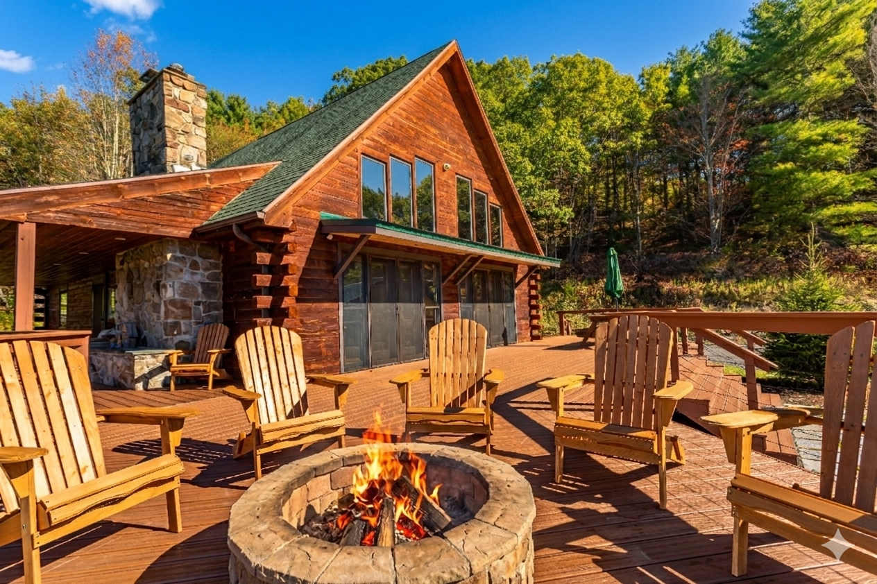 Celestial Cabin is a stunning 3 bed 3 bath log style cabin with classic A-frame architecture on over 100 acres just 3.5 hrs from NYC. Boasting panoramic mountain views from an expansive wraparound deck, large windows throughout plus a pool table for fun game nights, this peaceful haven embodies the spirit of contemporary cabin living.