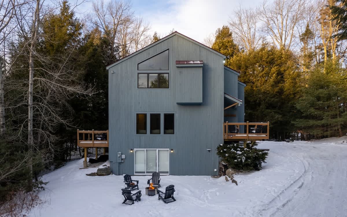 Derry Woods Cabin is a contemporary two-story retreat tucked in a peaceful setting, thoughtfully designed for a relaxing Vermont getaway. Surrounded by trees and natural beauty, the home offers multiple outdoor spaces to unwind, including a welcoming front deck and a larger back deck perfect for dining and enjoying the fresh mountain air.