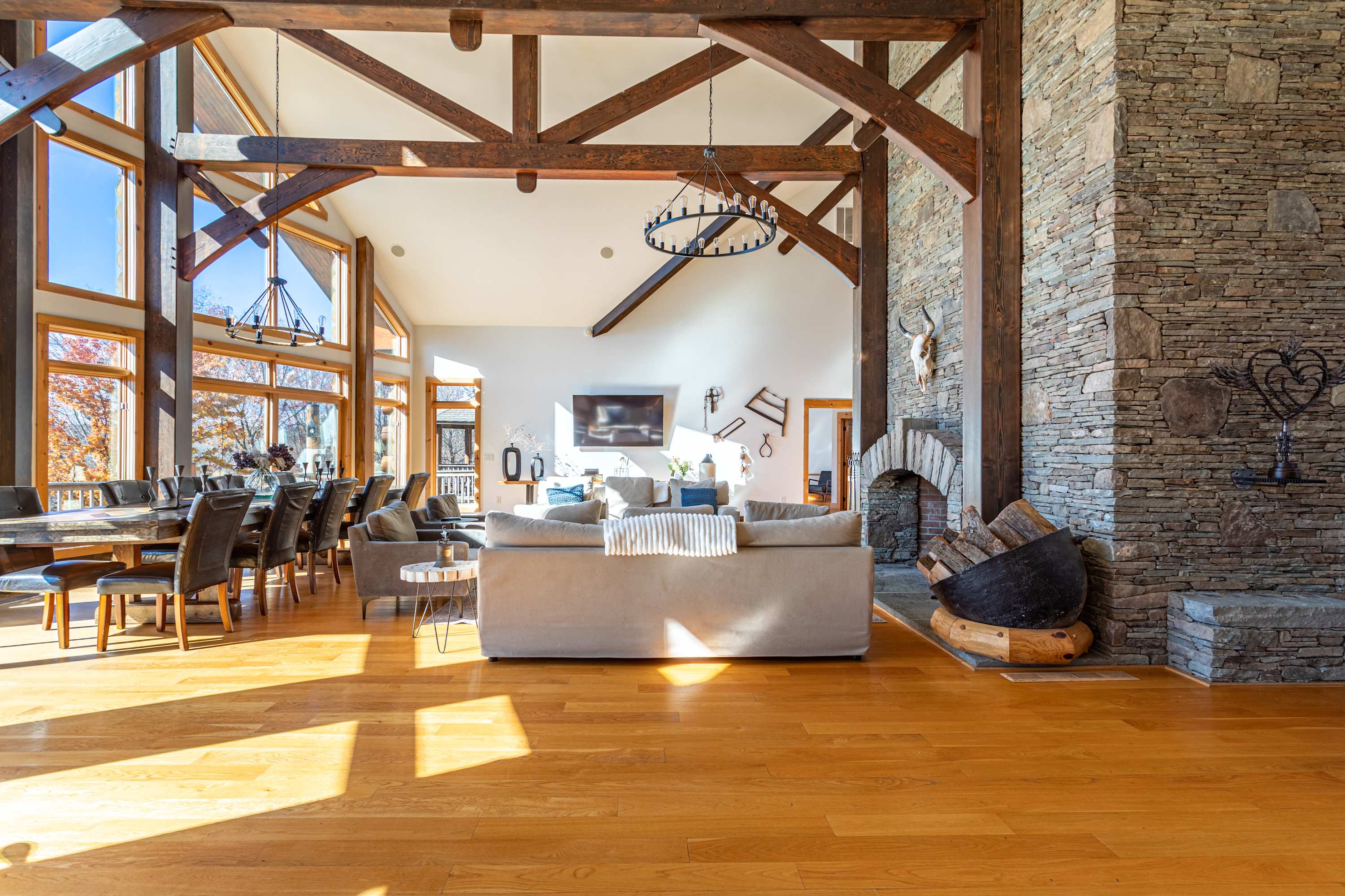 On entering the Log Cabin, you are greeted by a charming seating area and wooded balcony that overlooks the warm and inviting living room. Immediately, floor-to-ceiling picture windows that adorn the front wall capture your gaze with stunning outdoor views. As you make your way down the stairs, exposed oak beams, slate floors, and a grand floor-to-ceiling stone fireplace create an atmosphere of warmth and sophistication, inviting you to unwind and soak in the natural beauty.