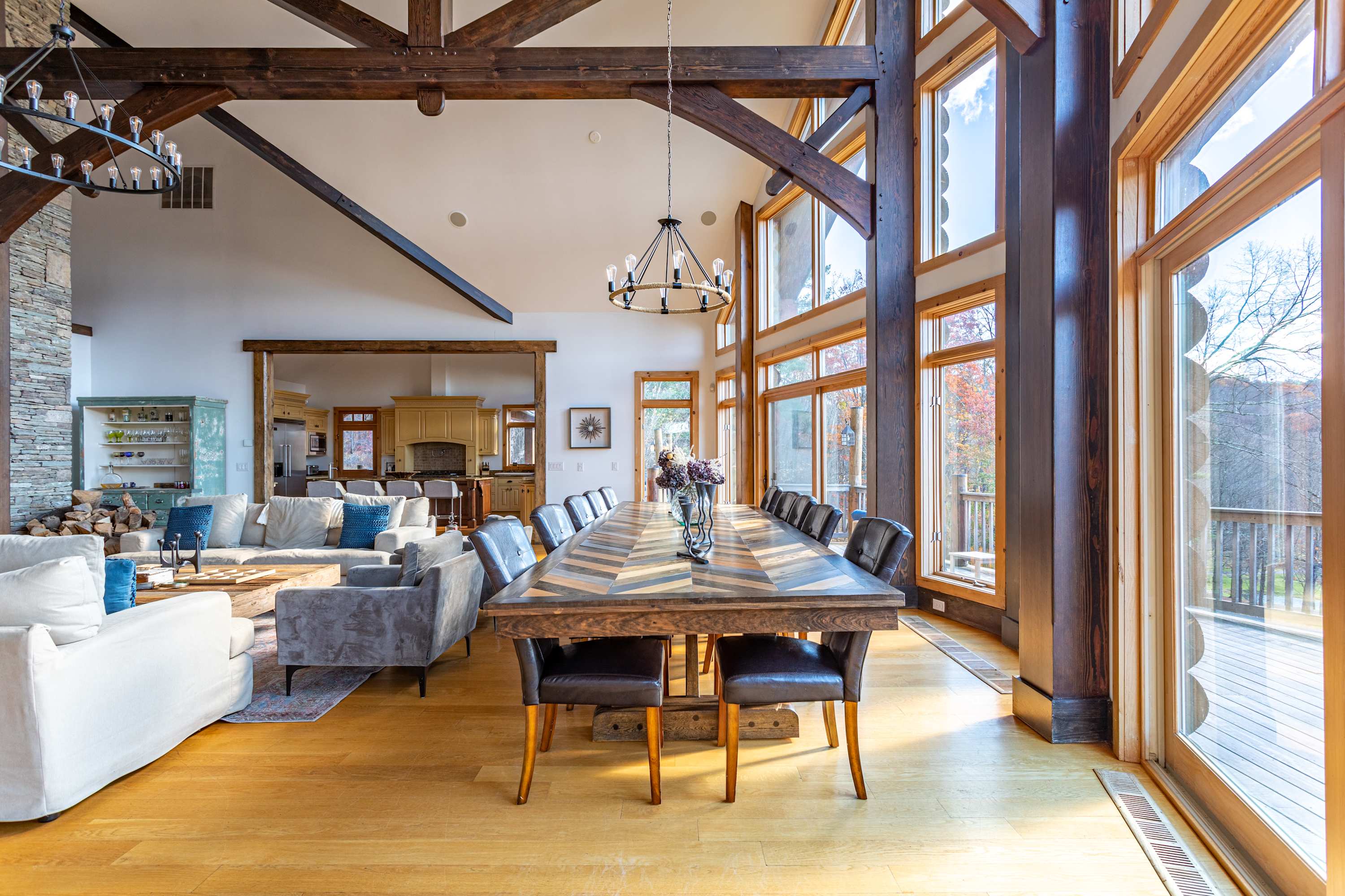 The open-plan design of the main floor creates an easy flow between the spacious living room, indoor dining area, kitchen, and deck. Sink into comfy couches while watching TV beside the grand fireplace, and enjoy dining for 10 on the elegant indoor dining table. Large doors open onto the elevated deck, with multiple seating areas, covered al fresco dining, a firepit lounge area, a large grill, and breathtaking views from every angle.
