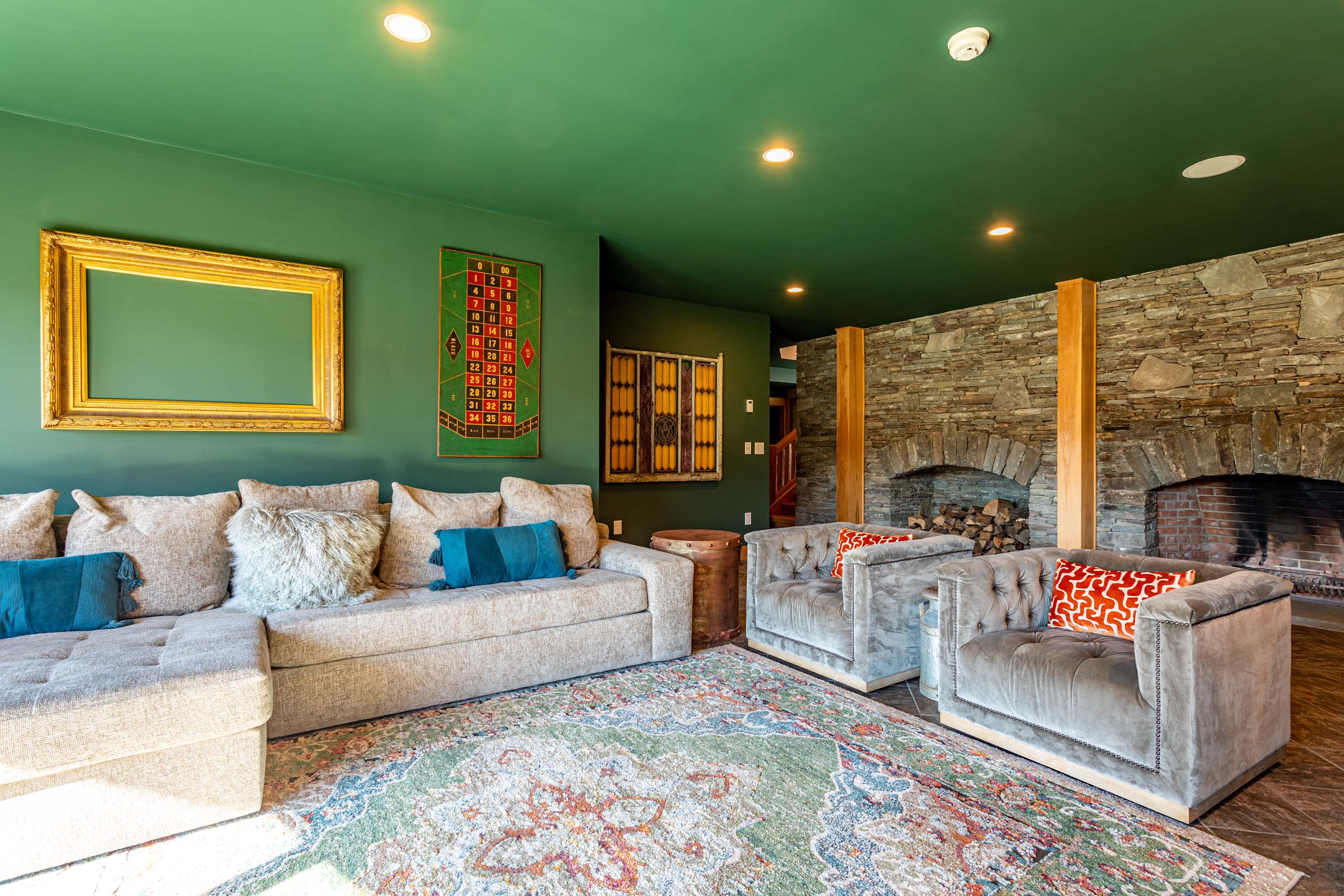 Descending to the lower level, you'll discover a spacious entertainment room featuring a cozy stone fireplace, oversized couches, and a flat-screen TV—perfect for enjoying a movie or a friendly game night. Large doors open directly onto the property's gardens, offering delightful views of the surrounding landscape. On this level, 3 ensuite bedrooms await with restful accommodations. Bedroom 2 offers another king bed, Bedroom 3 has two single beds, and Bedroom 4, a queen bed. The fifth bedroom is ideal for children with two bunk beds (twin over full and twin over twin) and an additional half bathroom completes this level.