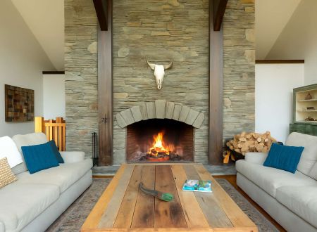 The open plan design of the main floor creates an easy flow between the spacious living room, indoor dining area, kitchen and deck. Sink into comfy couches while watching TV beside the grand fireplace, and enjoy dining for 10 on the elegant indoor dining table. Large doors open onto the elevated deck, with multiple seating areas, covered al fresco dining, a firepit lounge area, a large grill, and breathtaking views from every angle.