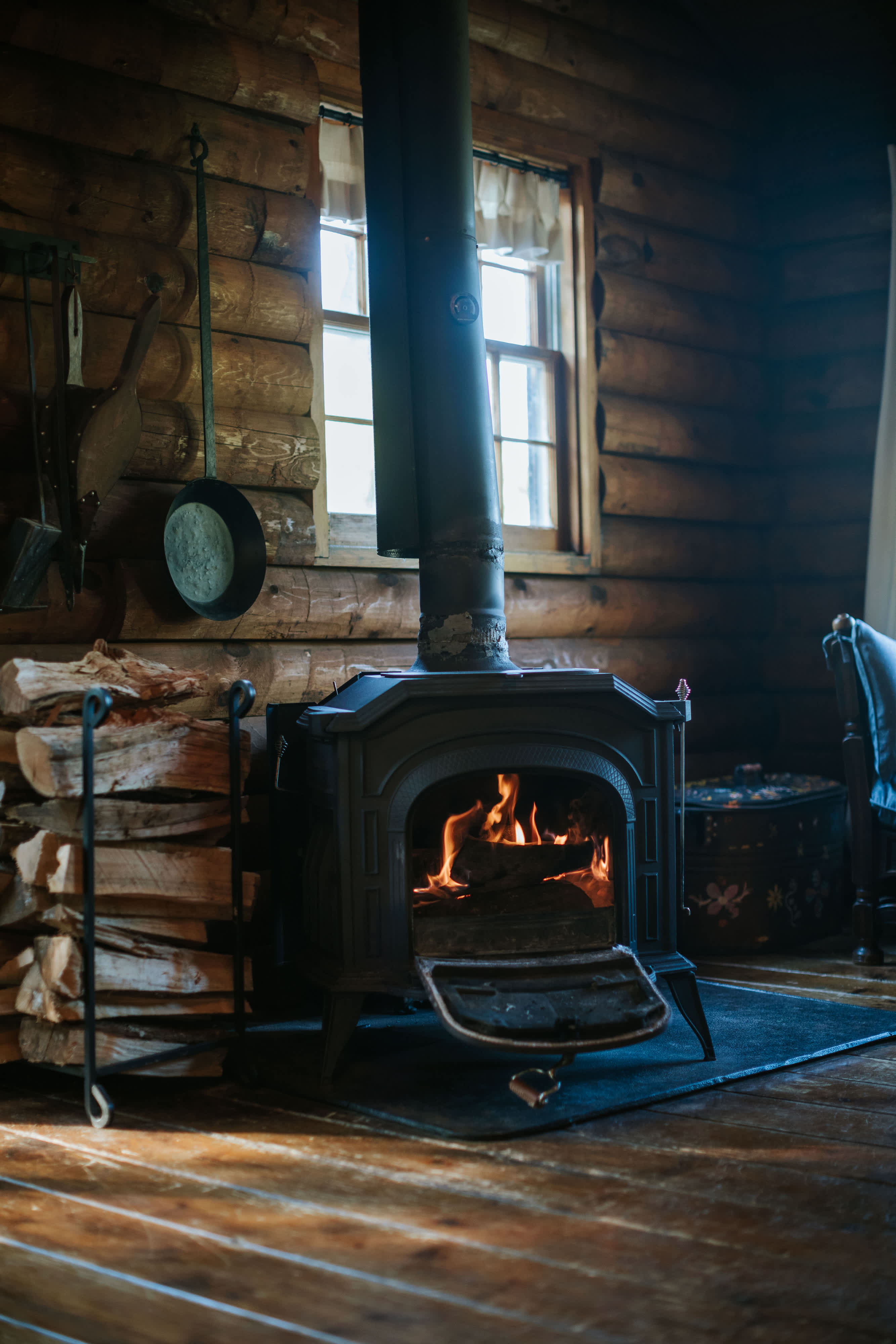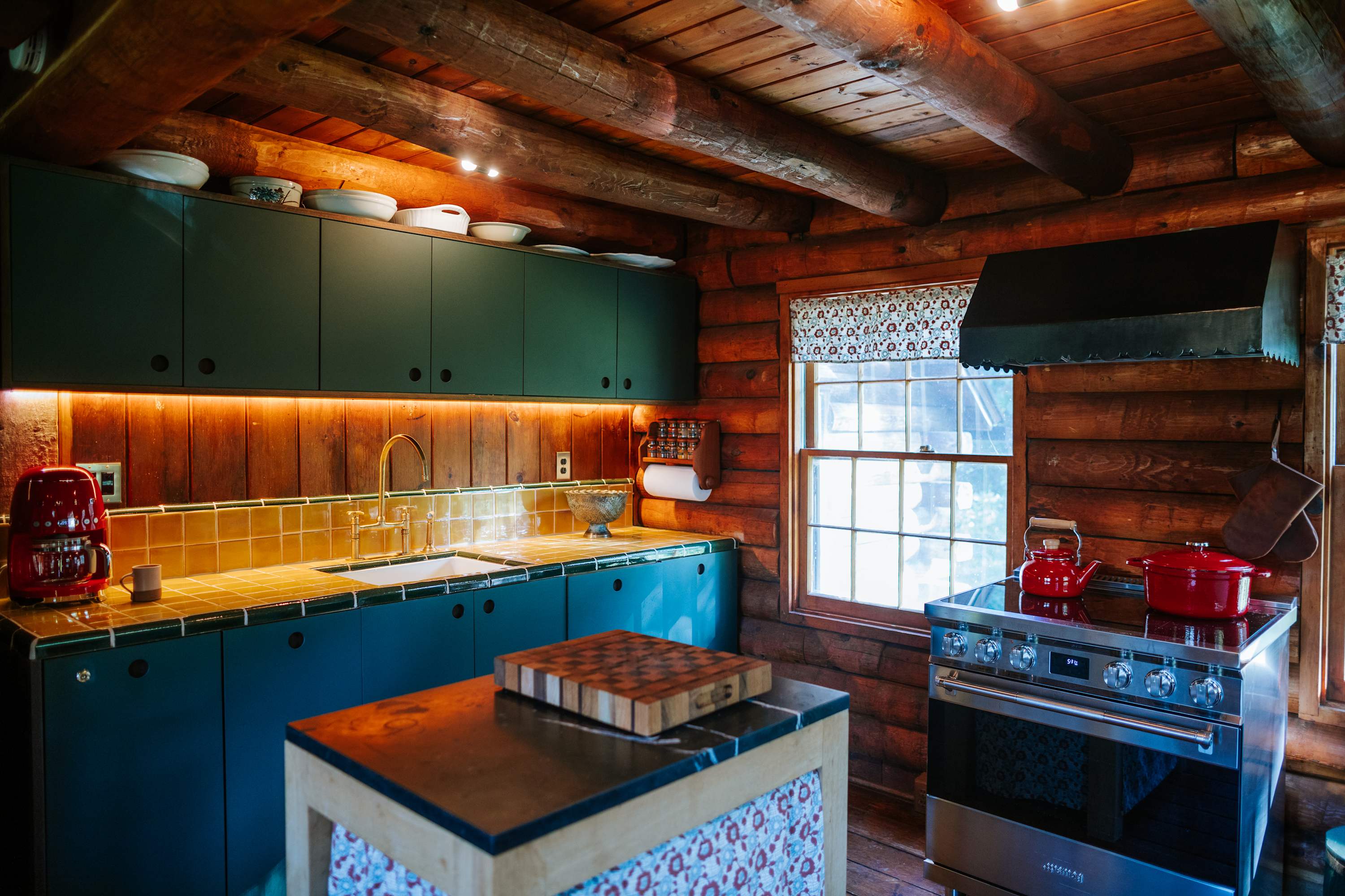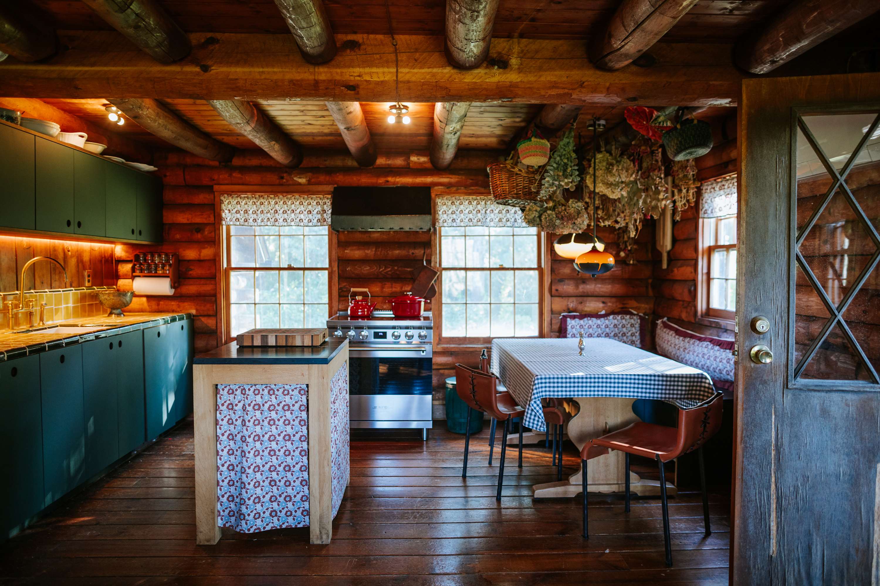 To the right, the kitchen and dining area feature deep green cabinetry with brass fixtures, a farmhouse-inspired island, a built-in dining nook with cushioned bench seating and a farmhouse-style table, a wood stove and access to the deck - ideal for slow mornings or enjoying meals with family and friends.