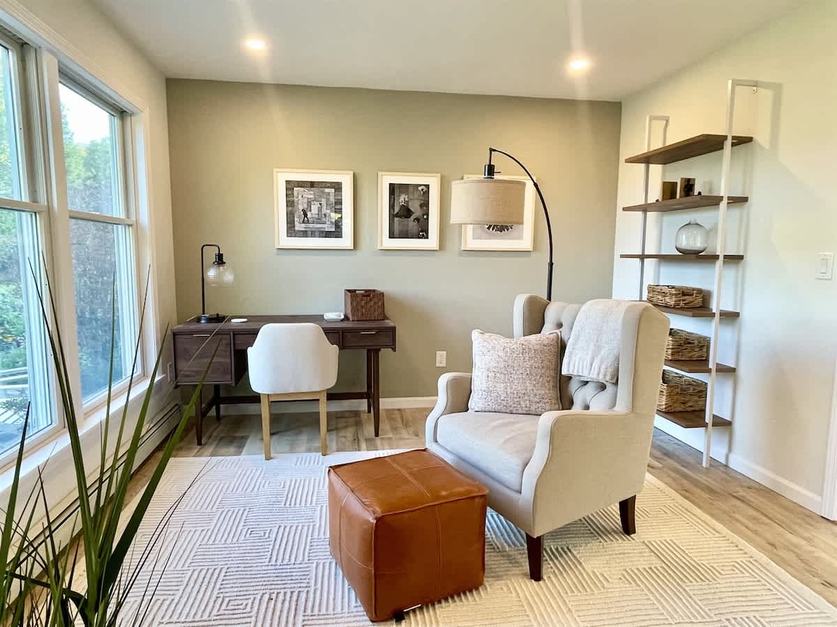 Off the kitchen/dining area, you'll find the cozy reading room/office, where you can curl up with a good book while enjoying mountain views through the floor-to-ceiling windows.
