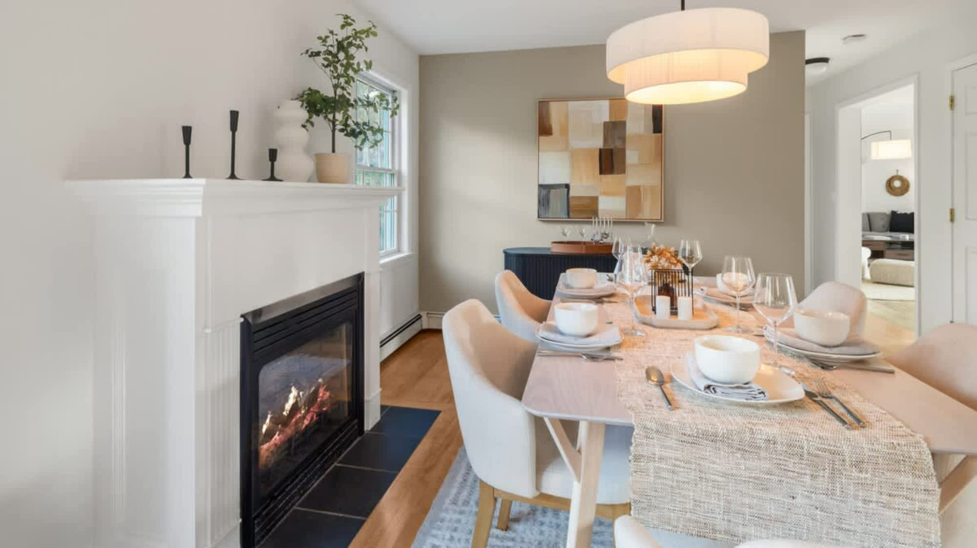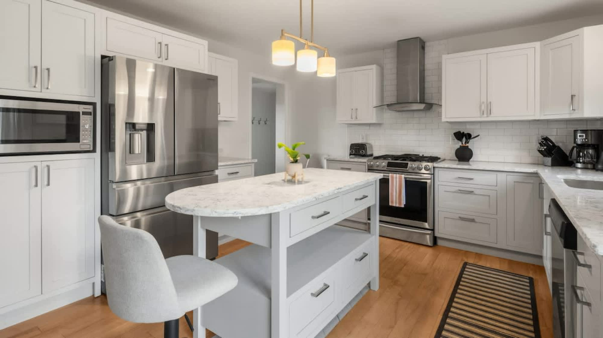 The modern kitchen, featuring new appliances and a center island, is fully equipped for preparing delicious meals. With an open floor plan, you’ll love dining in the picturesque dining room by the gas fireplace.