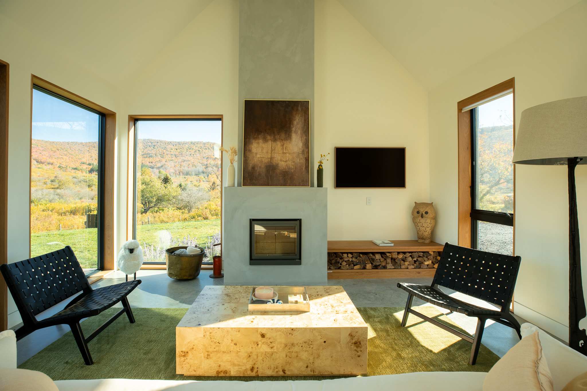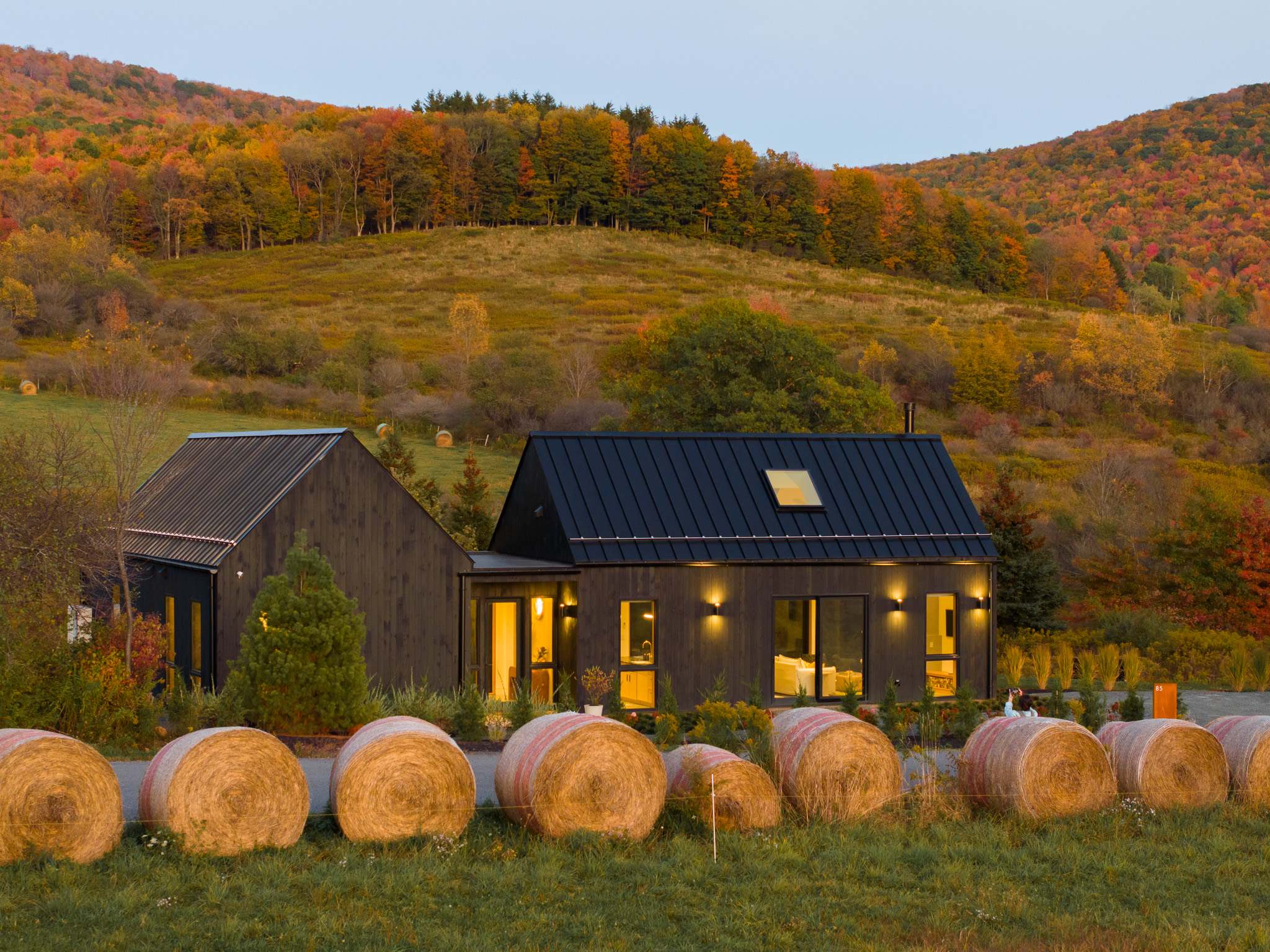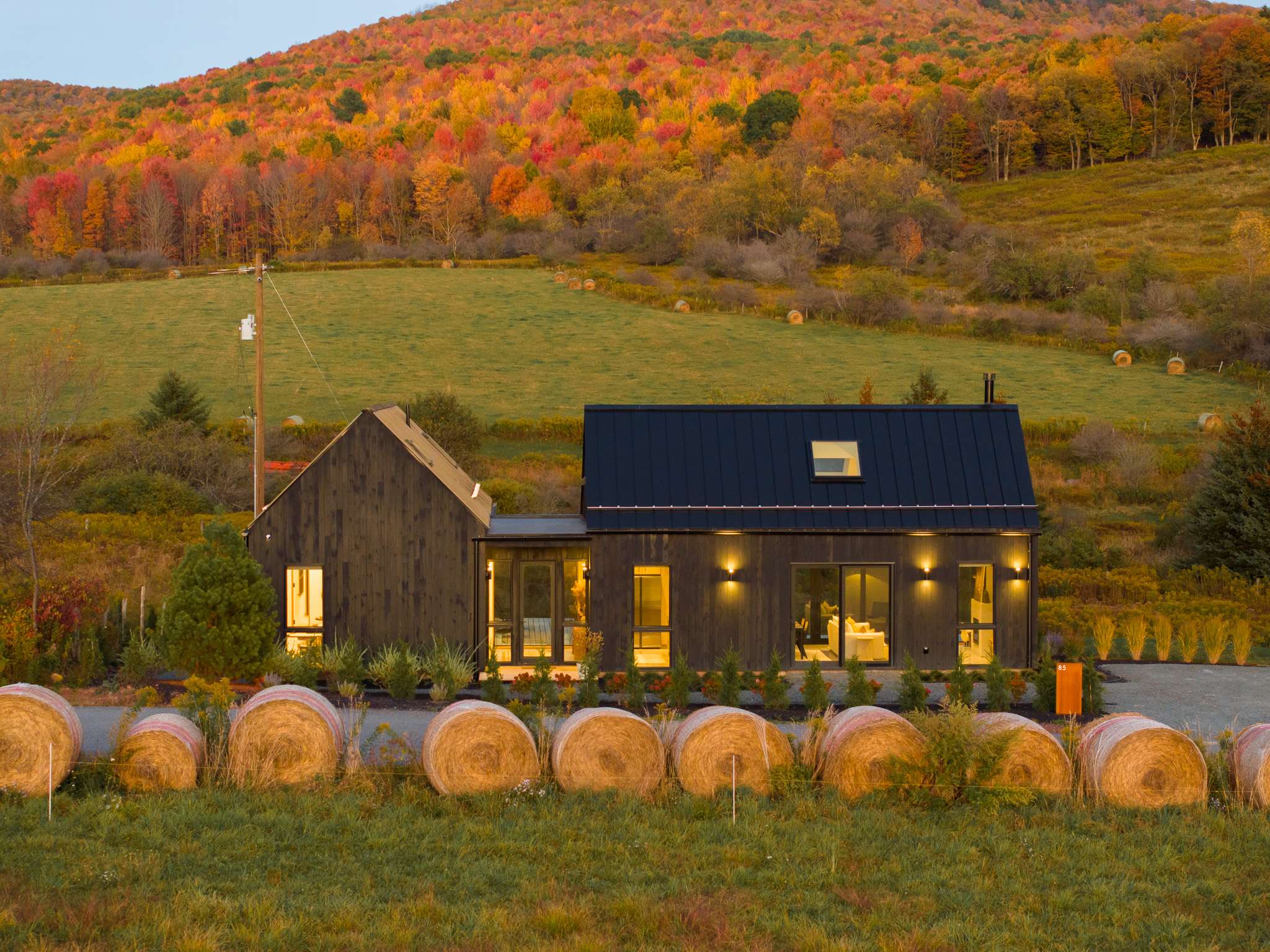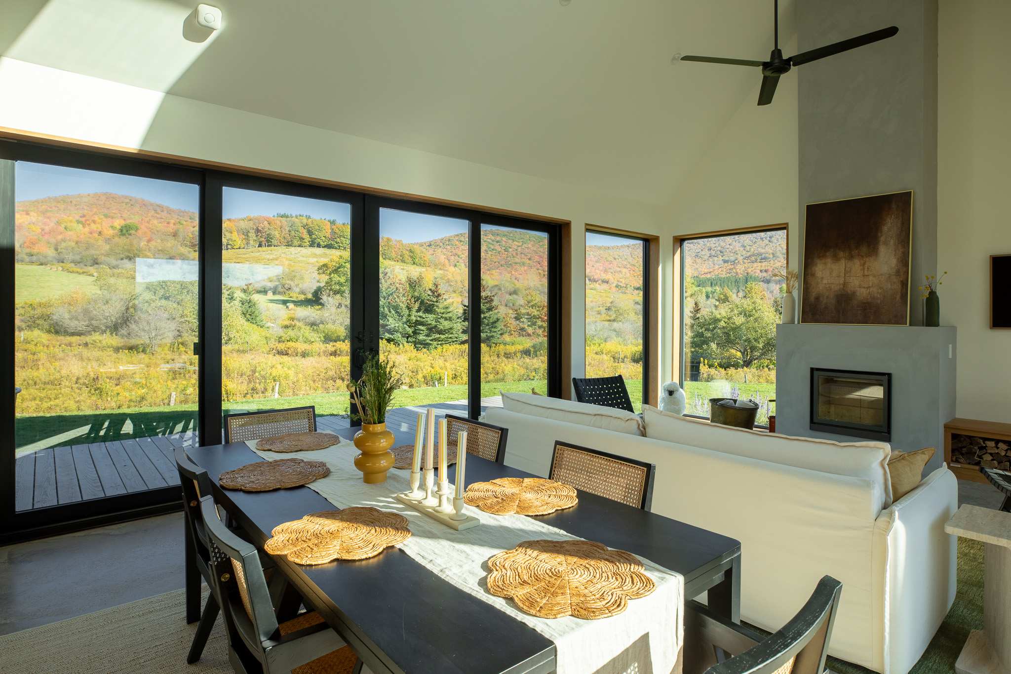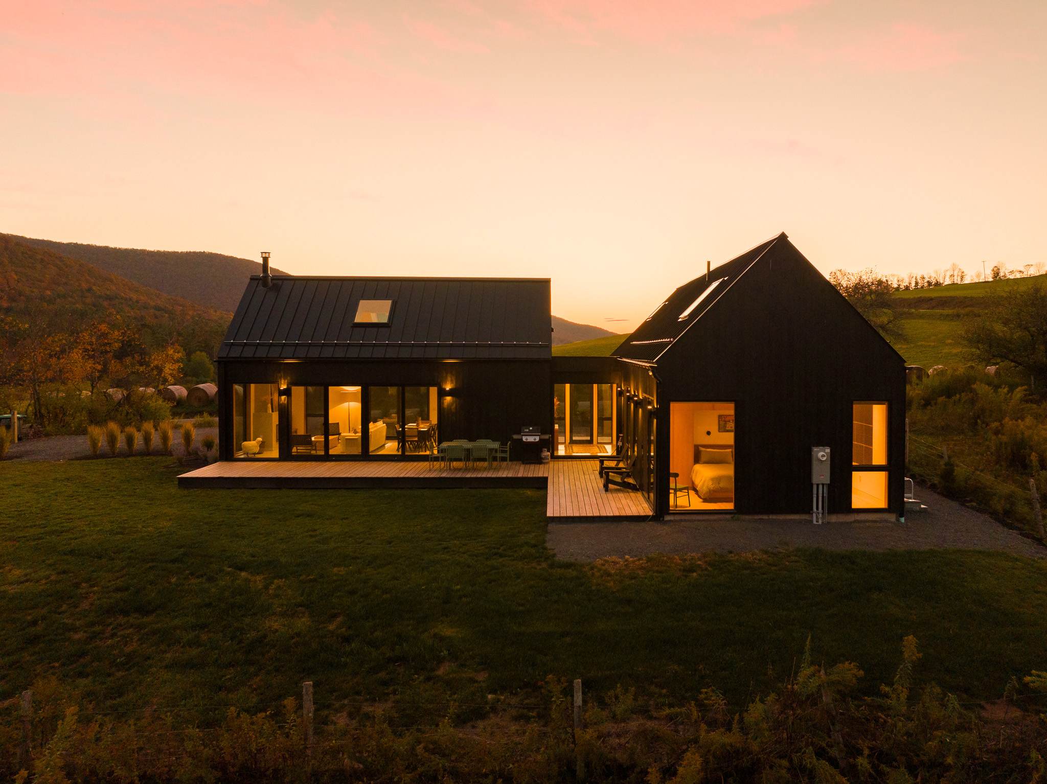 Endless Meadow House is a modern 3 bed, 2 bath black barn retreat just under 3 hours from NYC. With a breathtaking backdrop of lush mountains, rolling meadows & open farmland, the home features Scandinavian inspired design, large windows offering panoramic views, a cozy fireplace, a firepit for evenings under the stars & a small bedroom that doubles as an office.