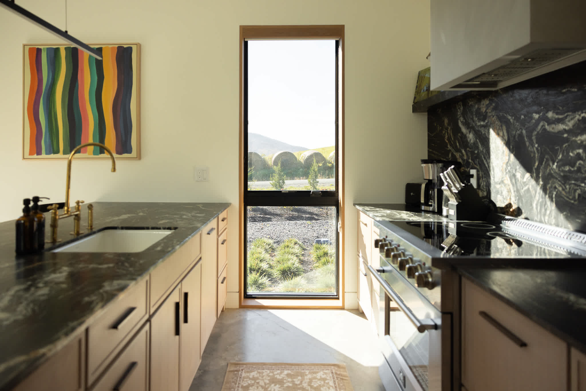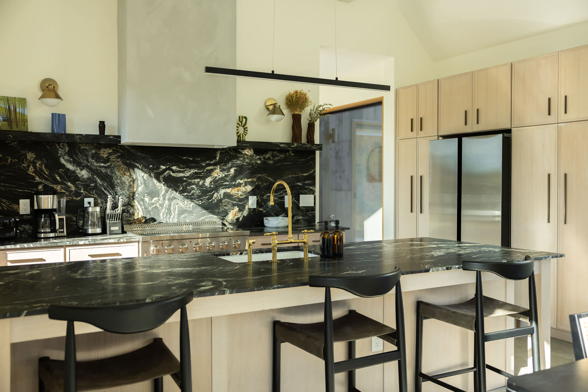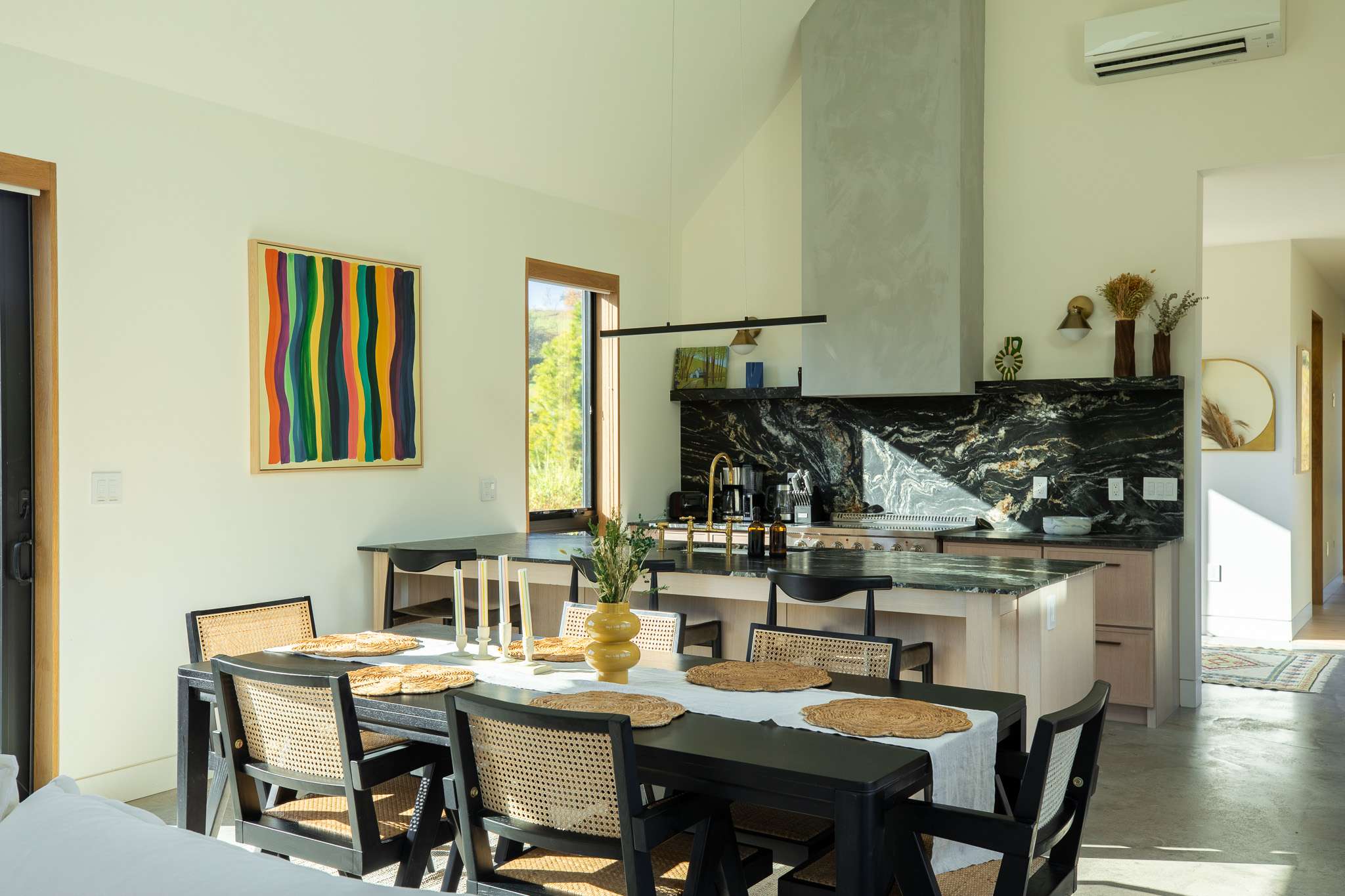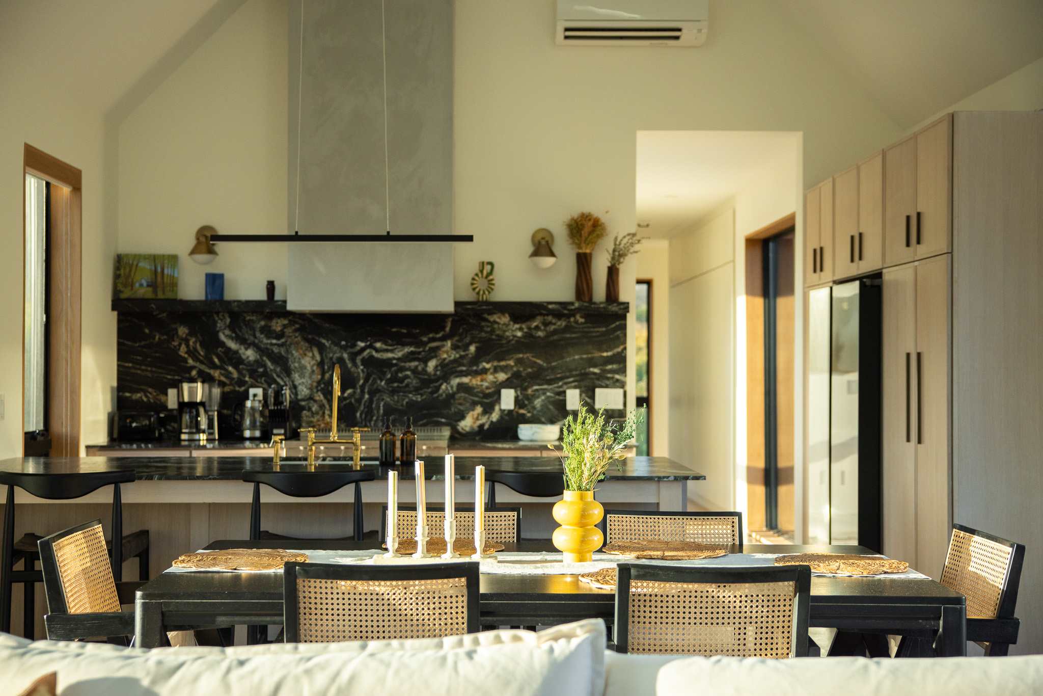 The open-concept living, dining, and kitchen area features soaring vaulted ceilings, and expansive windows that frame stunning views. Anchored by a concrete fireplace, the living space invites relaxation with a plush white sofa and TV while the dining area offers a stylish spot for shared meals. The fully equipped gourmet kitchen stands out with dramatic black marble countertops, and a spacious breakfast island with bar seating—great for everything from morning coffee to evening entertaining.