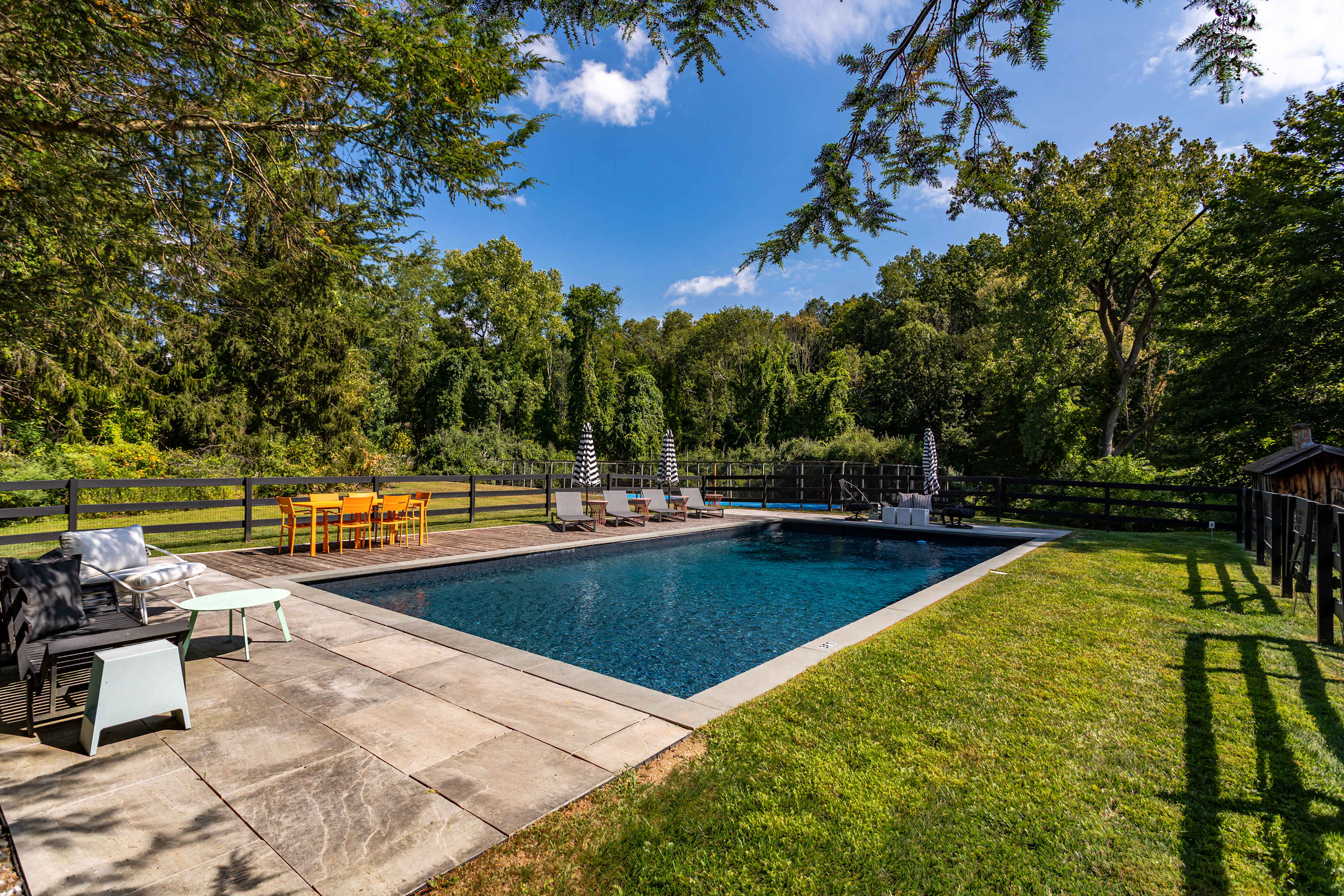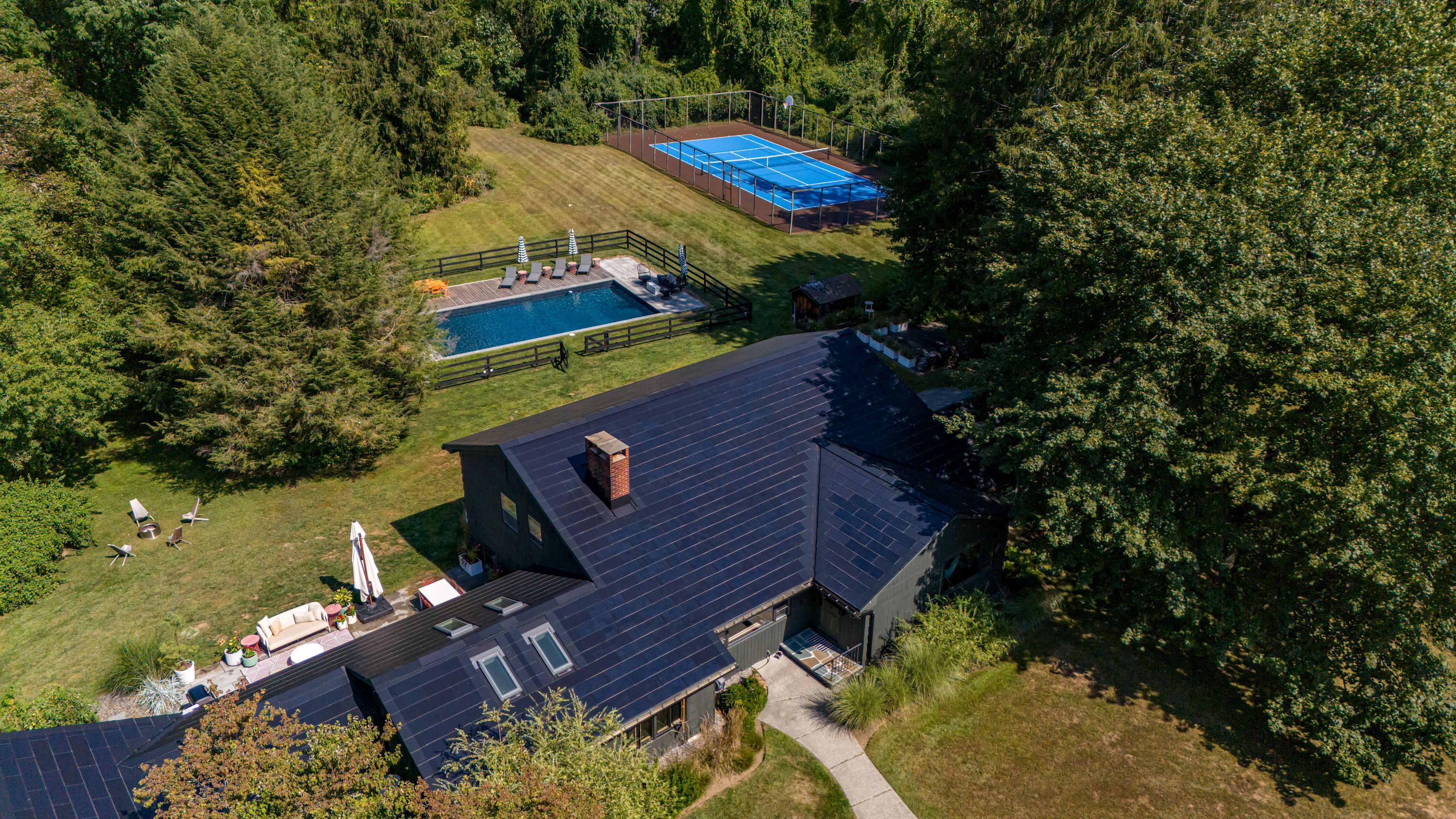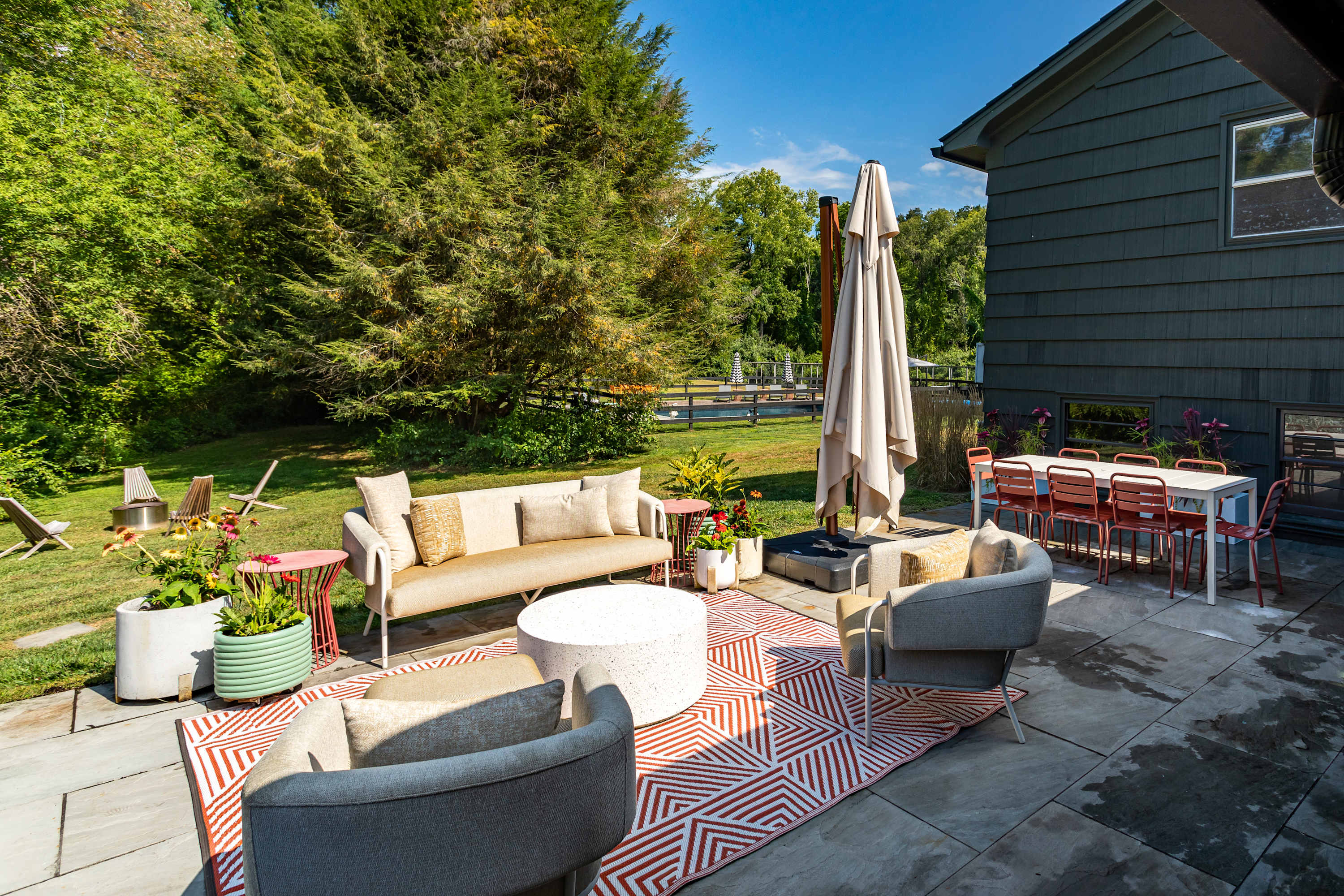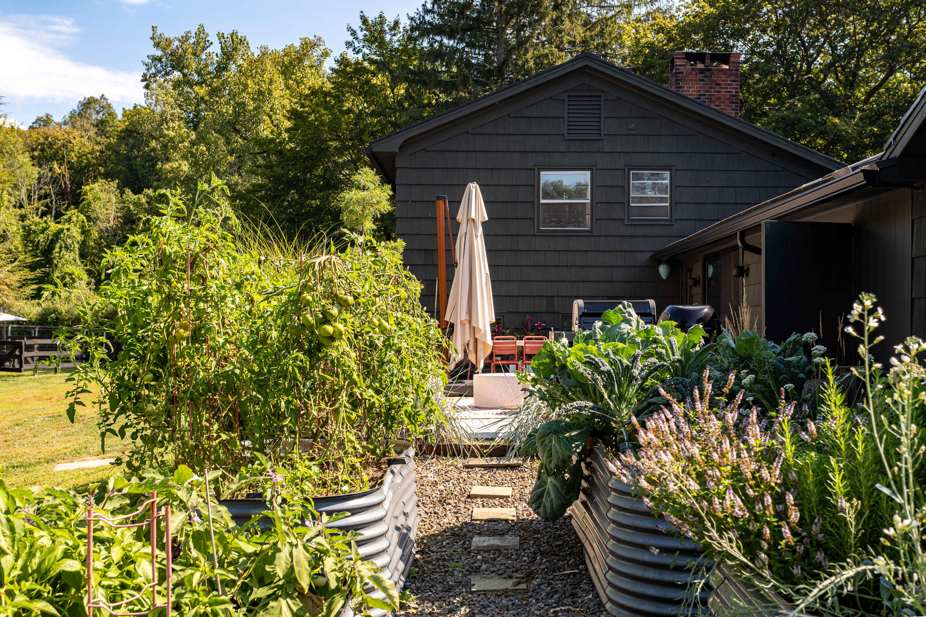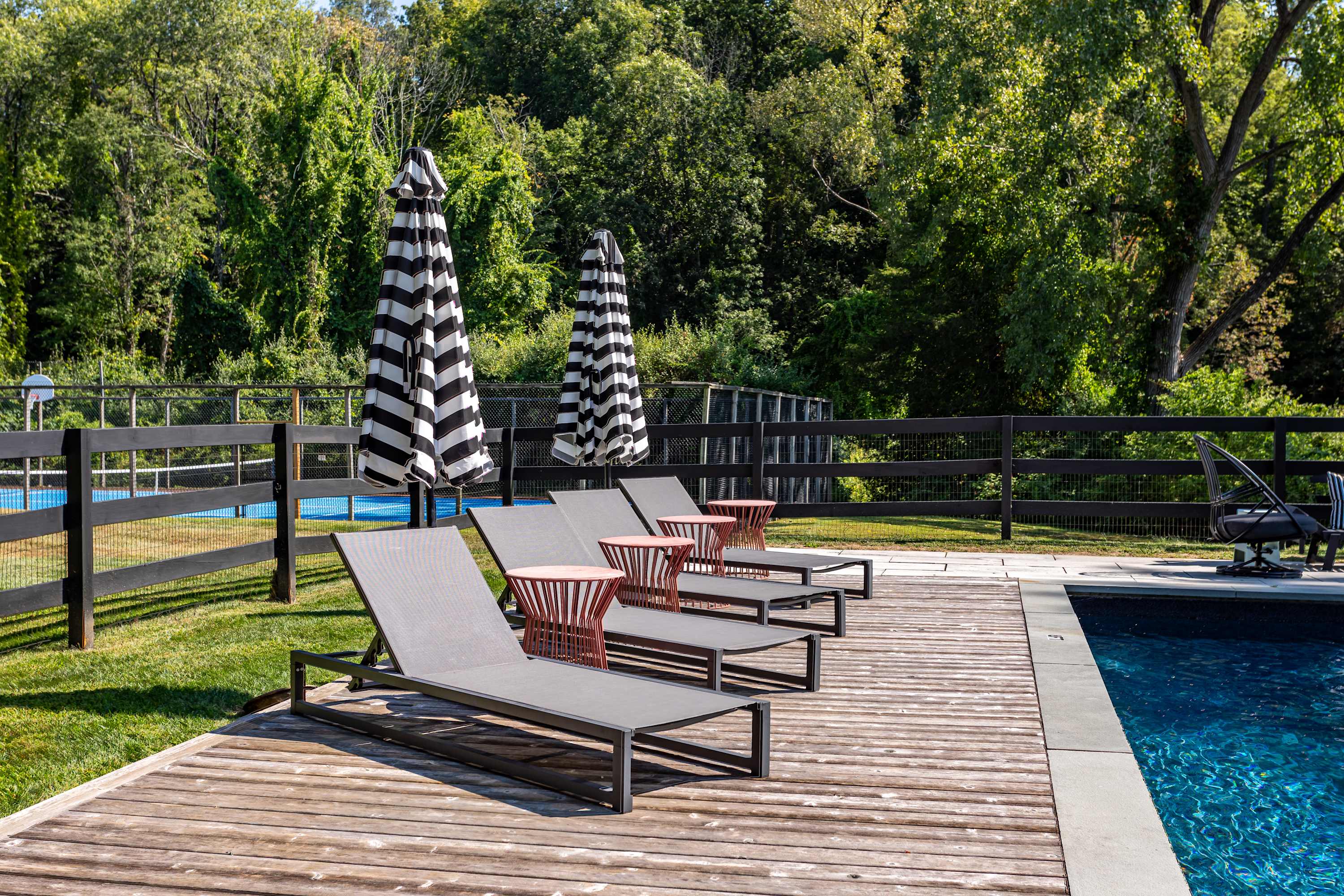 The fenced-in pool area is a peaceful hangout spot complete with sunbeds, side tables and umbrellas, a dining table with chairs, and additional seating options. Nearby, the newly resurfaced tennis courts offer a great way to stay active—white-soled tennis shoes only, please. The patio and BBQ area include another dining table and lounge furniture, while raised garden beds produce fresh vegetables and herbs throughout the summer. A cozy outdoor fire pit with seating invites you to unwind, with additional seating areas scattered throughout the grounds for plenty of outdoor relaxation. THE POOL IS NOT HEATED.