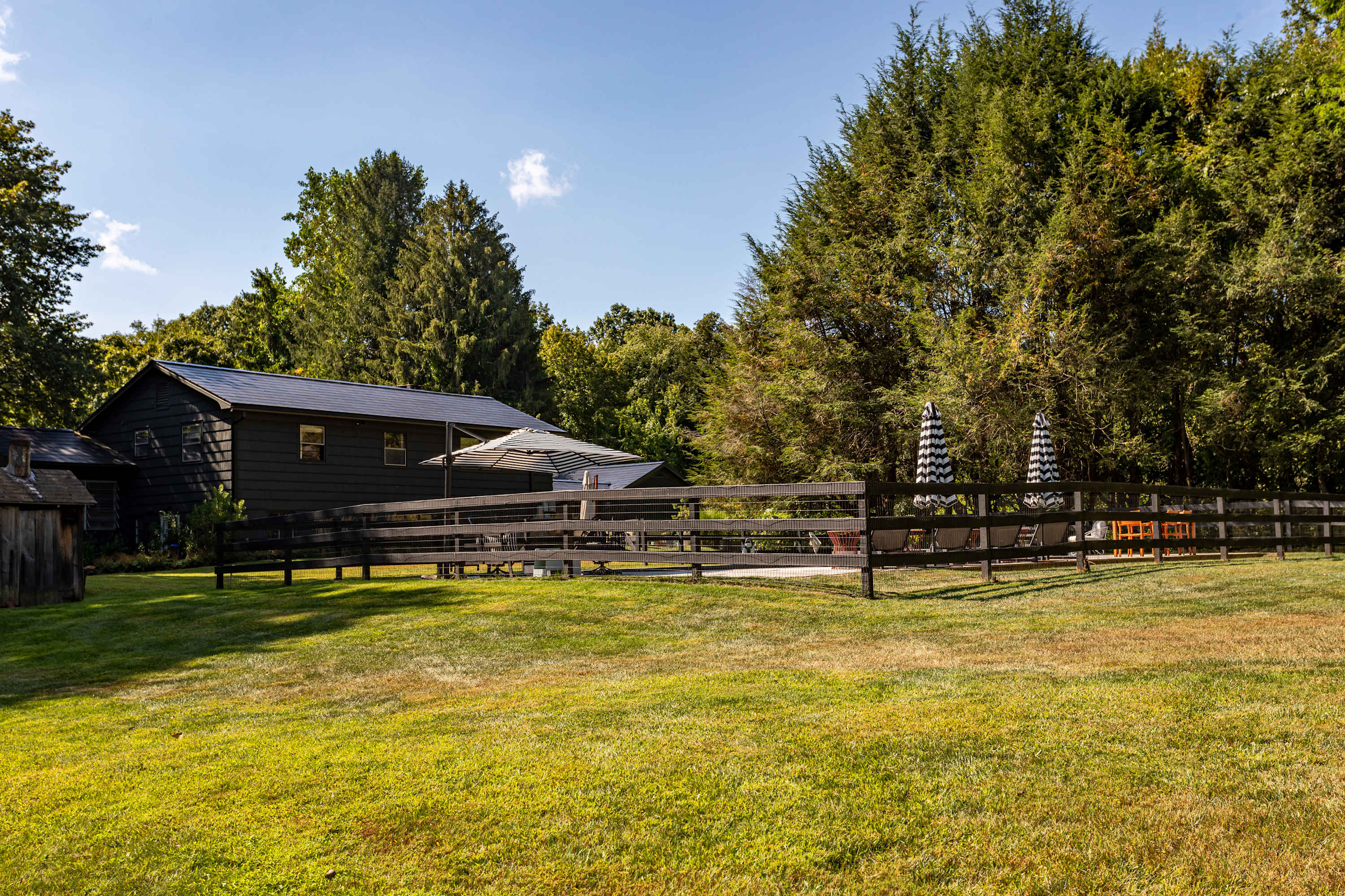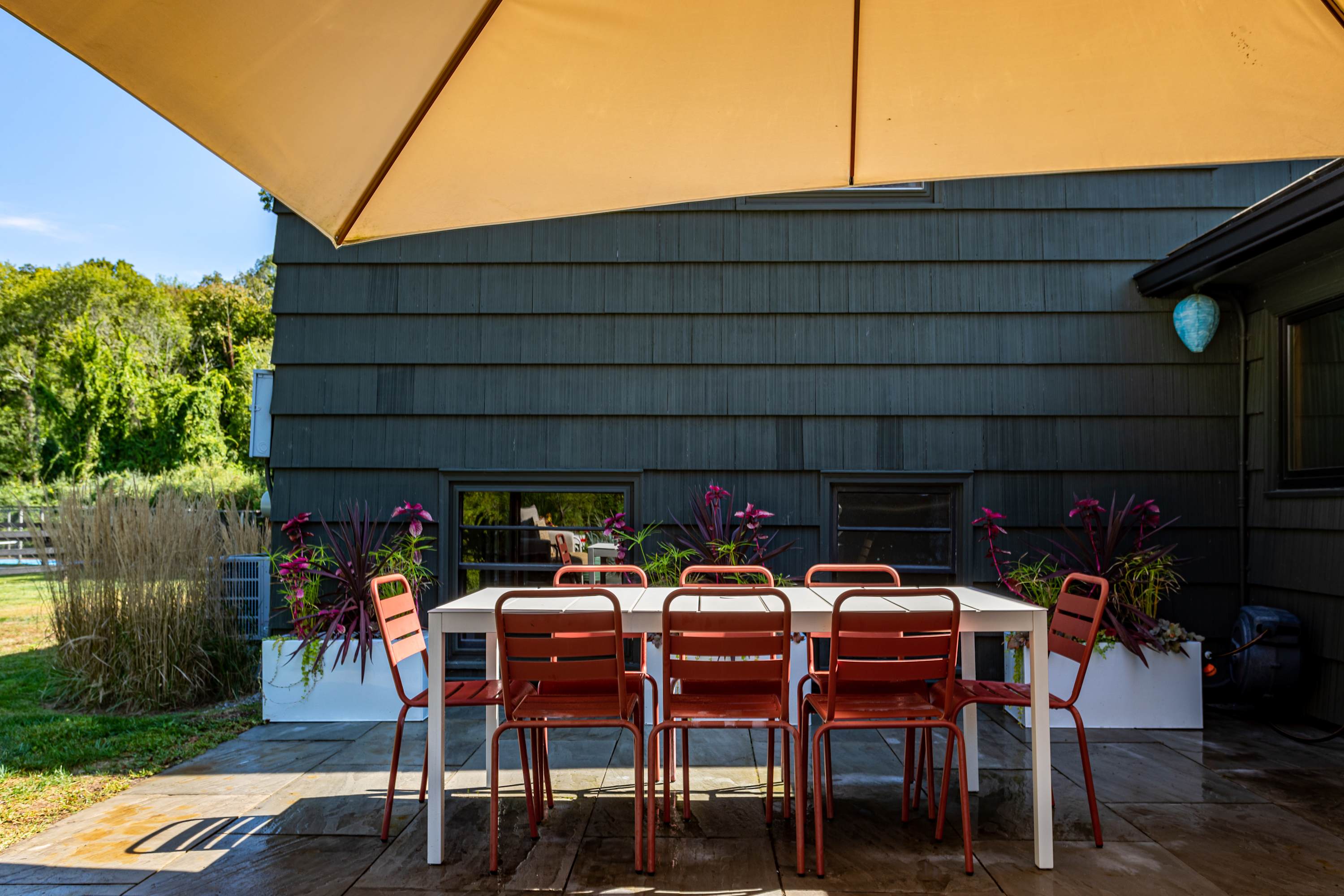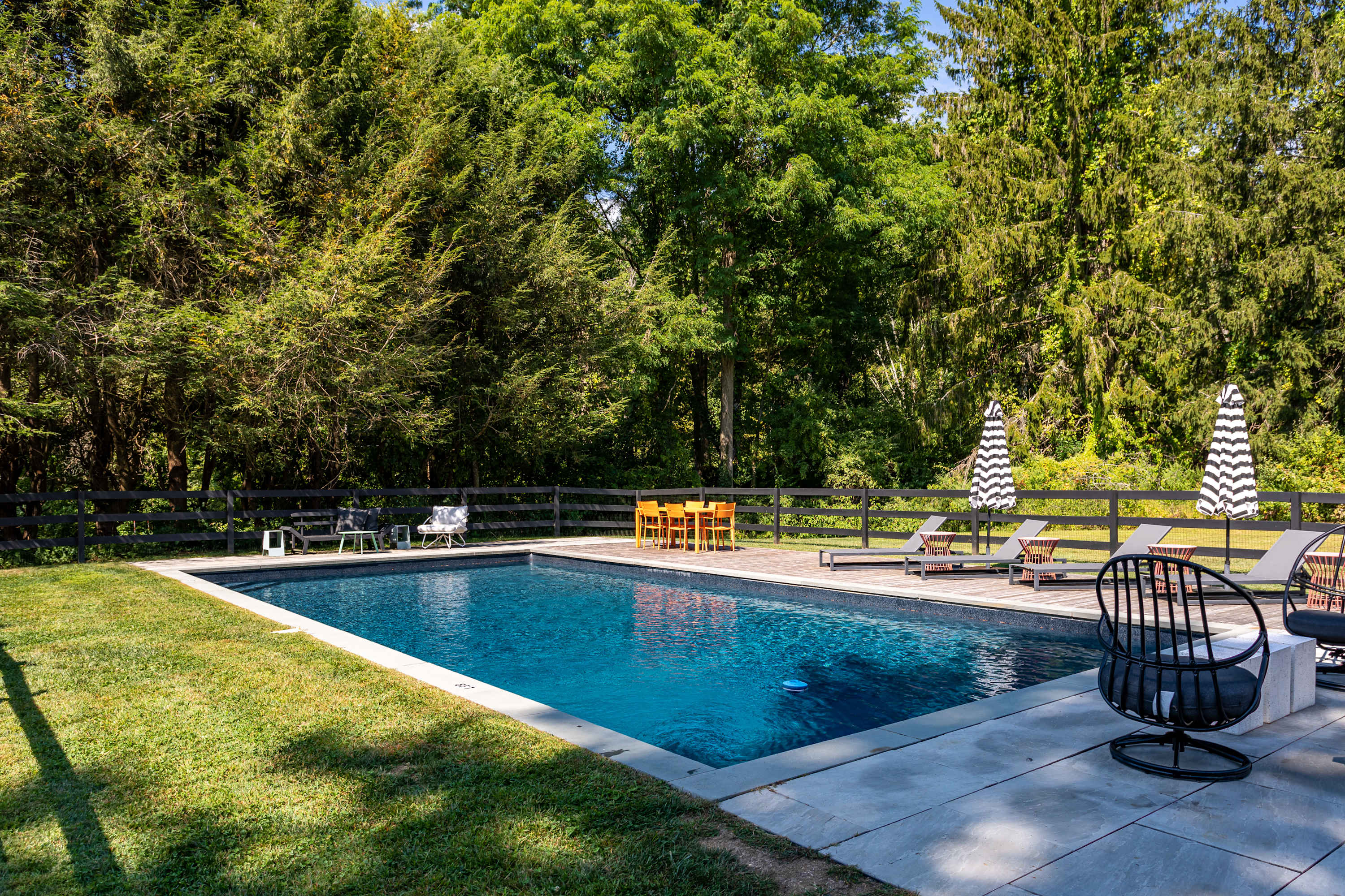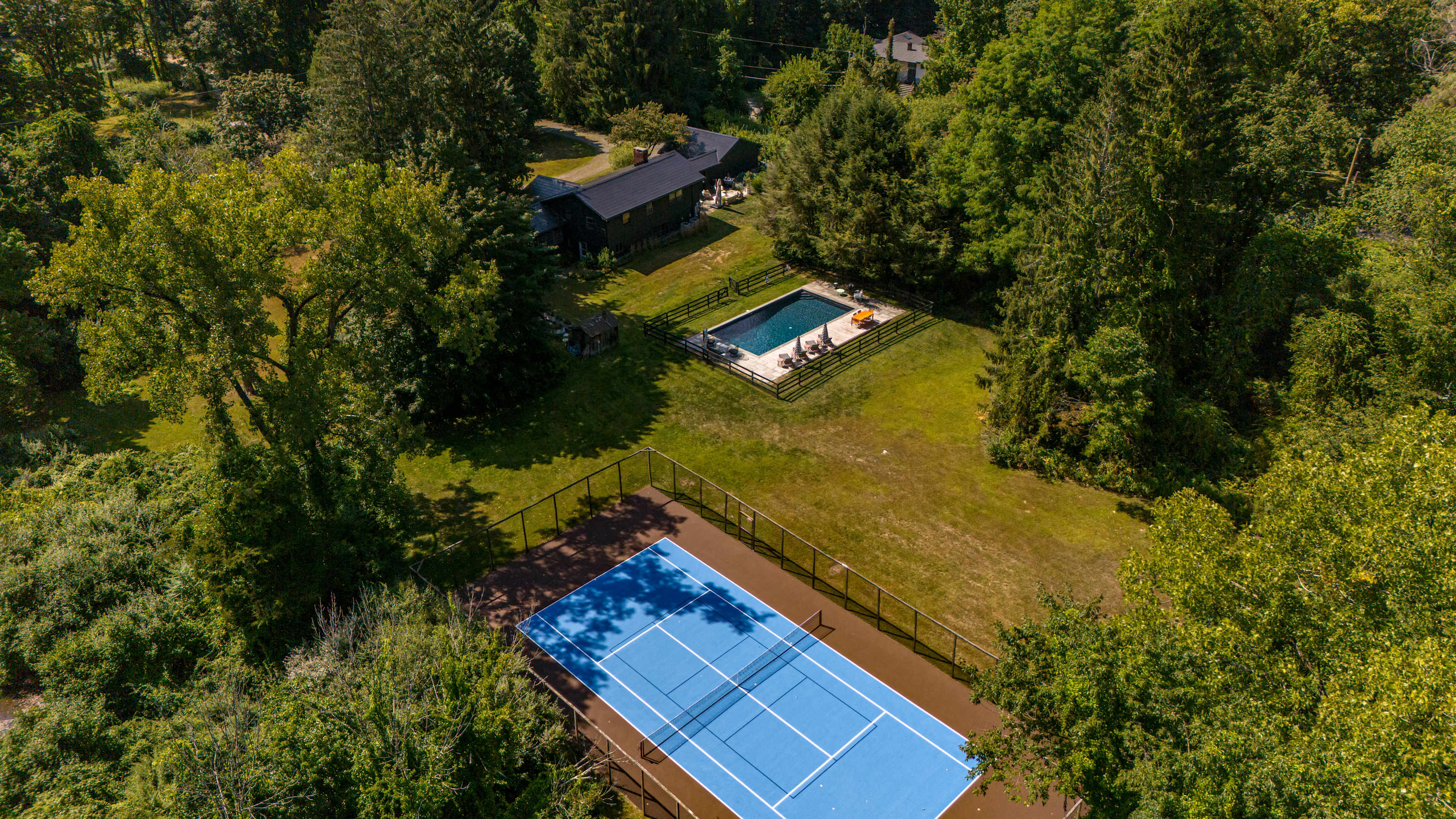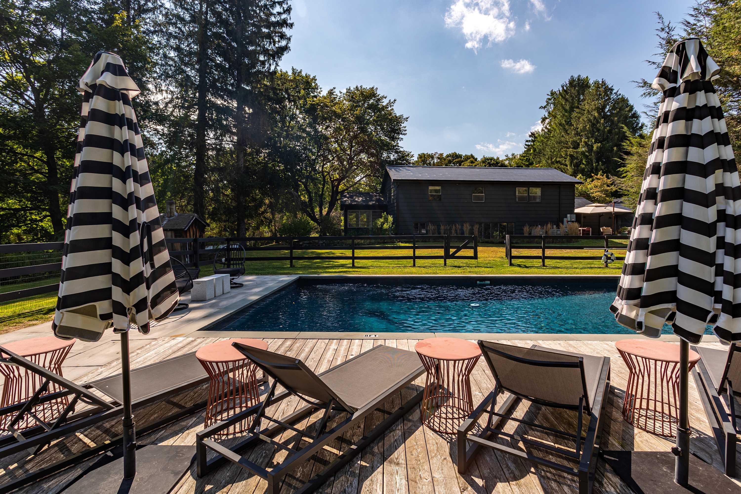 The fenced-in pool area is a peaceful hangout spot complete with sunbeds, side tables and umbrellas, a dining table with chairs, and additional seating options. Nearby, the newly resurfaced tennis courts offer a great way to stay active—white-soled tennis shoes only, please. The patio and BBQ area include another dining table and lounge furniture, while raised garden beds produce fresh vegetables and herbs throughout the summer. A cozy outdoor fire pit with seating invites you to unwind, with additional seating areas scattered throughout the grounds for plenty of outdoor relaxation. THE POOL IS NOT HEATED.