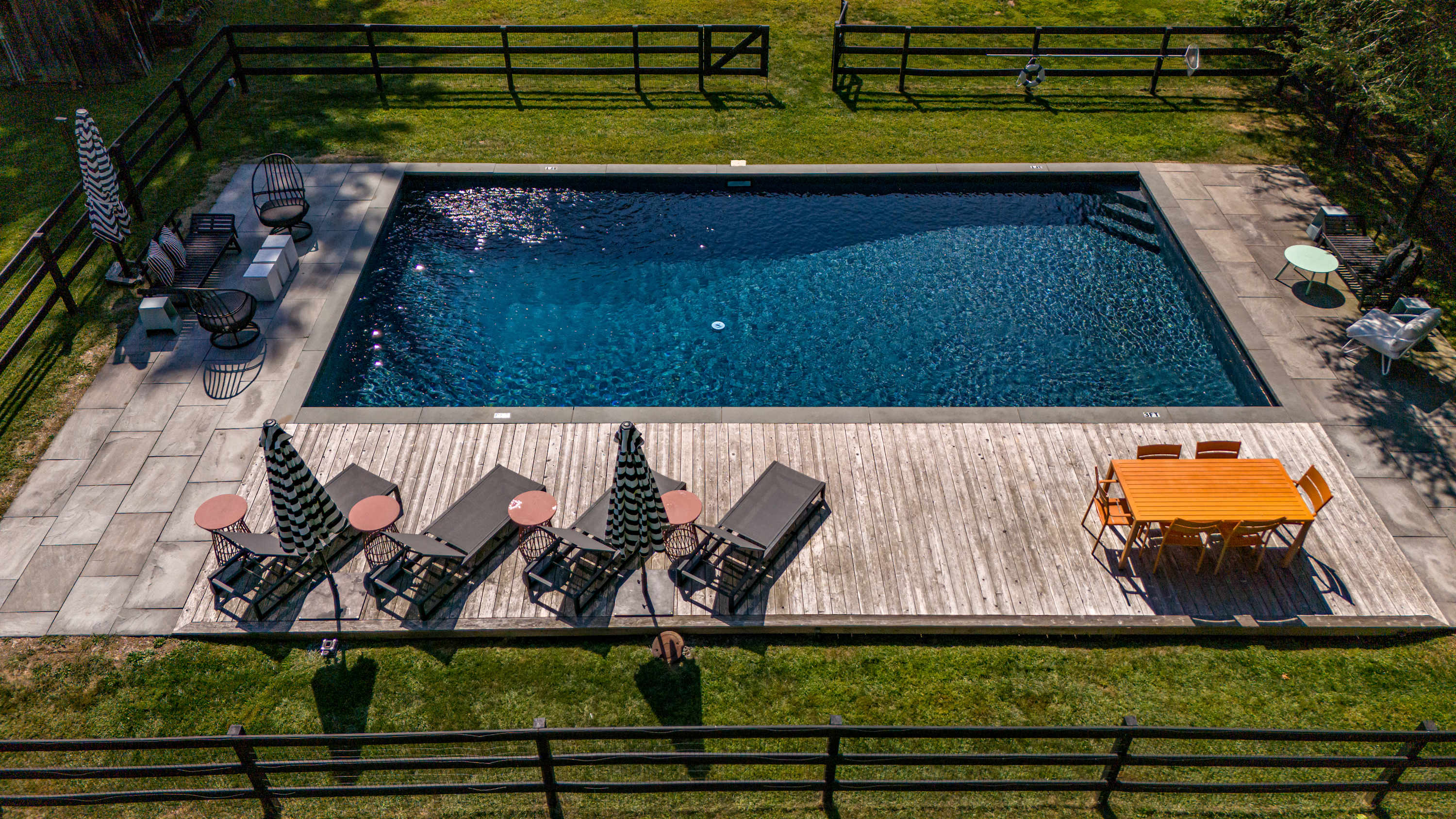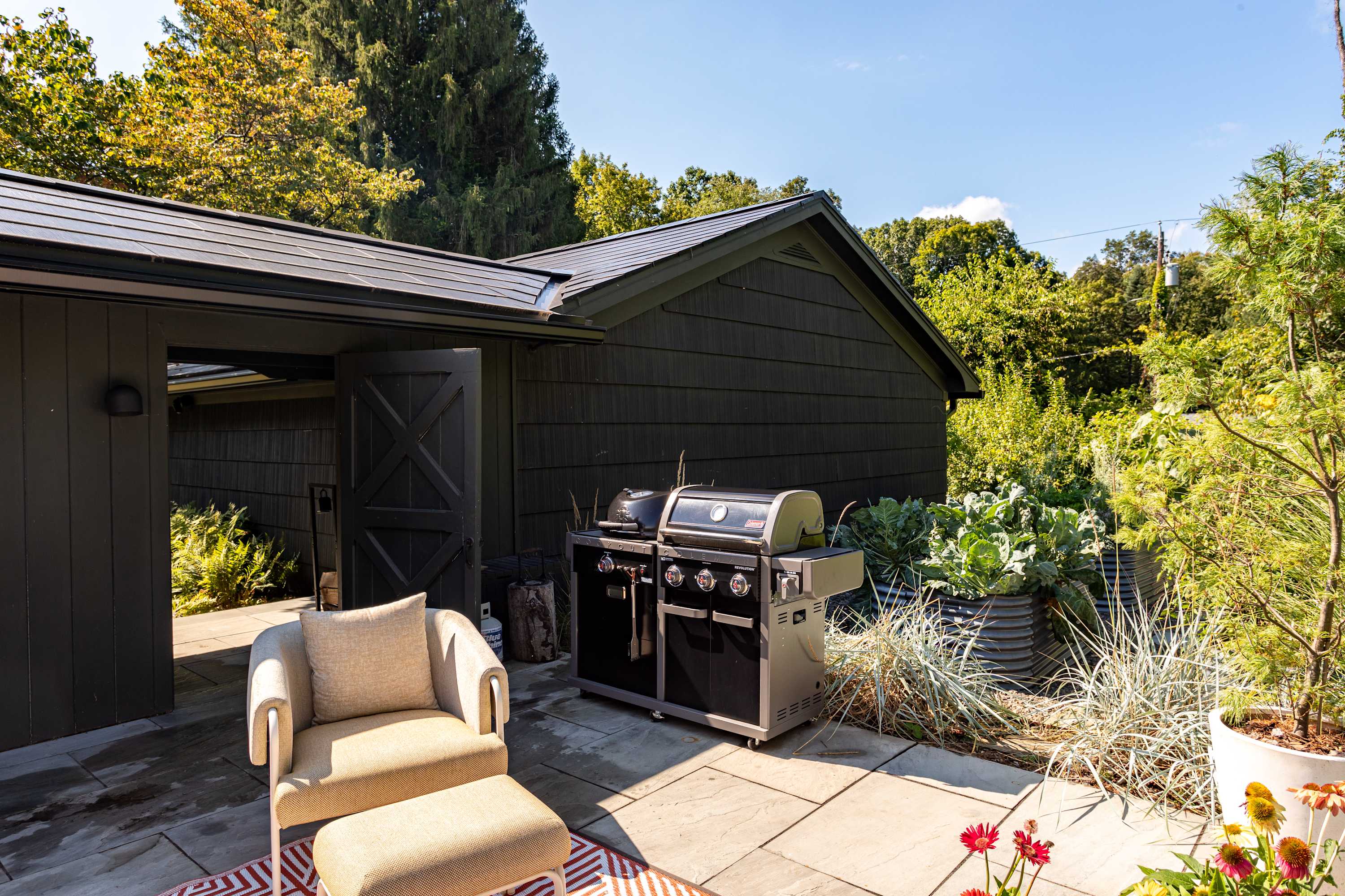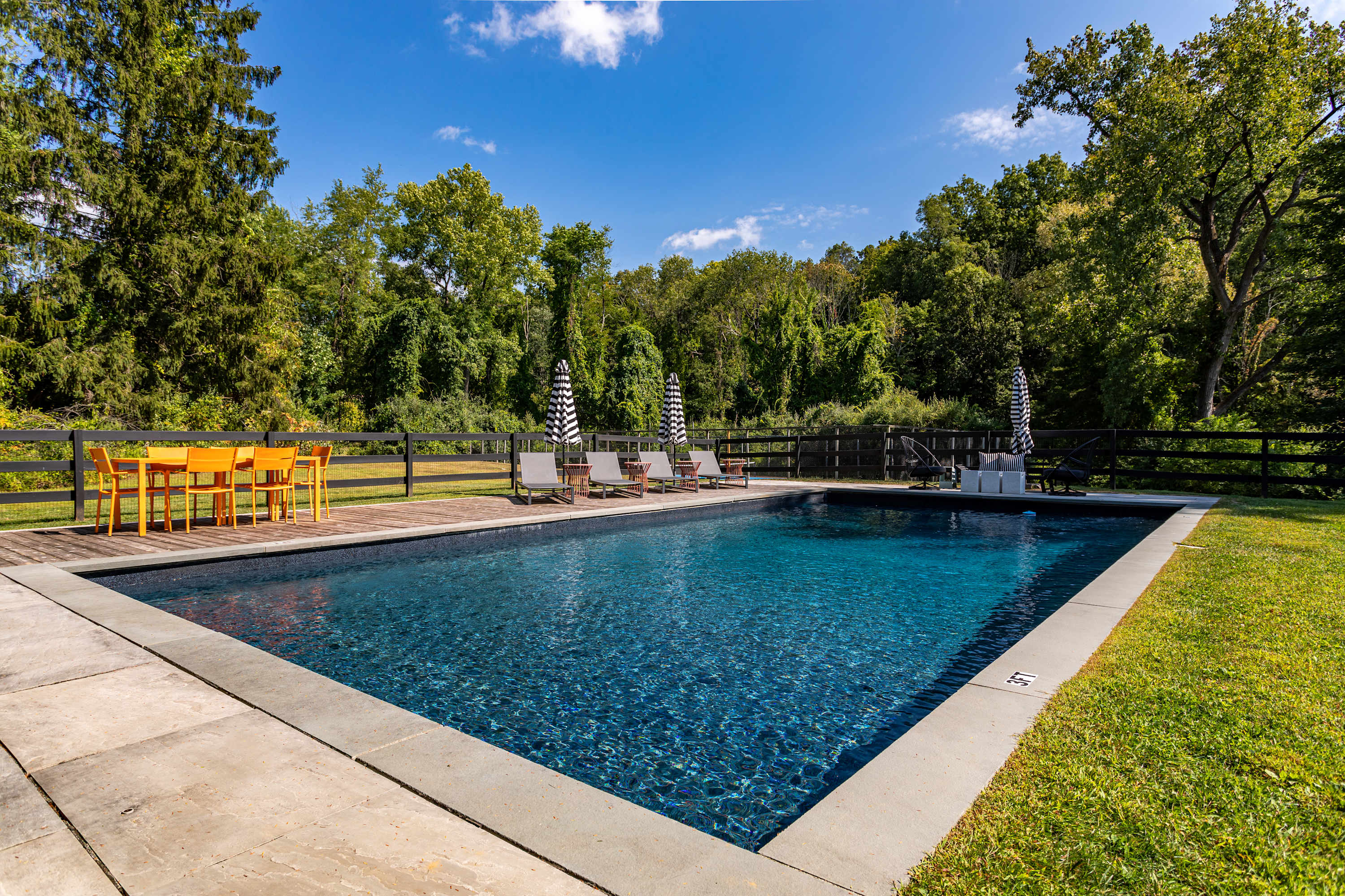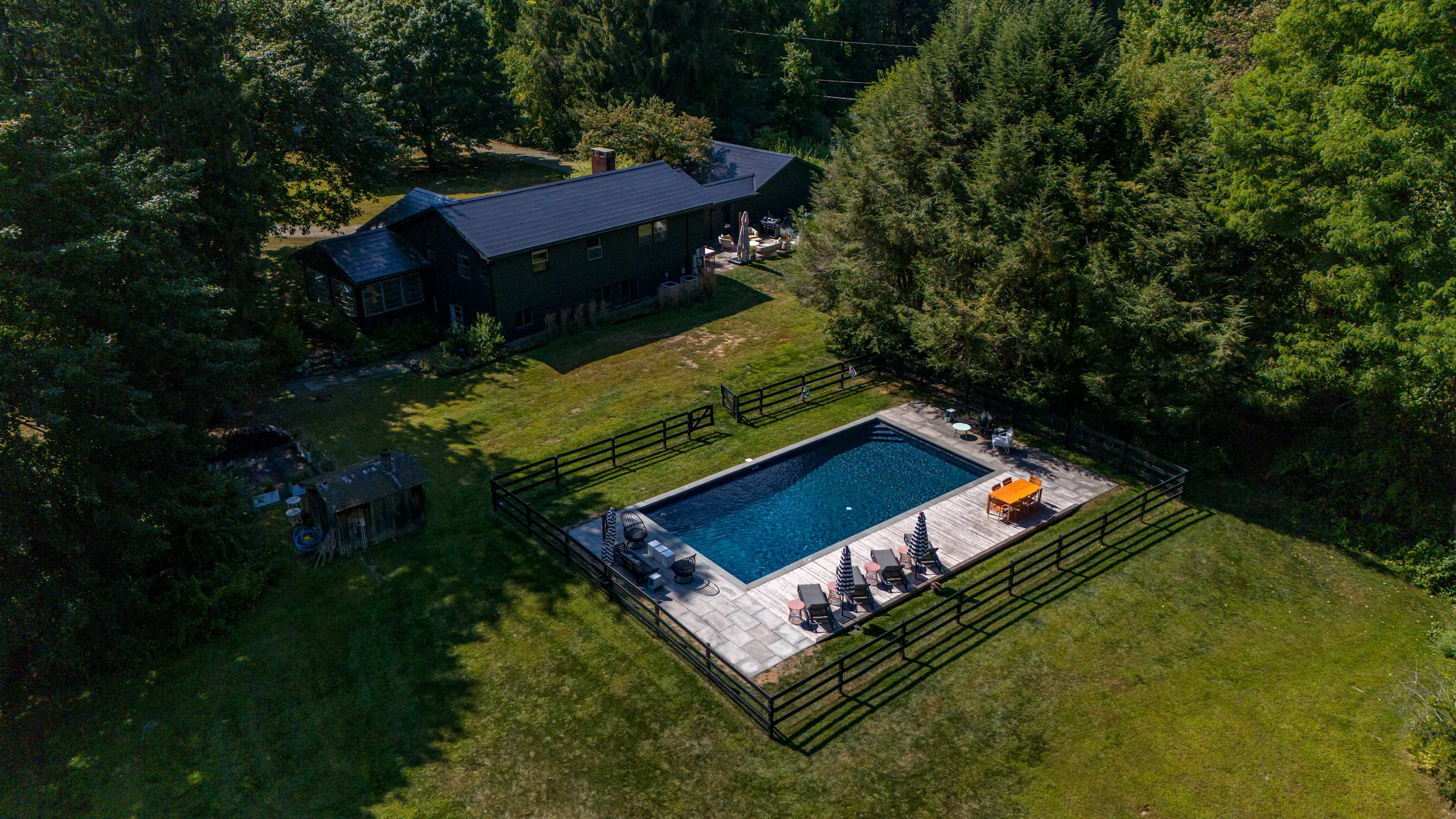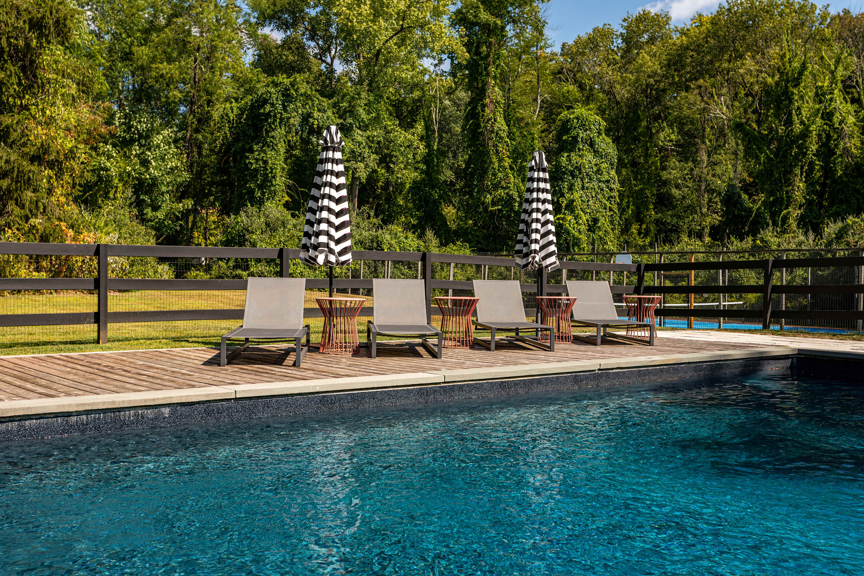The fenced-in pool area is a peaceful hangout spot complete with sunbeds, side tables and umbrellas, a dining table with chairs, and additional seating options. Nearby, the newly resurfaced tennis courts offer a great way to stay active—white-soled tennis shoes only, please. The patio and BBQ area include another dining table and lounge furniture, while raised garden beds produce fresh vegetables and herbs throughout the summer. A cozy outdoor fire pit with seating invites you to unwind, with additional seating areas scattered throughout the grounds for plenty of outdoor relaxation. THE POOL IS NOT HEATED.