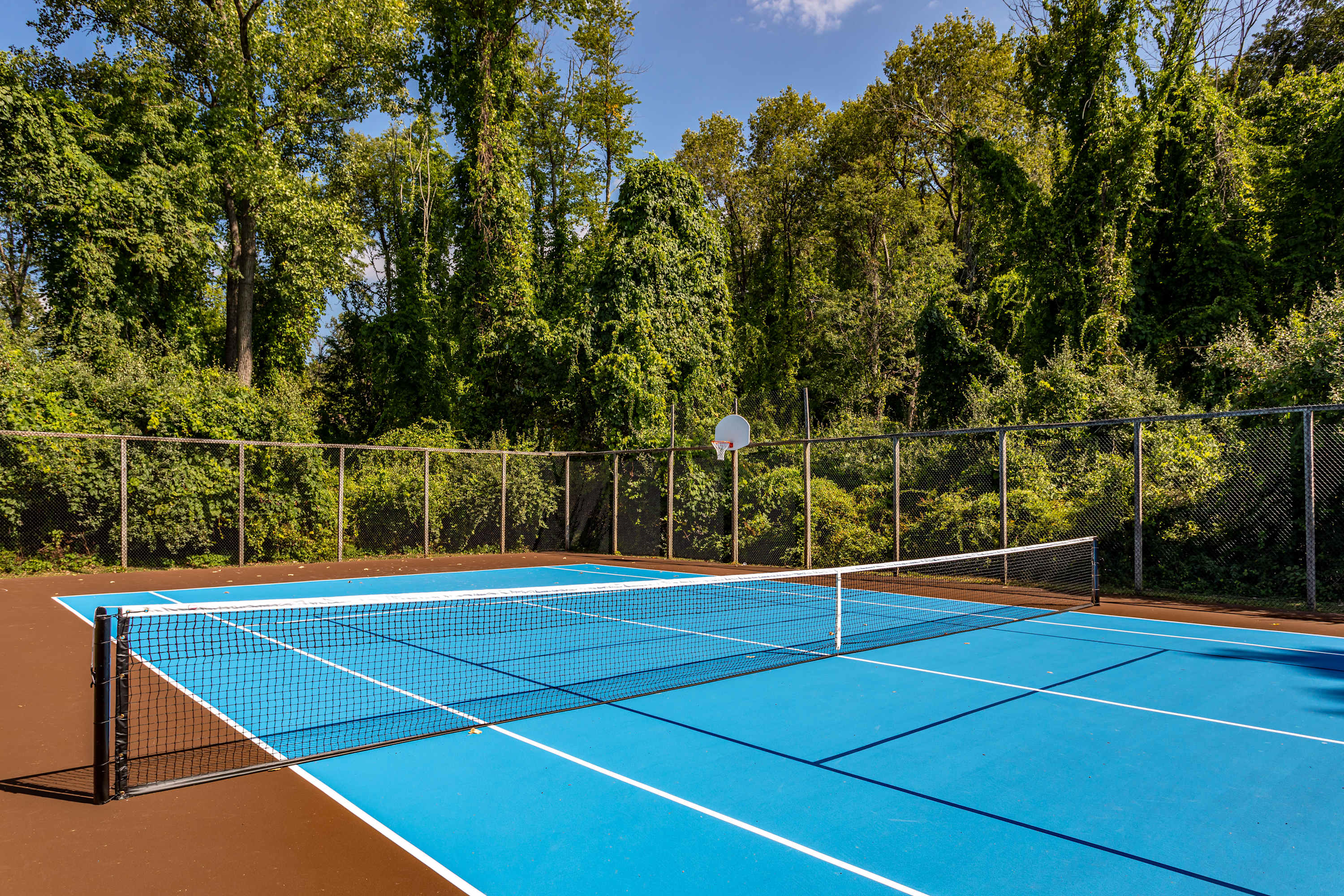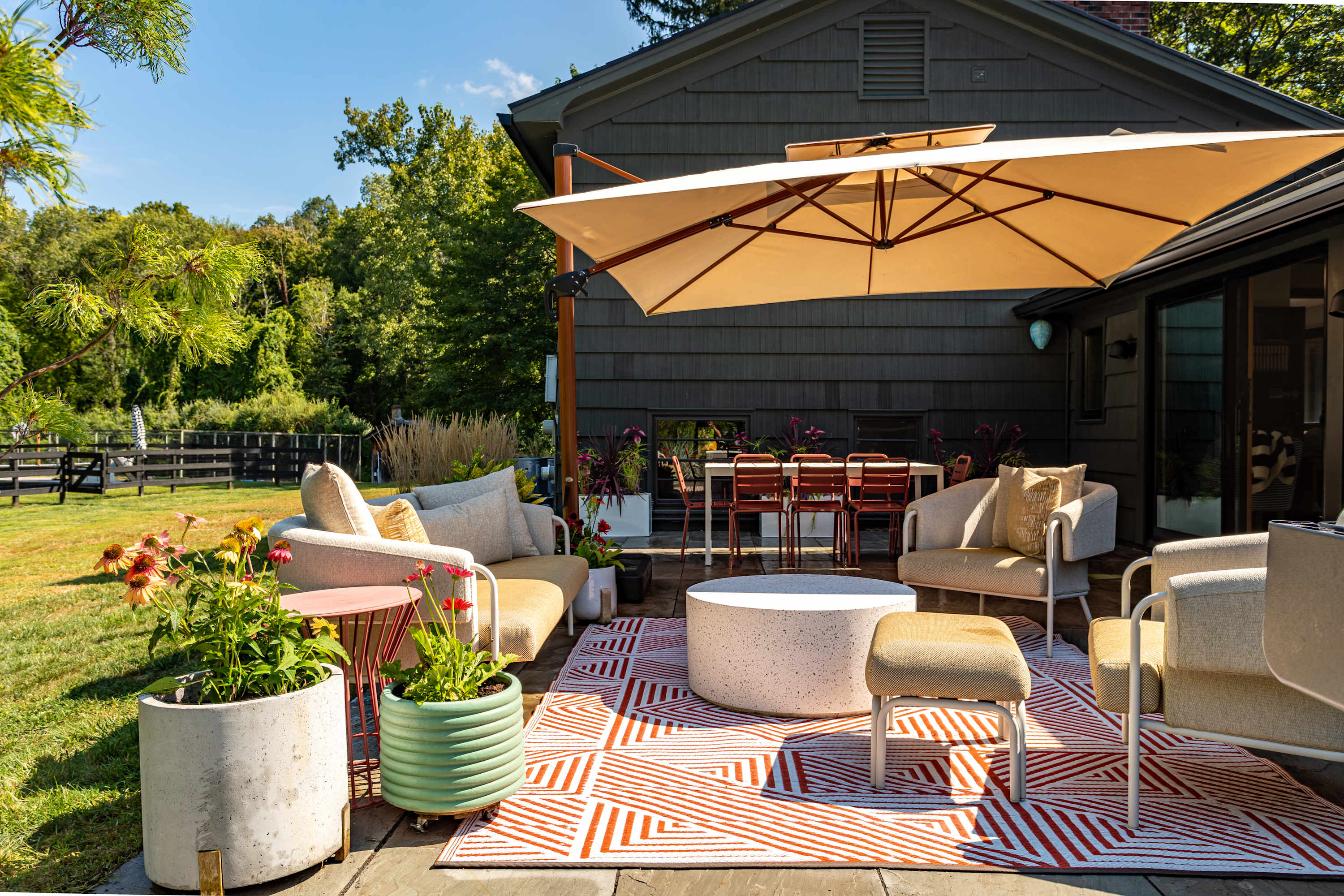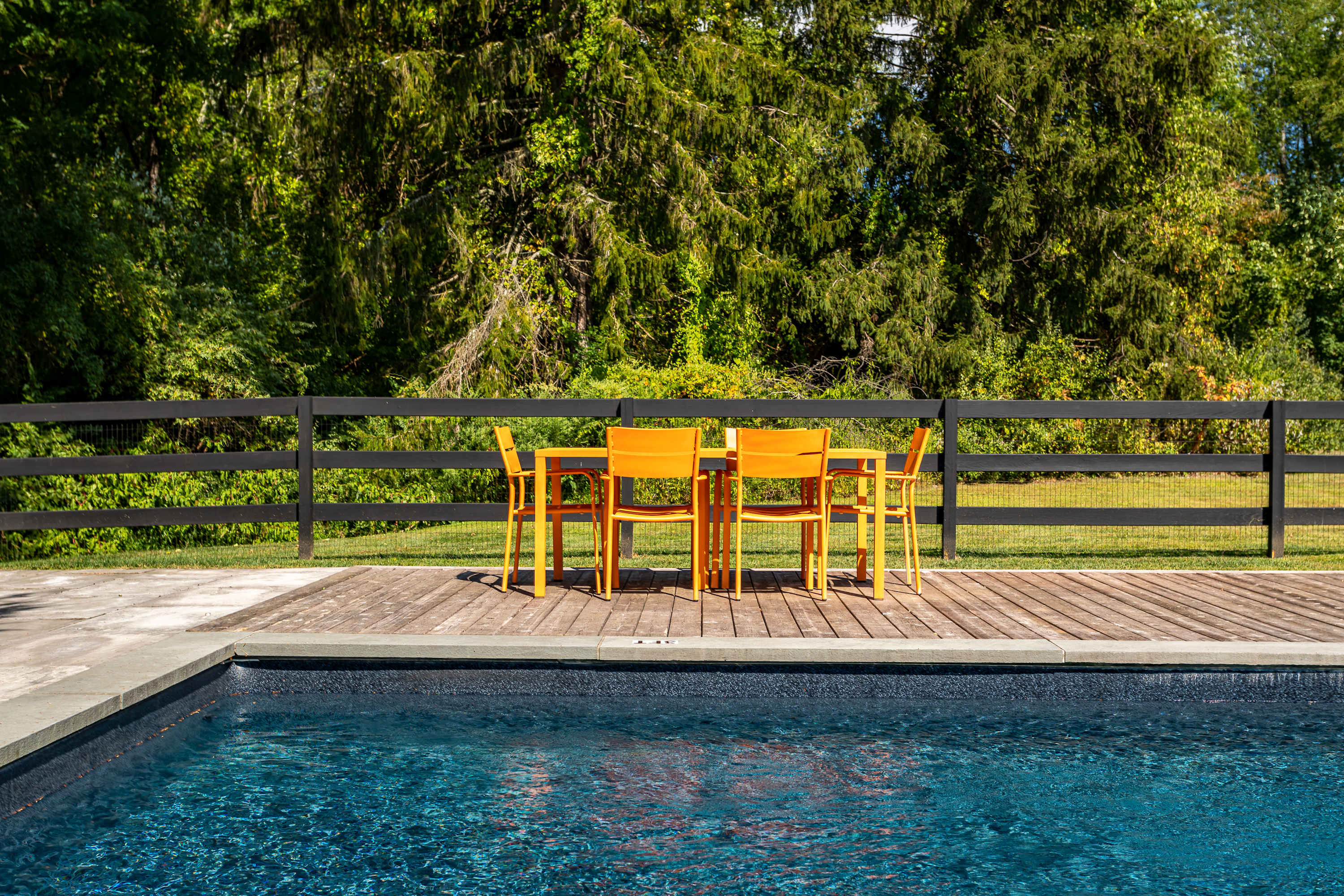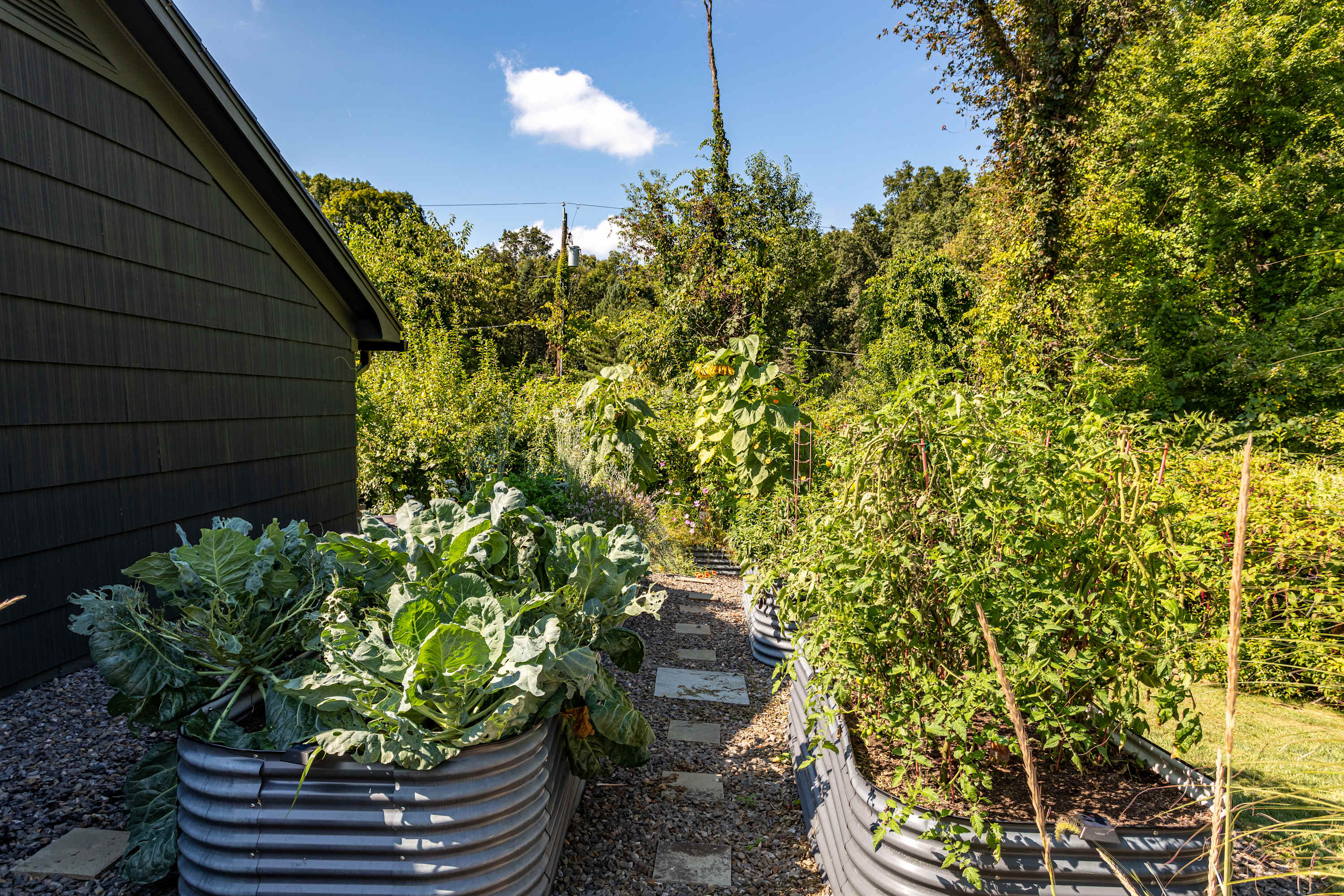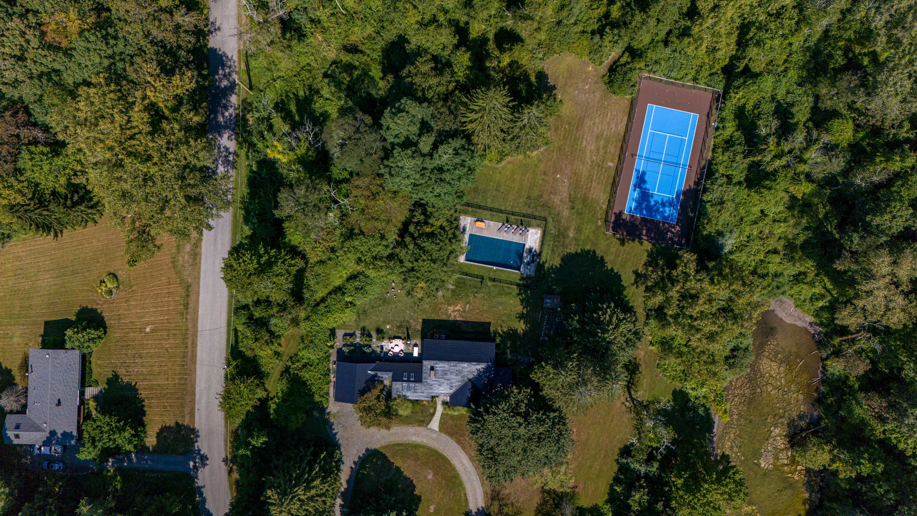 The fenced-in pool area is a peaceful hangout spot complete with sunbeds, side tables and umbrellas, a dining table with chairs, and additional seating options. Nearby, the newly resurfaced tennis courts offer a great way to stay active—white-soled tennis shoes only, please. The patio and BBQ area include another dining table and lounge furniture, while raised garden beds produce fresh vegetables and herbs throughout the summer. A cozy outdoor fire pit with seating invites you to unwind, with additional seating areas scattered throughout the grounds for plenty of outdoor relaxation. THE POOL IS NOT HEATED.