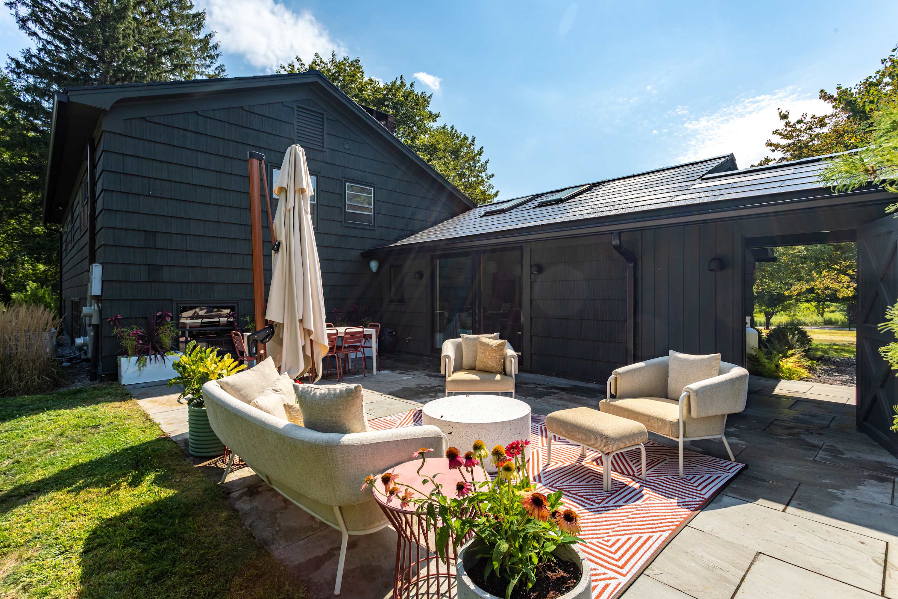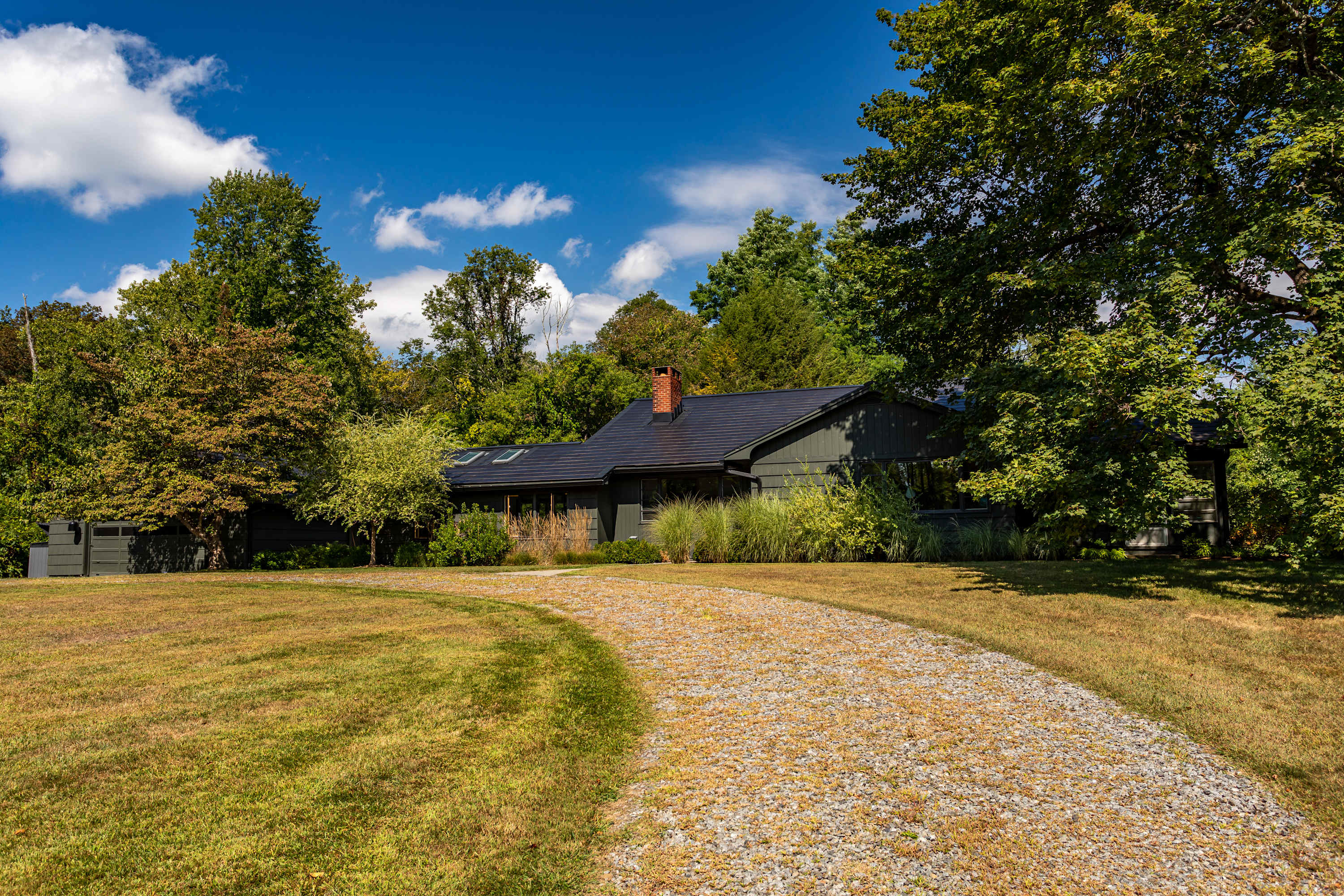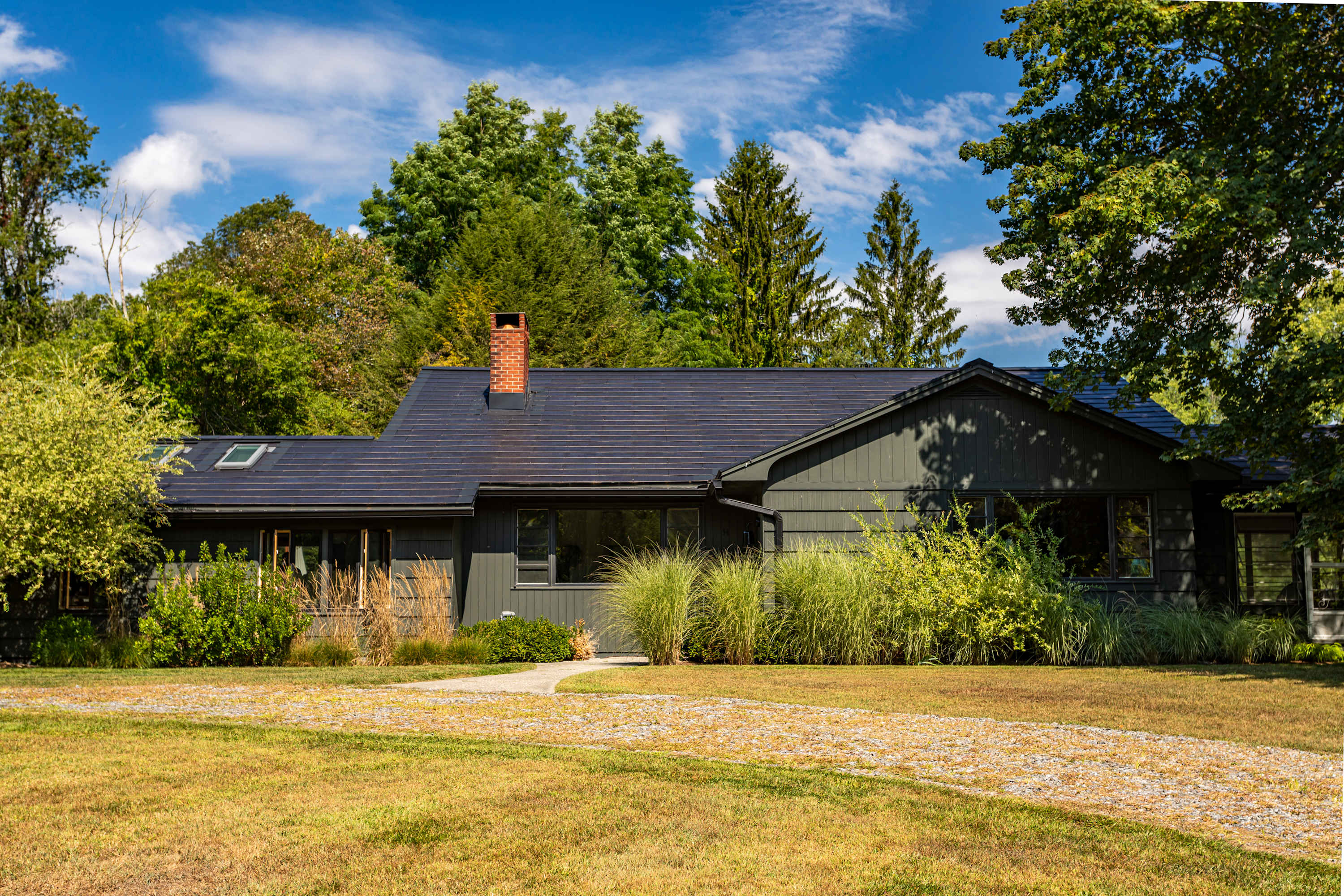 Harlem Valley Hideout is a tranquil mid century oasis that feels worlds away from the hustle and bustle. The circular driveway positions the home thoughtfully, offering a comfortable distance from the road and the captivating grounds have ample space for enjoying quality time with family and friends. The home is committed to sustainability, it is partially powered by the solar roof and uses plant-based and EWG-certified cleaning products for a healthier, eco-friendly living environment.