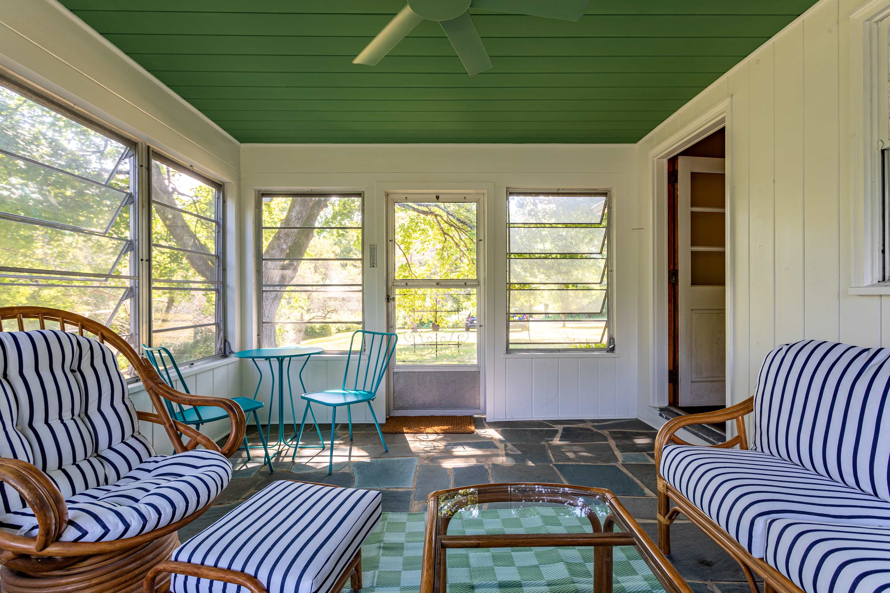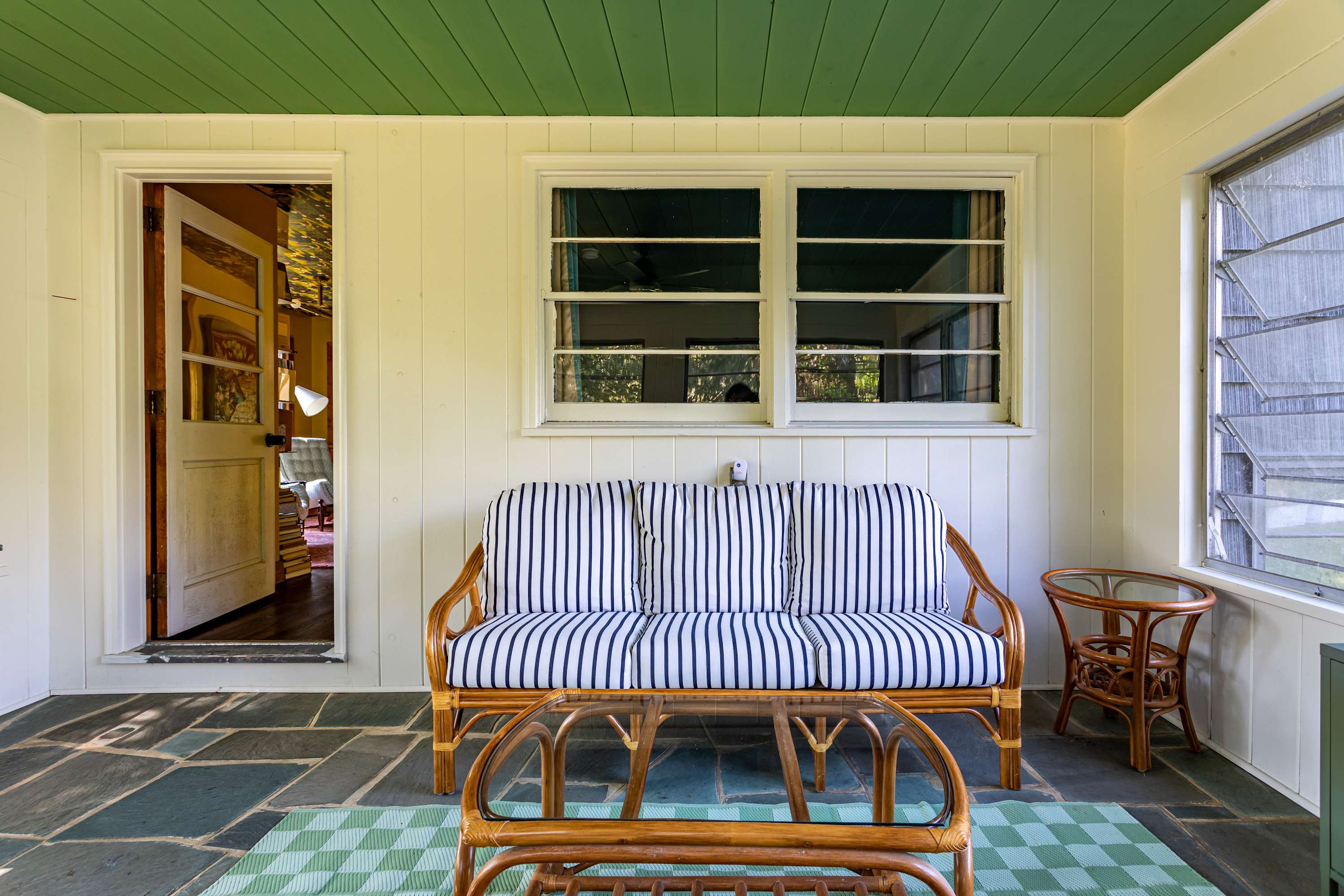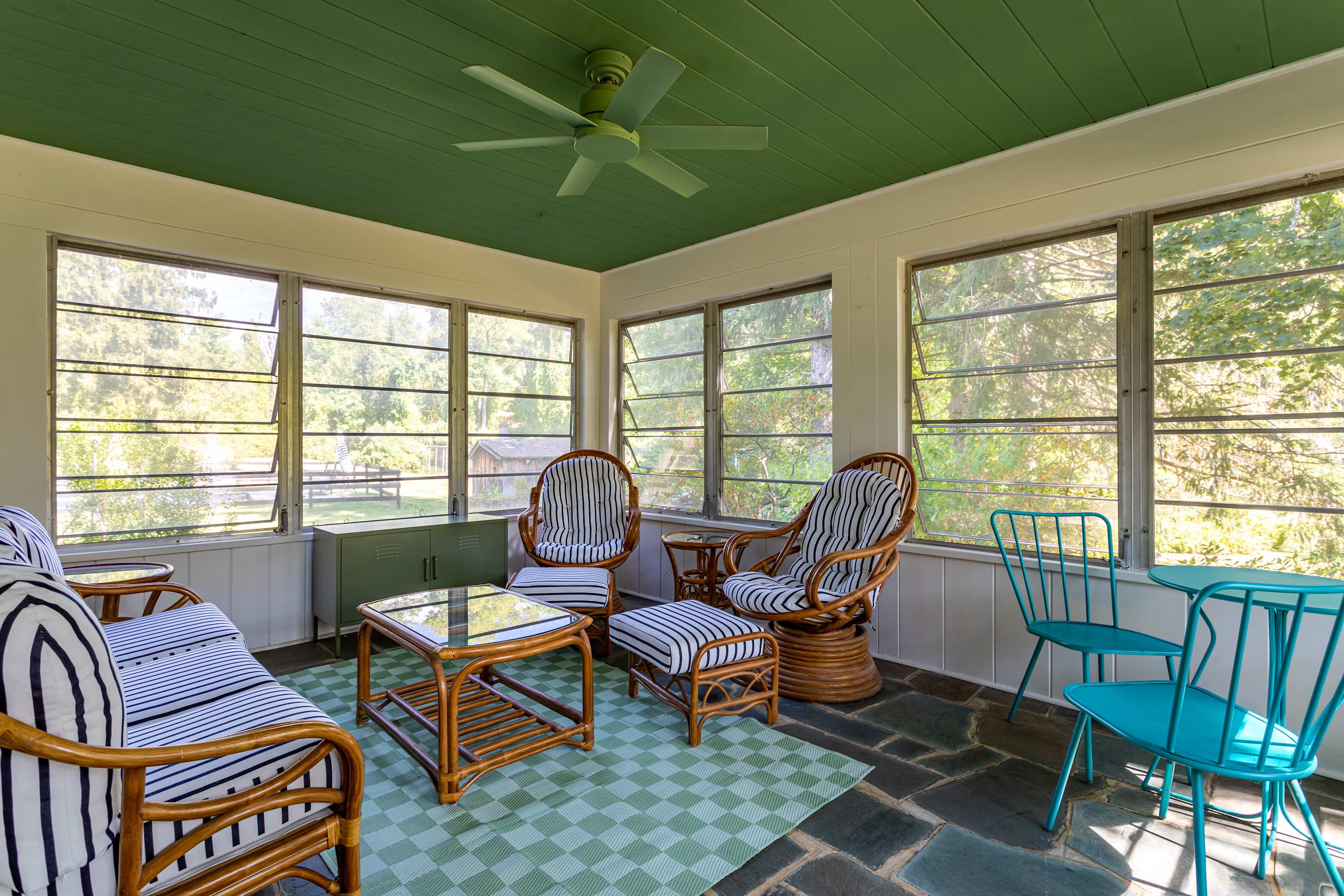 Upstairs, the primary bedroom offers a serene retreat complete with a renovated ensuite bathroom that retains its mid century charm. The queen bedroom, adorned with calming palm leaf wallpaper, evokes a vintage Polynesian vibe and shares a bathroom with the nursery. The nursery features a crib, rainbow hues and an assortment of books and toys. Each bathroom throughout the home embraces bold colors and playful patterns characteristic of 1950s bathroom design, adding a fun and vibrant touch.