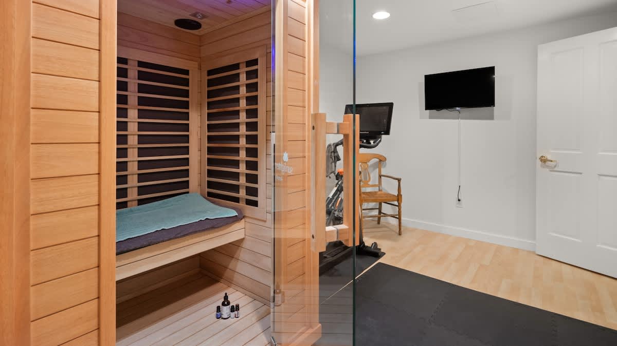 Discover luxury in nature at Haven in the Hollow. This 8-guest home offers serene views of nature, a swimmable pond w/ patio, hot tub, outdoor shower, wood-burning fireplace, gym, sauna, SmartTV, and basement den. Fully equipped kitchen with espresso machine and wet bar.