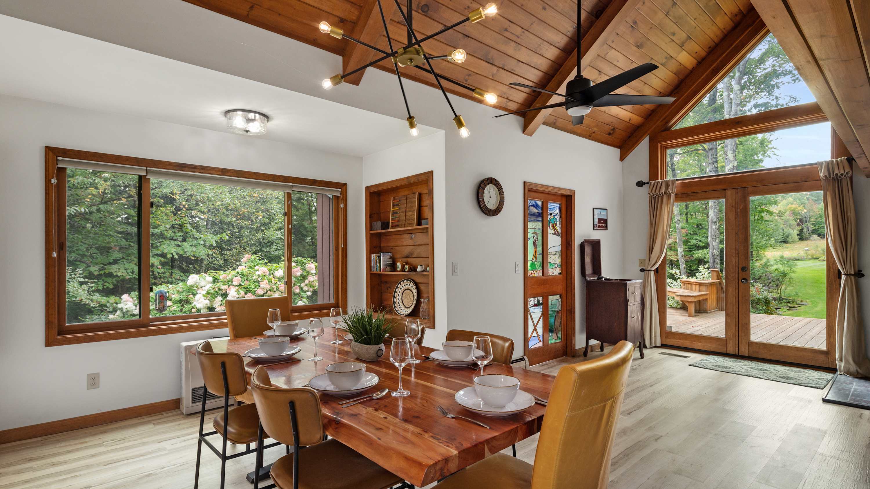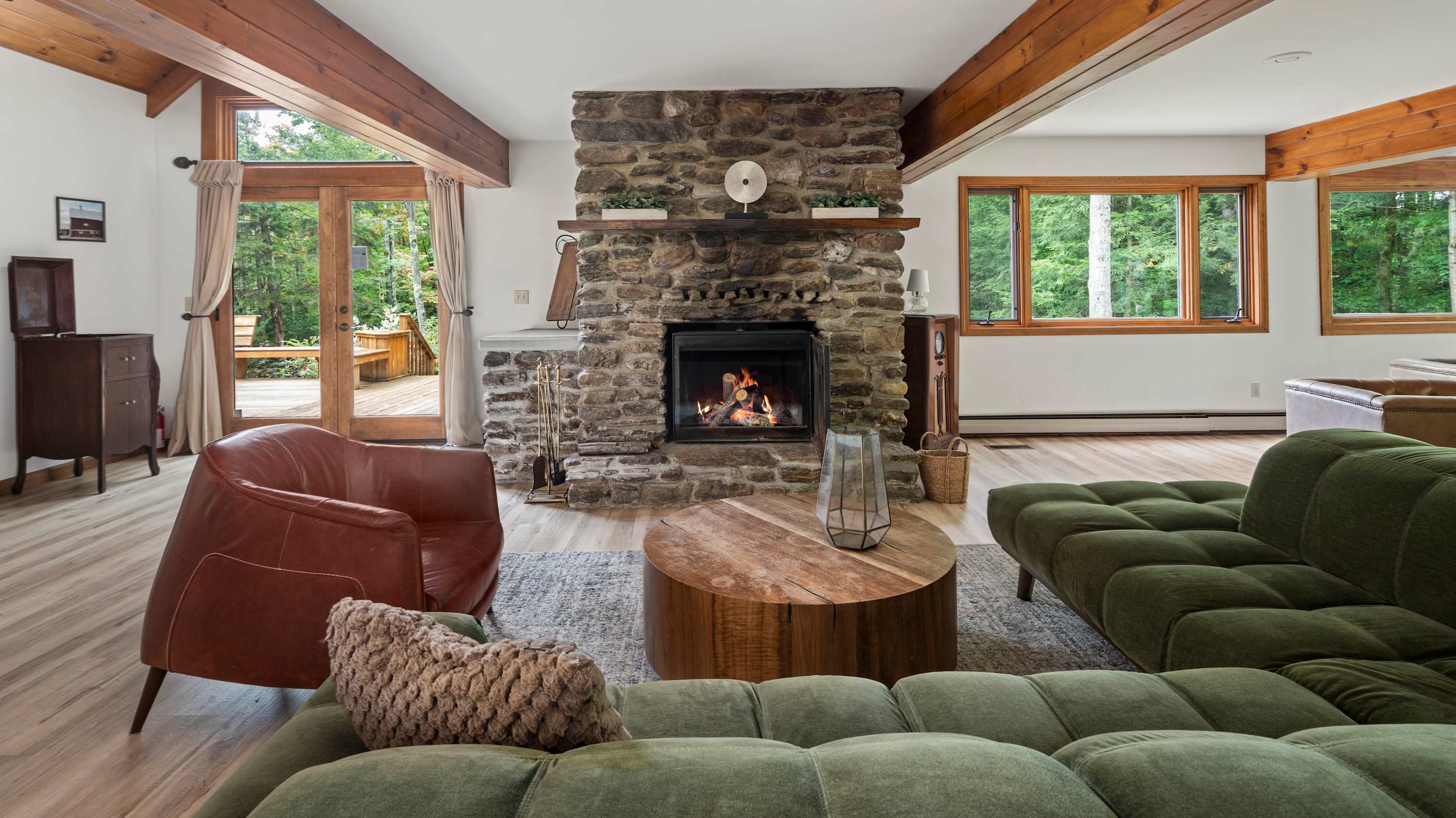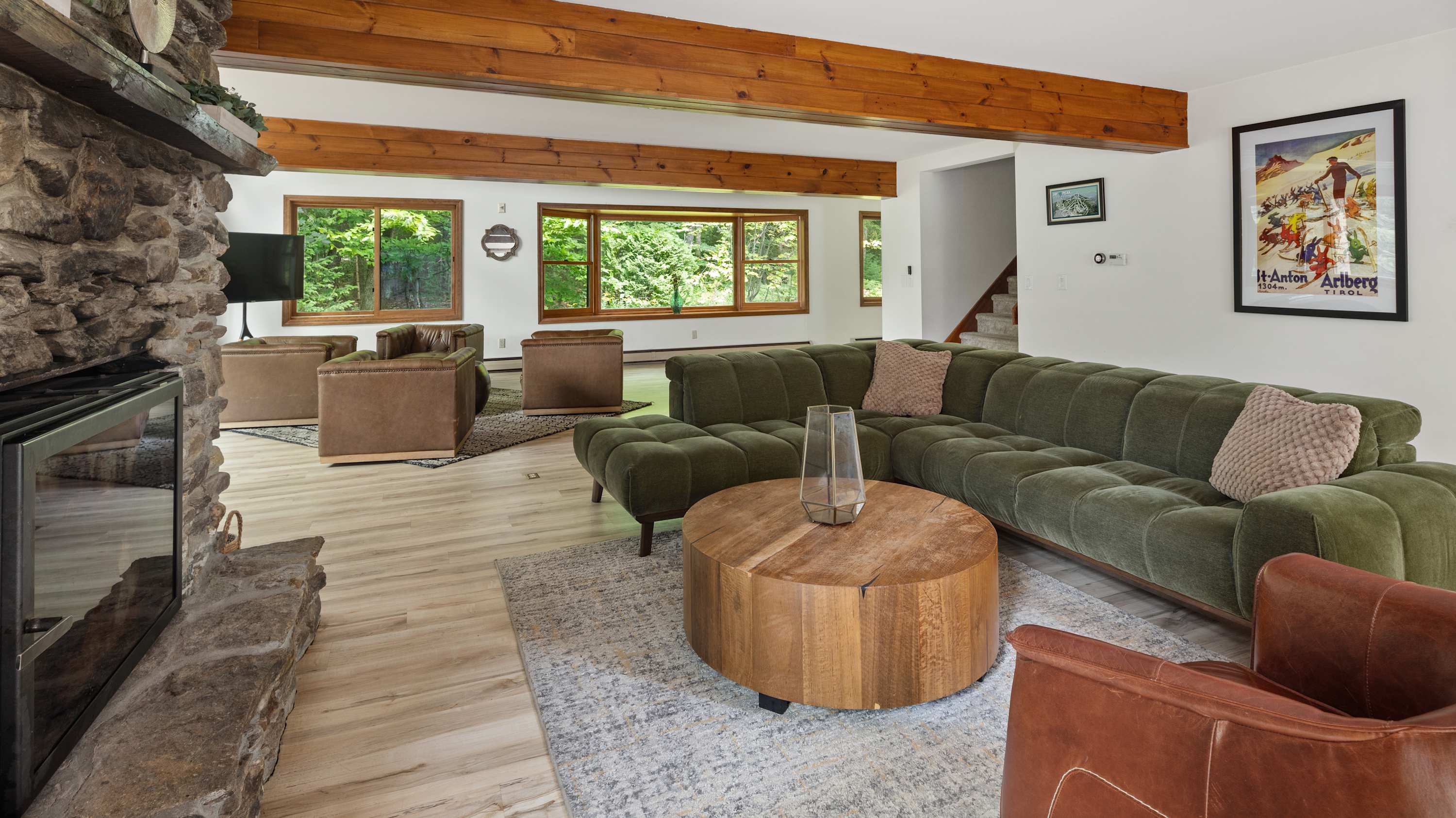 The main level boasts expansive wood-beamed ceilings, light hardwood floors, and an abundance of natural light streaming through large windows. The design combines rustic charm with modern elegance, featuring a plush velvet sectional in front of the wood-burning fireplace and sleek, mid-century-inspired dining chairs around a stunning live-edge table. A second dining area, complete with leather club chairs, invites you to share stories and wine late into the night.