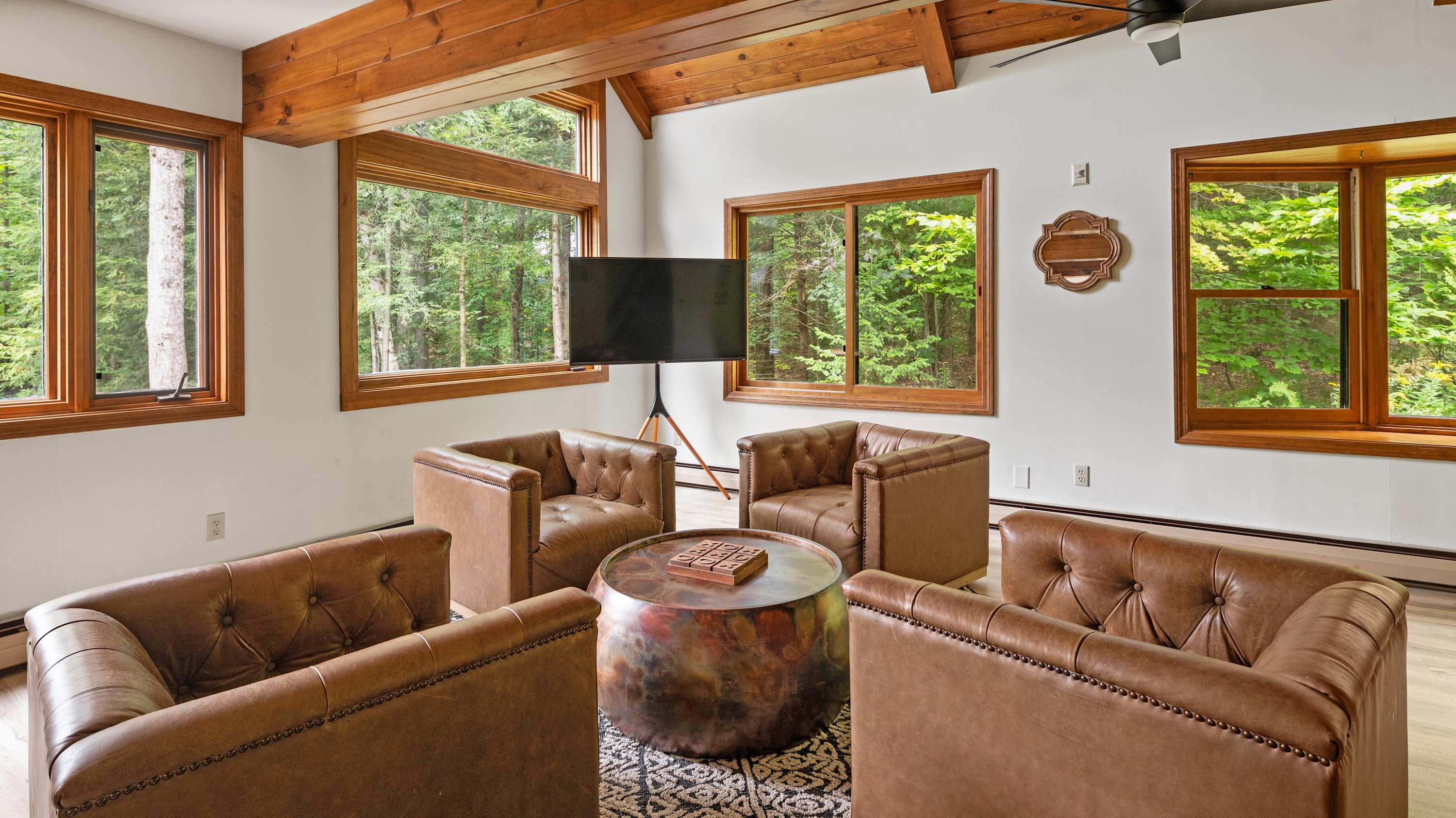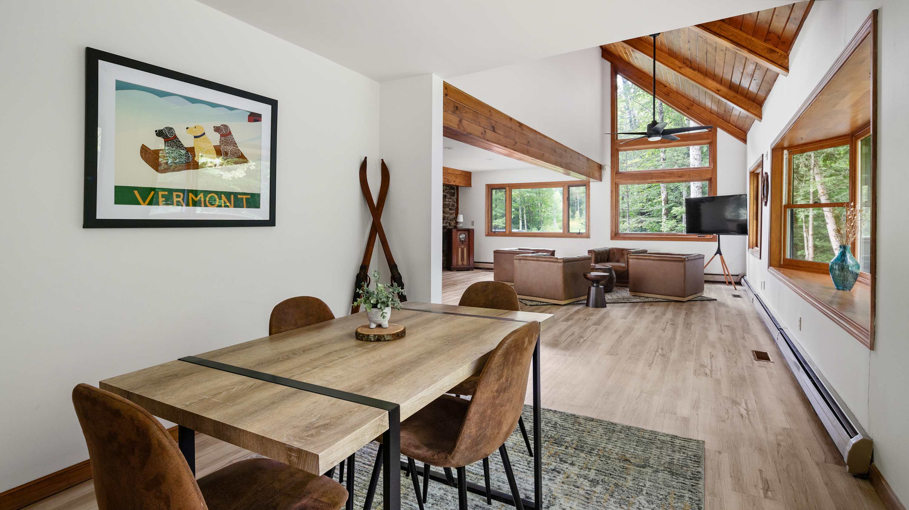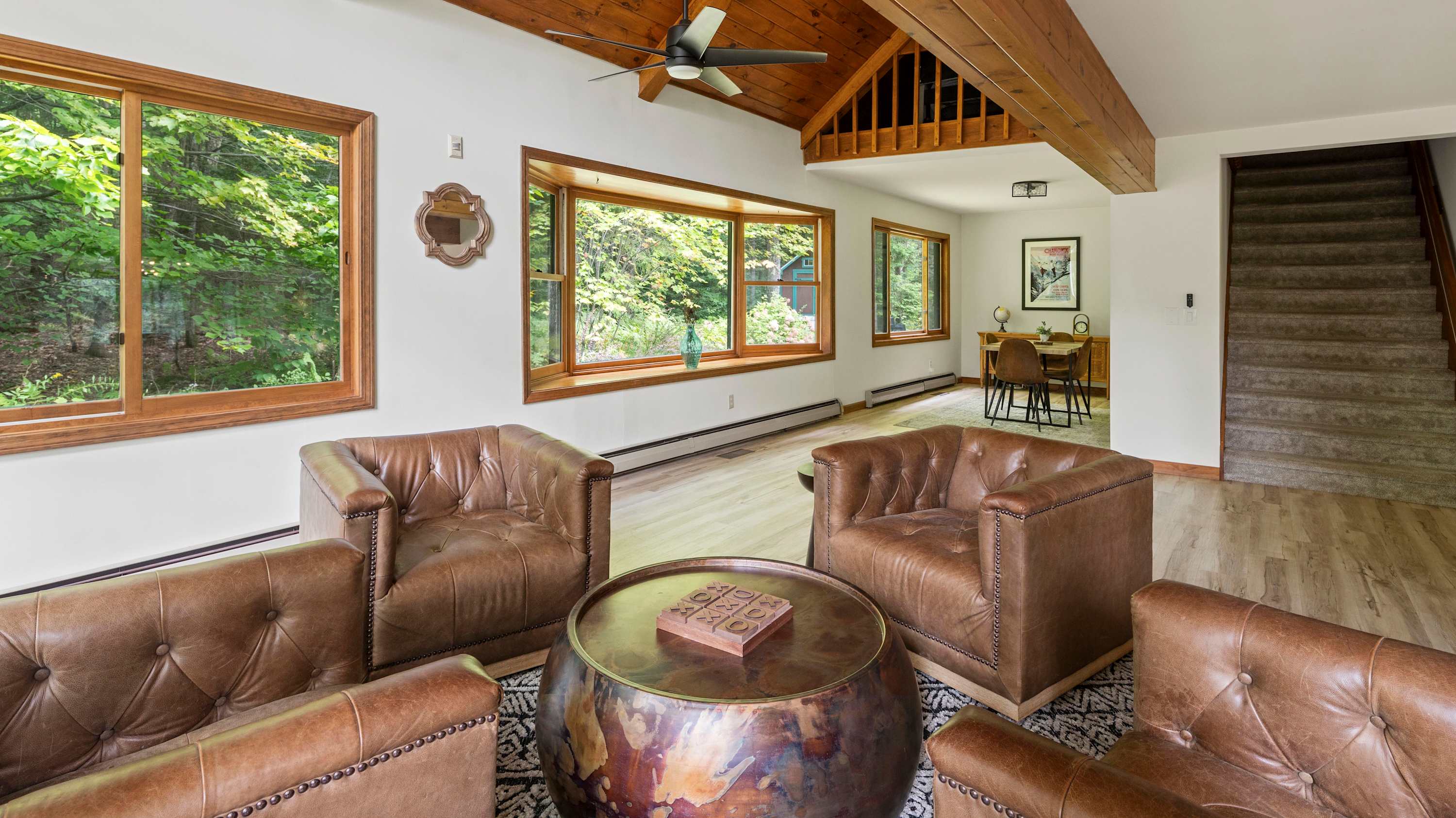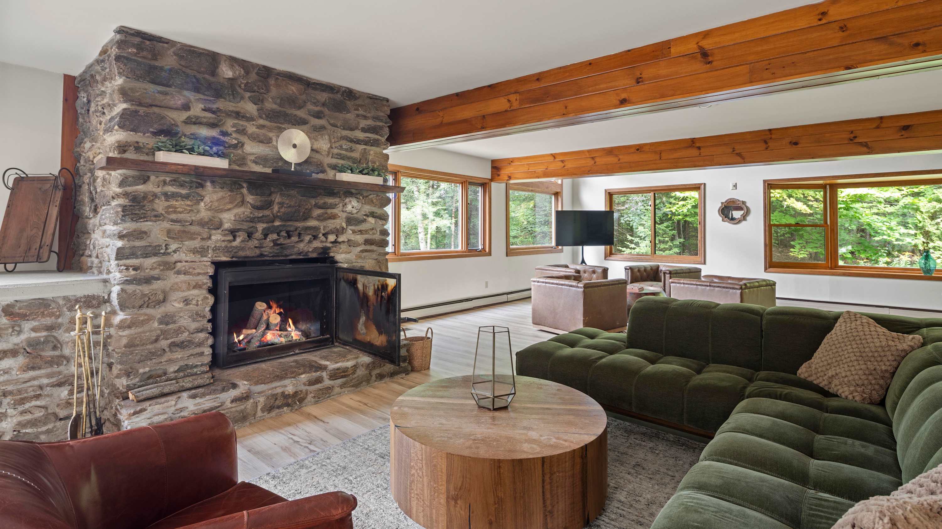 The main level boasts expansive wood-beamed ceilings, light hardwood floors, and an abundance of natural light streaming through large windows. The design combines rustic charm with modern elegance, featuring a plush velvet sectional in front of the wood-burning fireplace and sleek, mid-century-inspired dining chairs around a stunning live-edge table. A second dining area, complete with leather club chairs, invites you to share stories and wine late into the night.