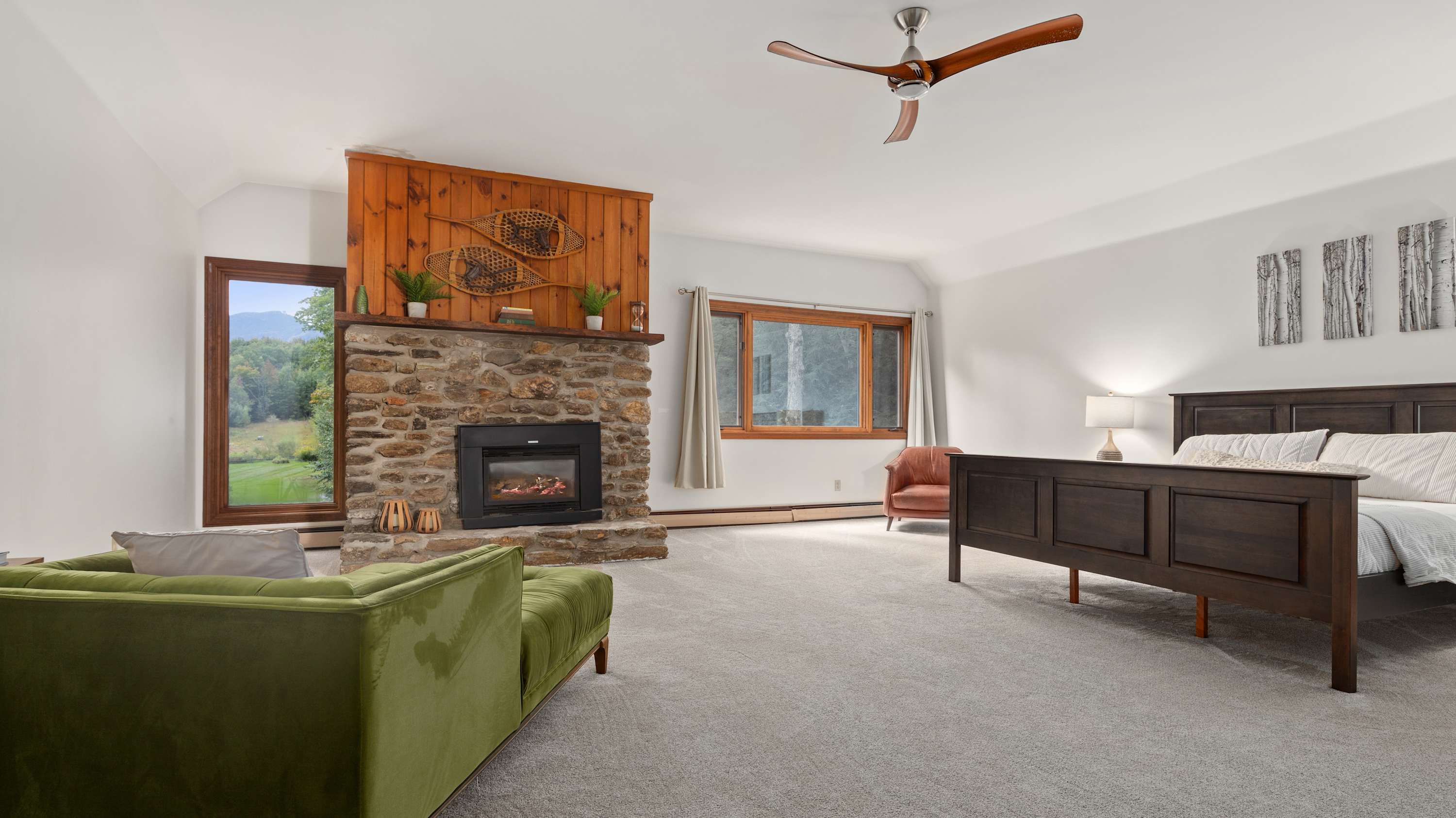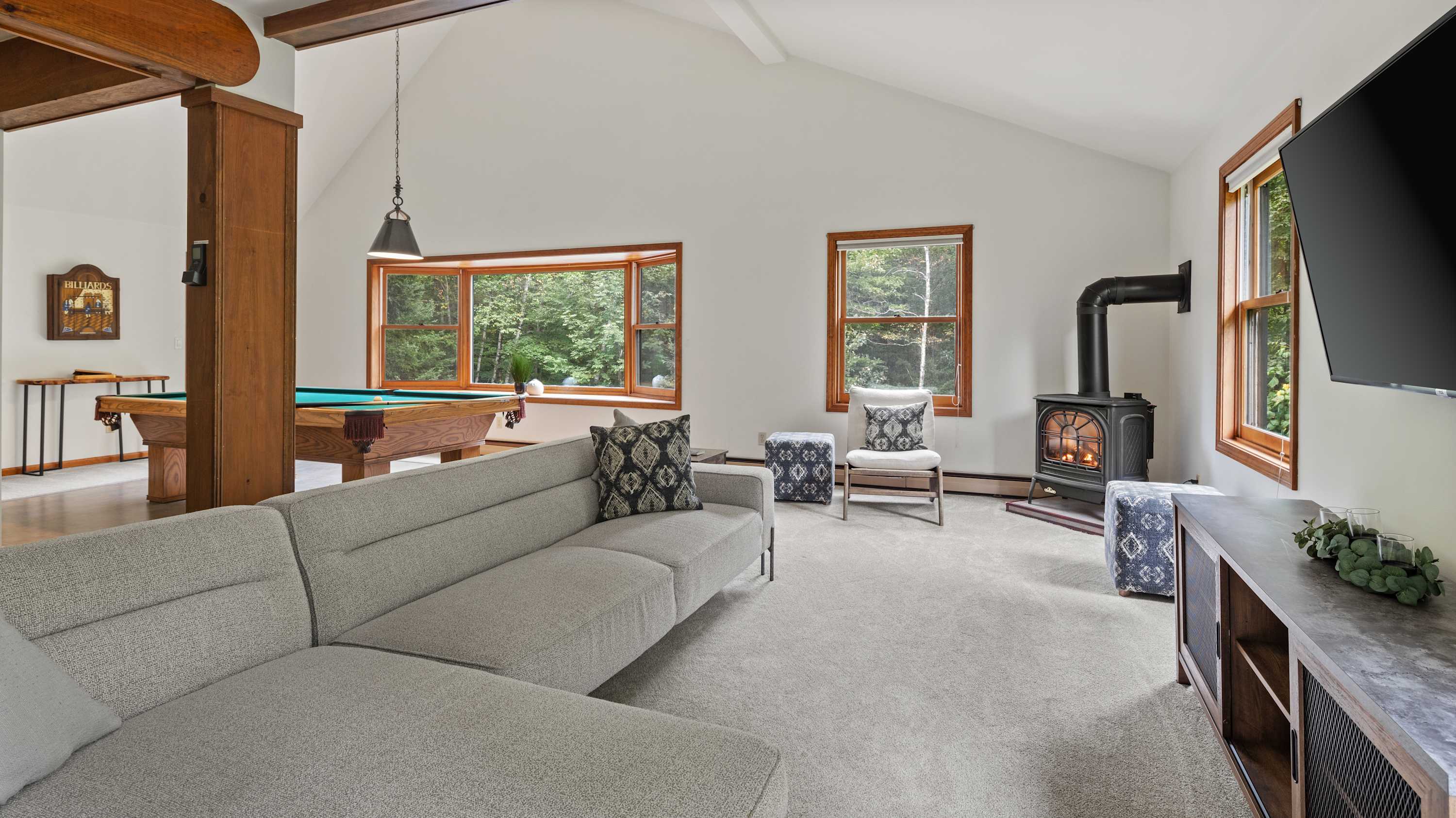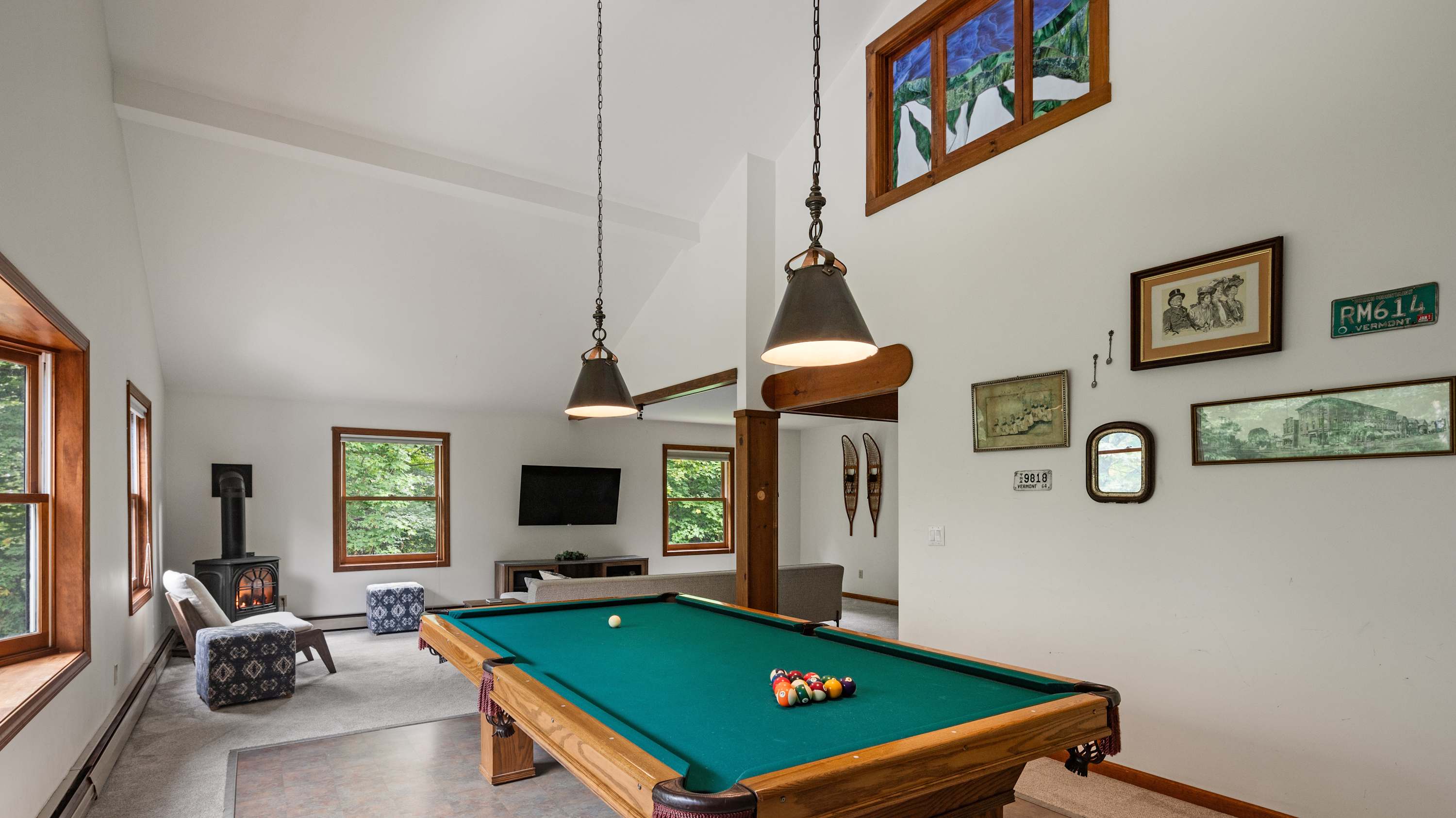 Upstairs, three more bedrooms await, including a luxurious main suite with an incredible view of Jay Peak. Cozy up in front of the stone gas fireplace, unwind in the velvet lounge chair in the privacy of your room, watch a movie on the SmartTV, or enjoy the en suite bathroom with a soaking tub and spacious walk-in shower. Across the hall you'll find two more bedrooms one with a King bed and SmartTV and the other with a Queen bed and cozy reading nook. Each sharing a spacious guest bath with glass walk in shower and separate tub. The second level also offers a second living area with a massive sectional, gas wood stove, pool table, board games, and a SmartTV for complete entertainment. A whimsical loft space with a play area and additional sleeping quarters makes this floor perfect for families.