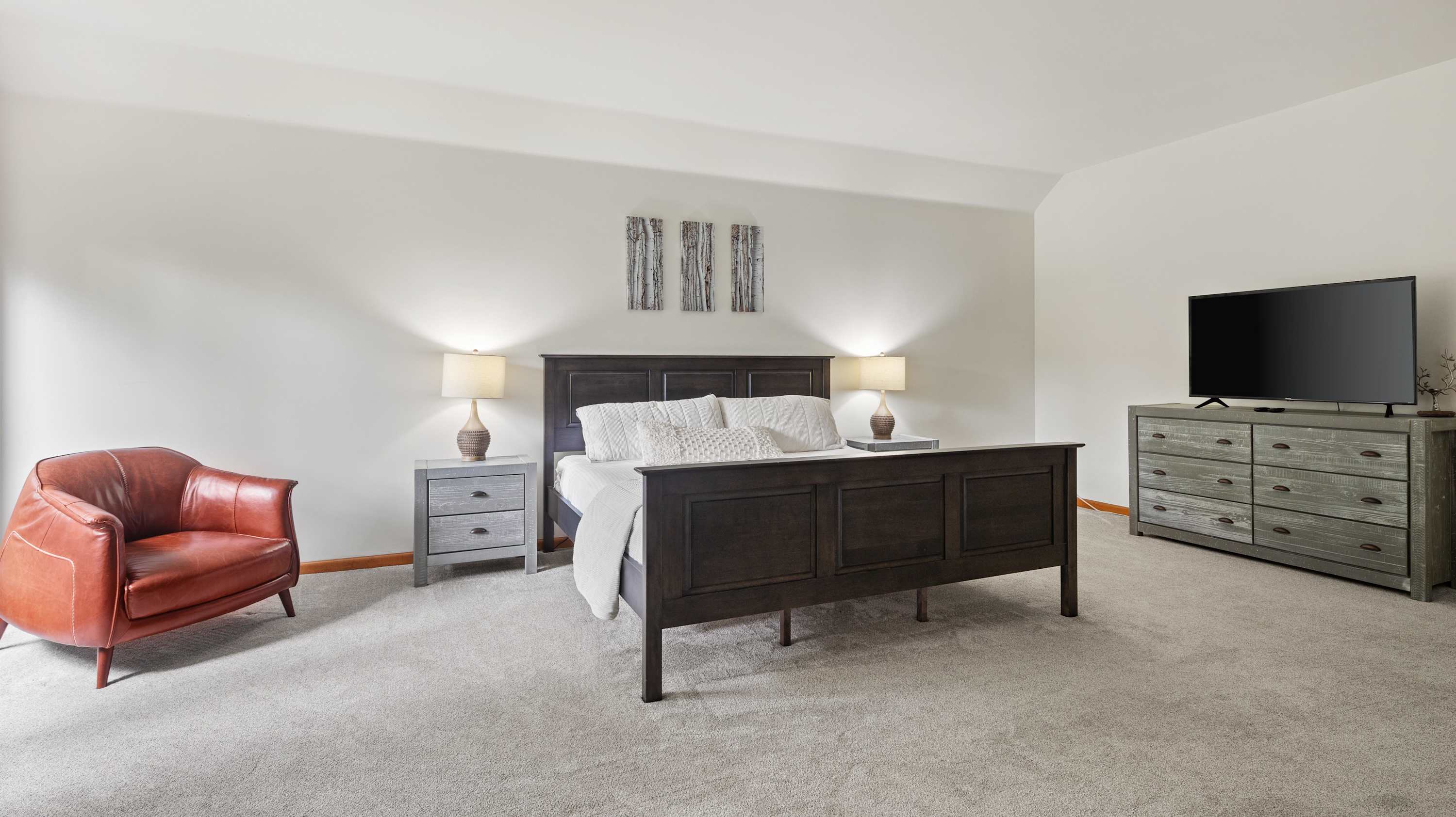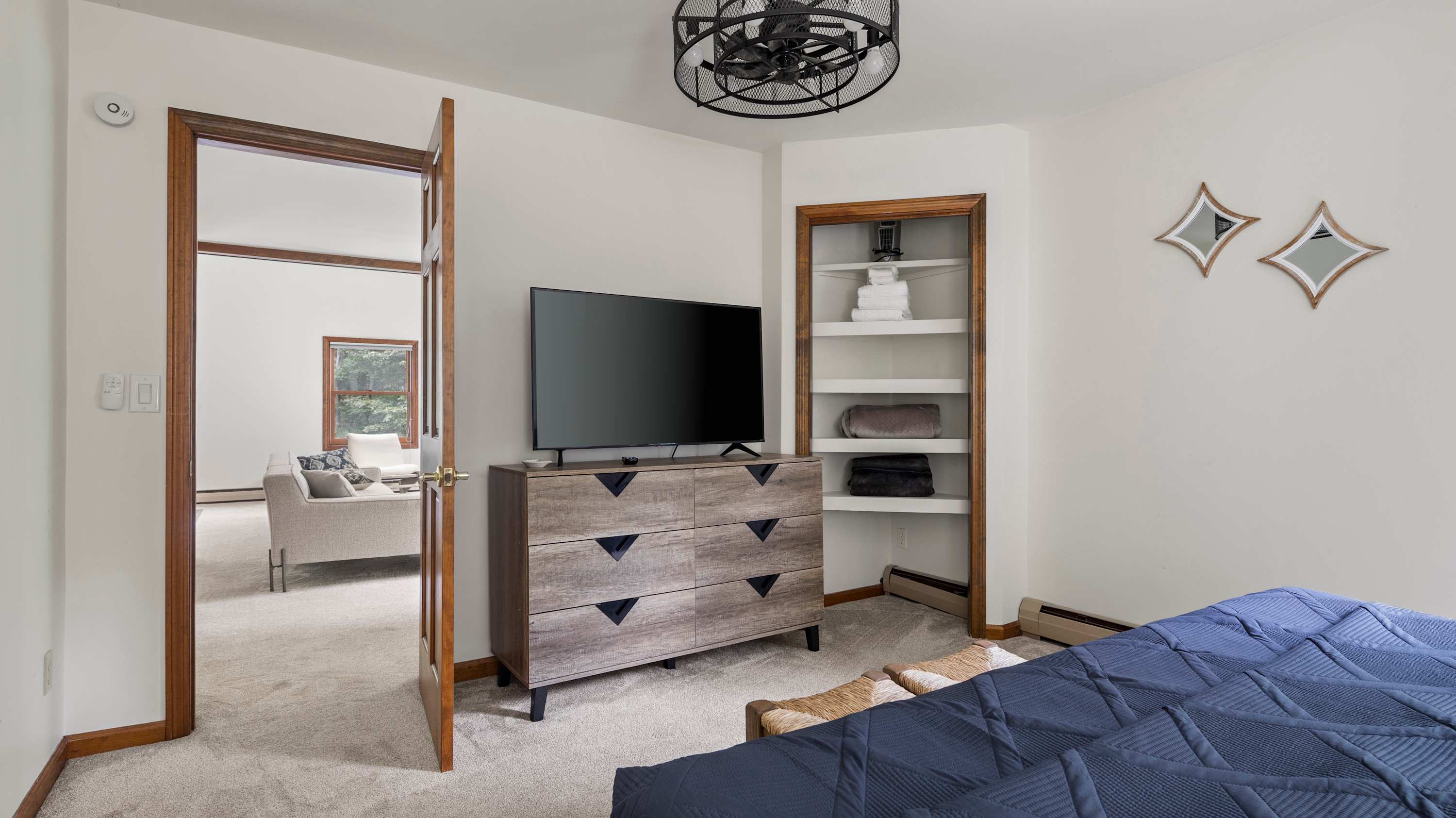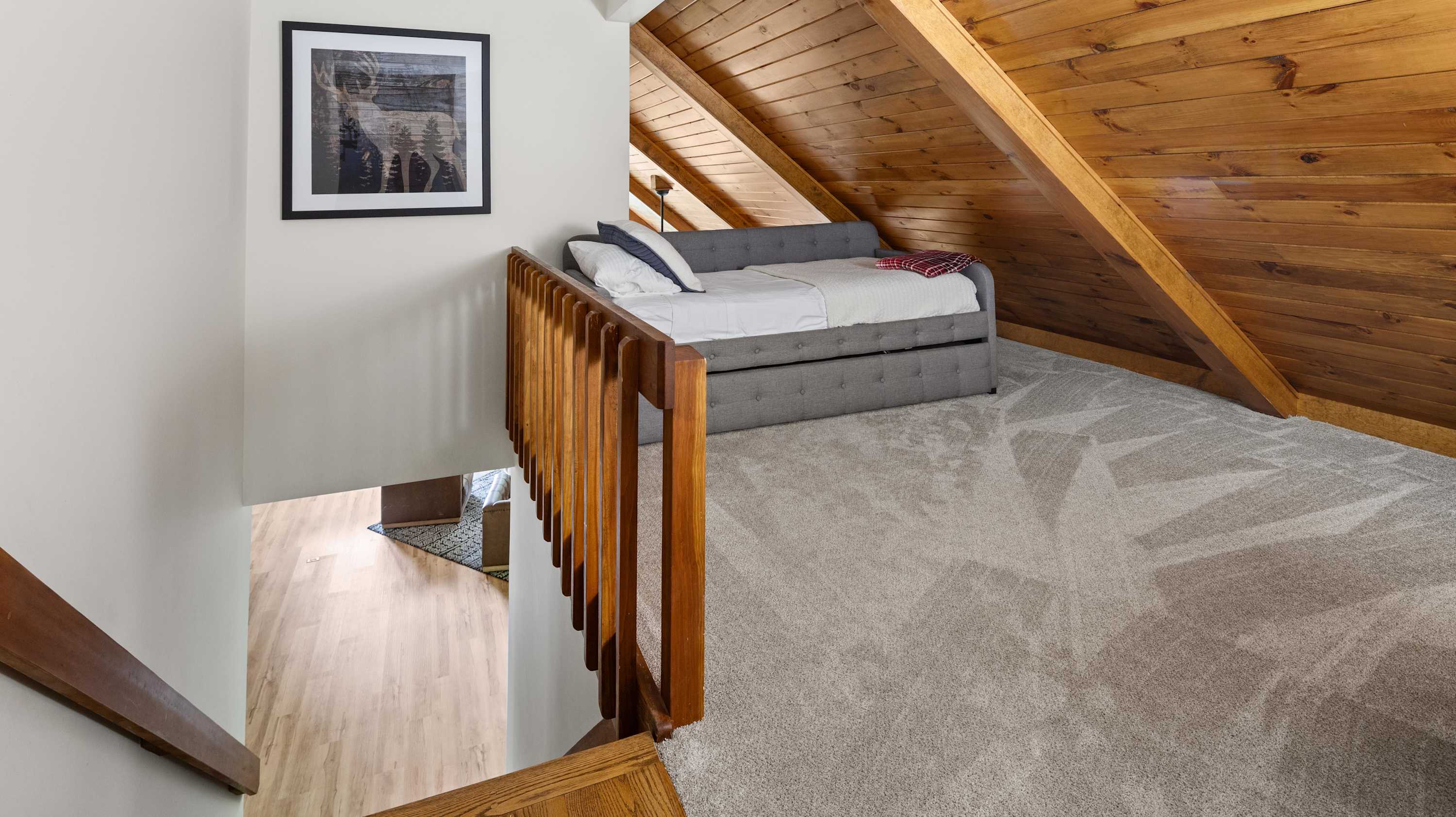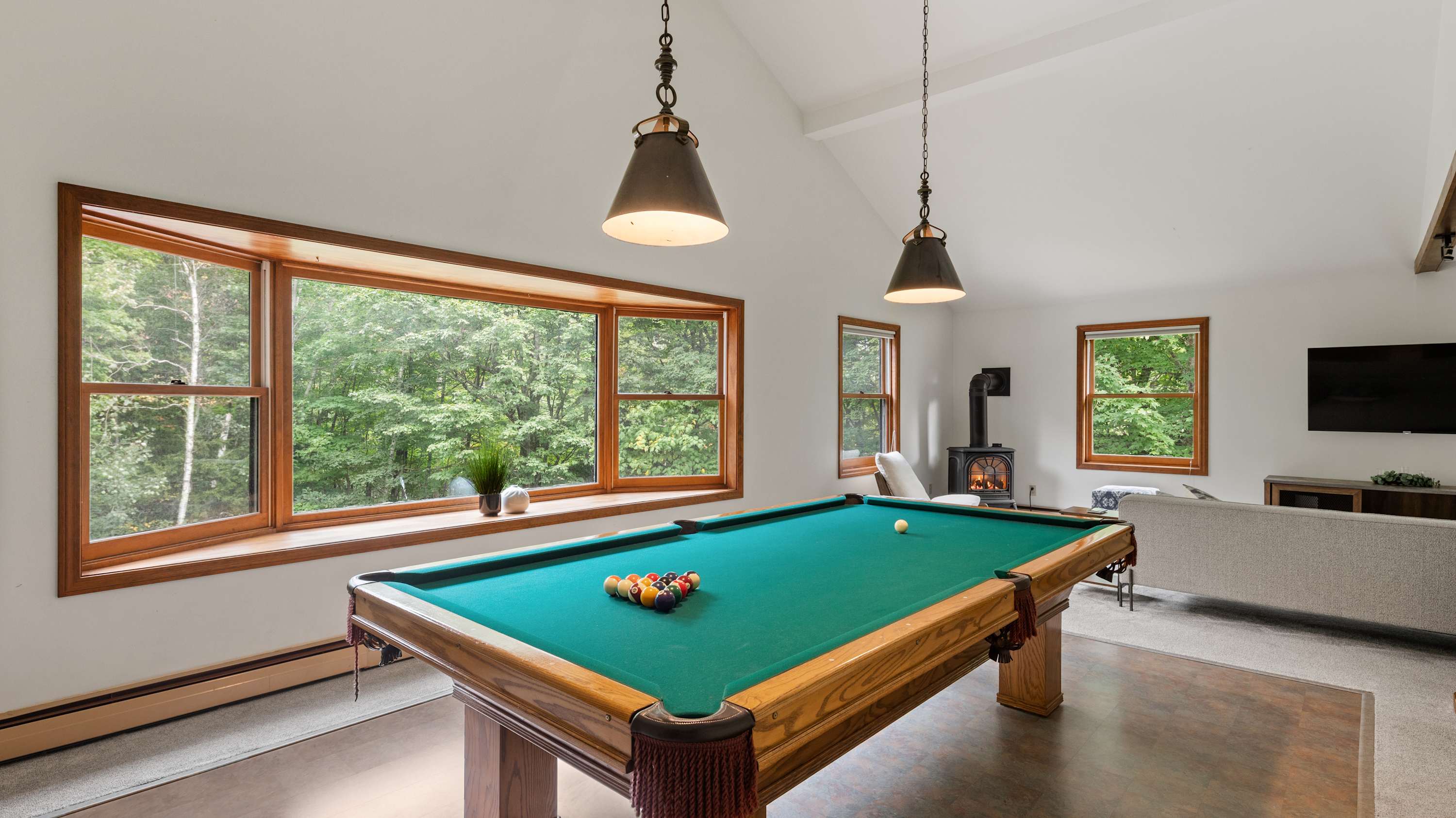 Upstairs, three more bedrooms await, including a luxurious main suite with an incredible view of Jay Peak. Cozy up in front of the stone gas fireplace, unwind in the velvet lounge chair in the privacy of your room, watch a movie on the SmartTV, or enjoy the en suite bathroom with a soaking tub and spacious walk-in shower. Across the hall you'll find two more bedrooms one with a King bed and SmartTV and the other with a Queen bed and cozy reading nook. Each sharing a spacious guest bath with glass walk in shower and separate tub. The second level also offers a second living area with a massive sectional, gas wood stove, pool table, board games, and a SmartTV for complete entertainment. A whimsical loft space with a play area and additional sleeping quarters makes this floor perfect for families.