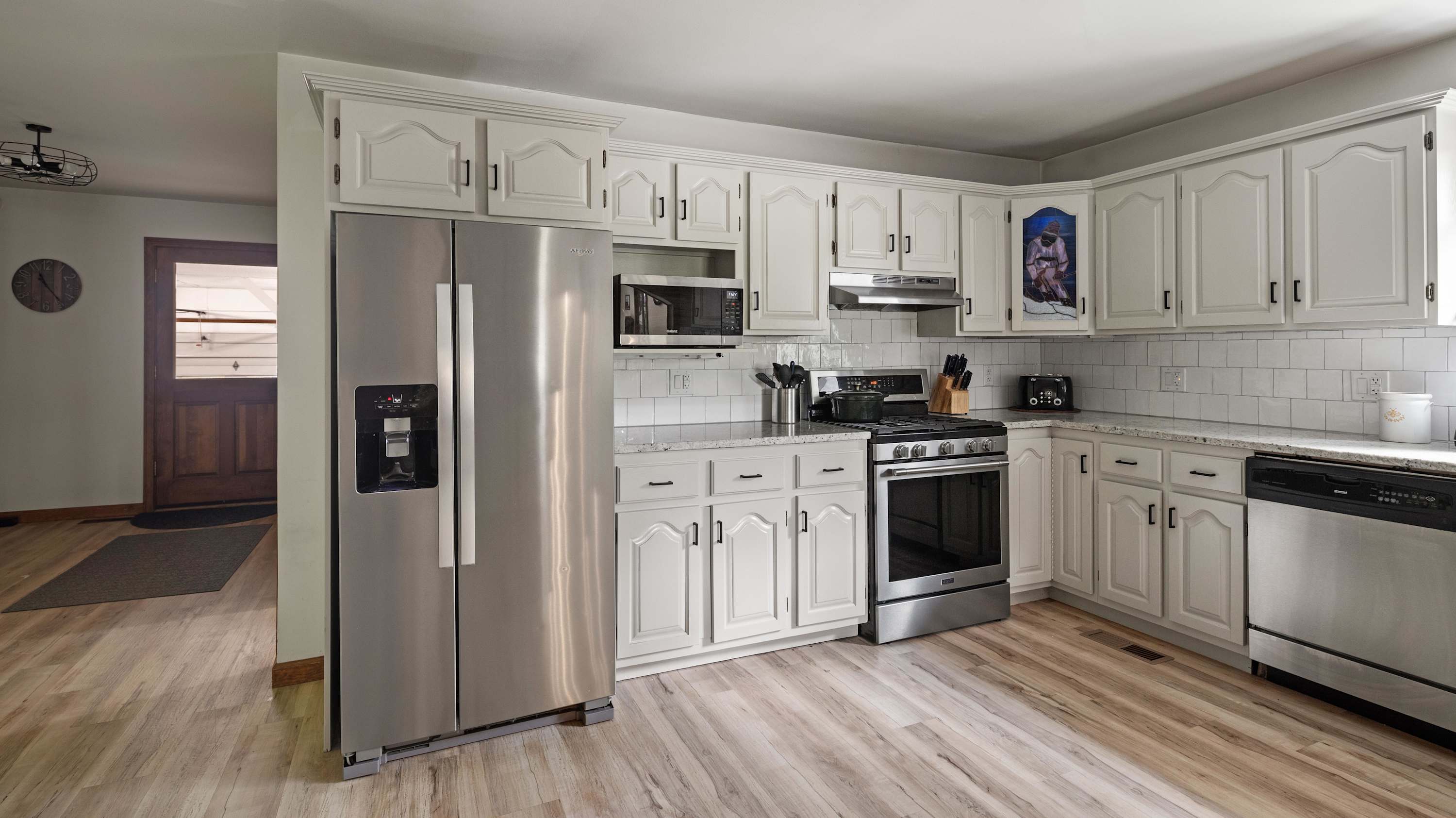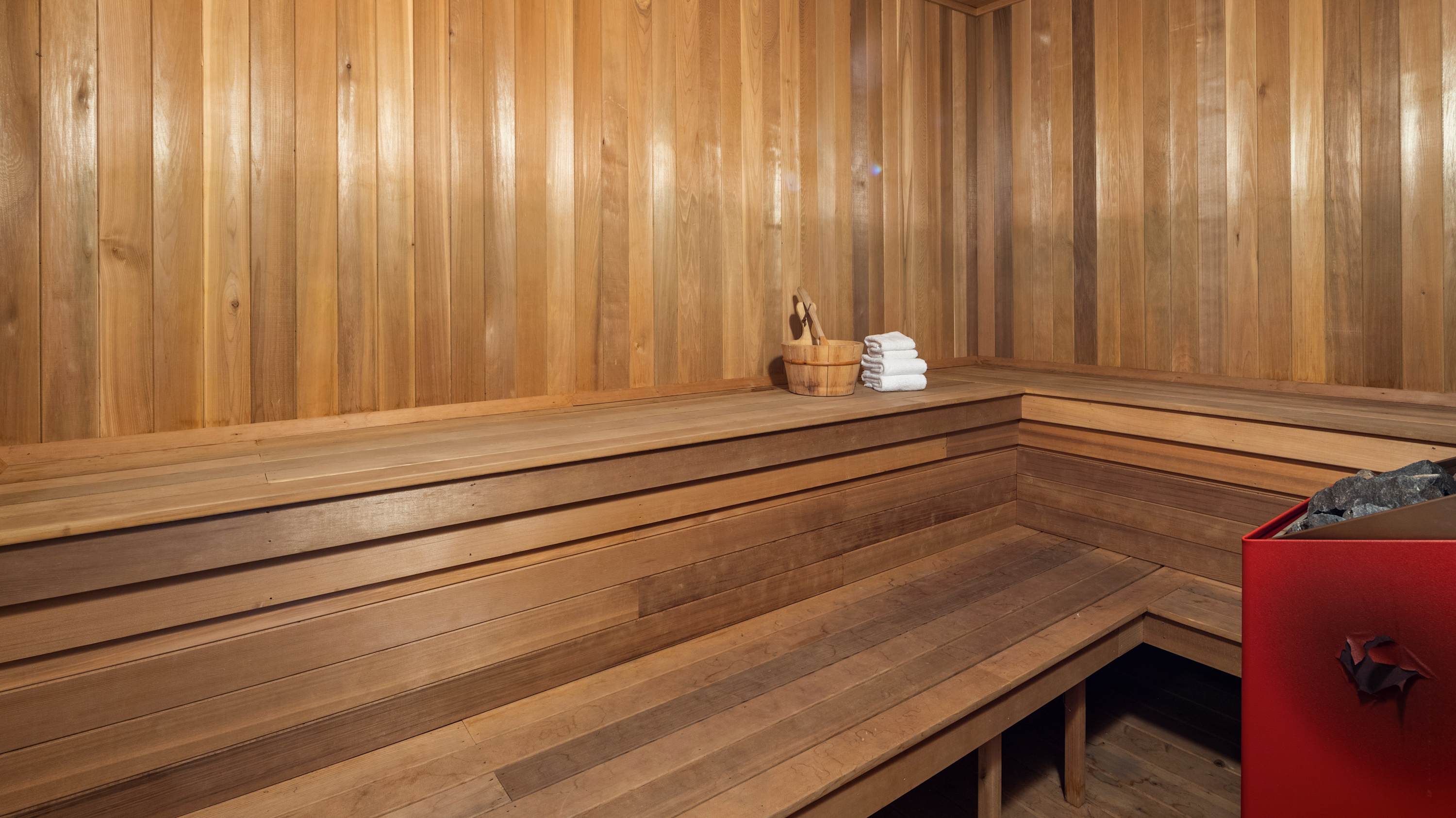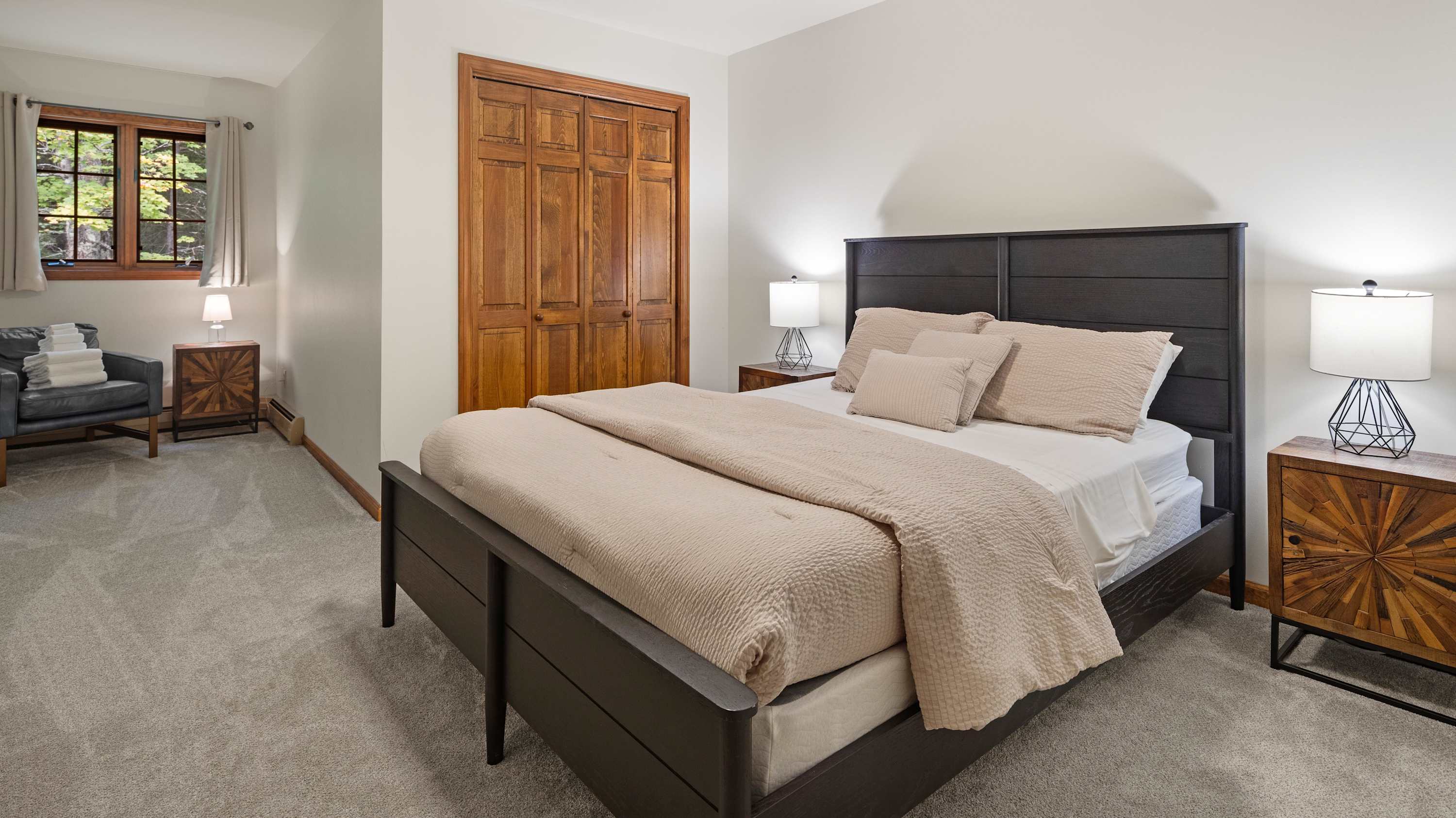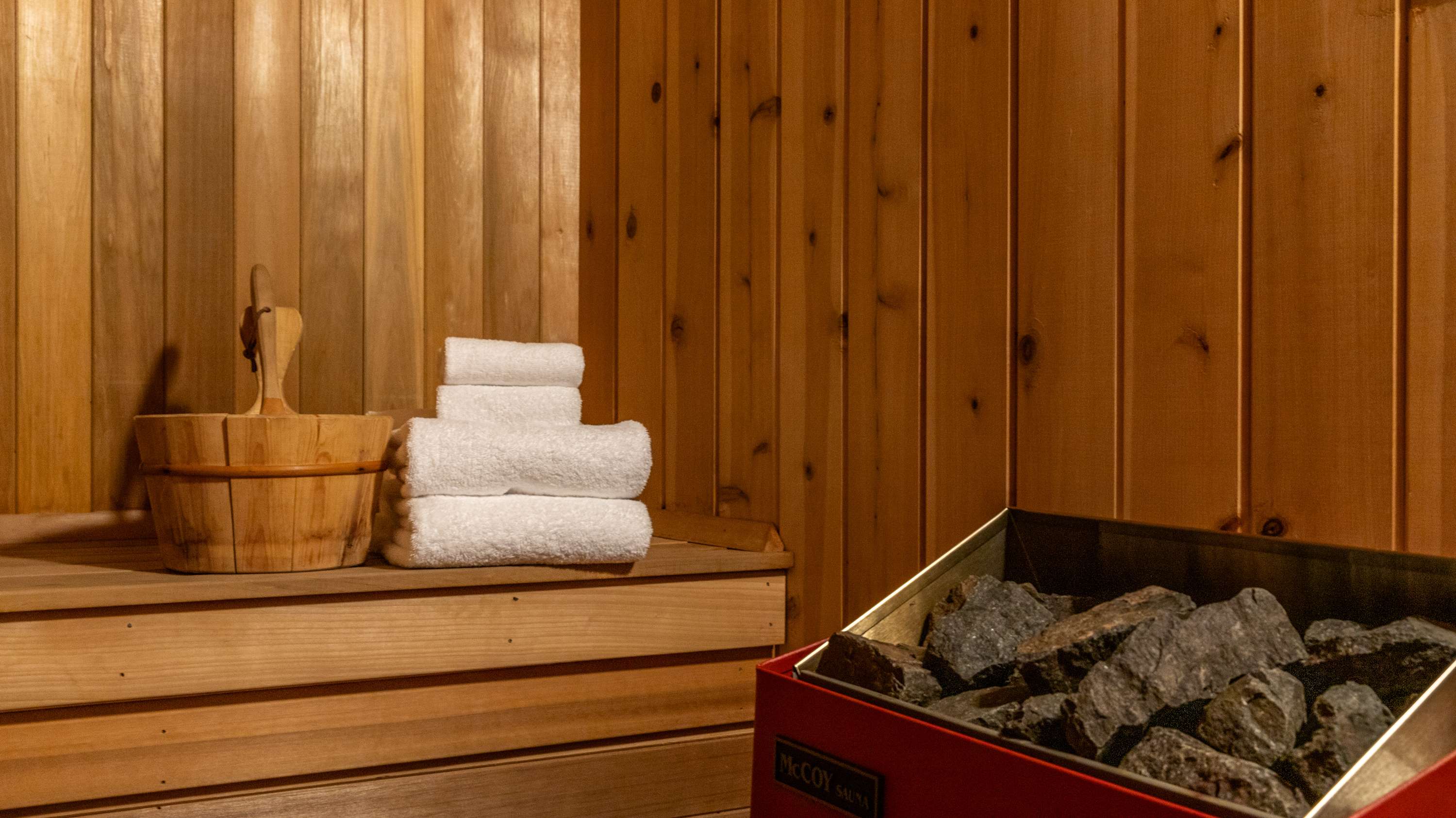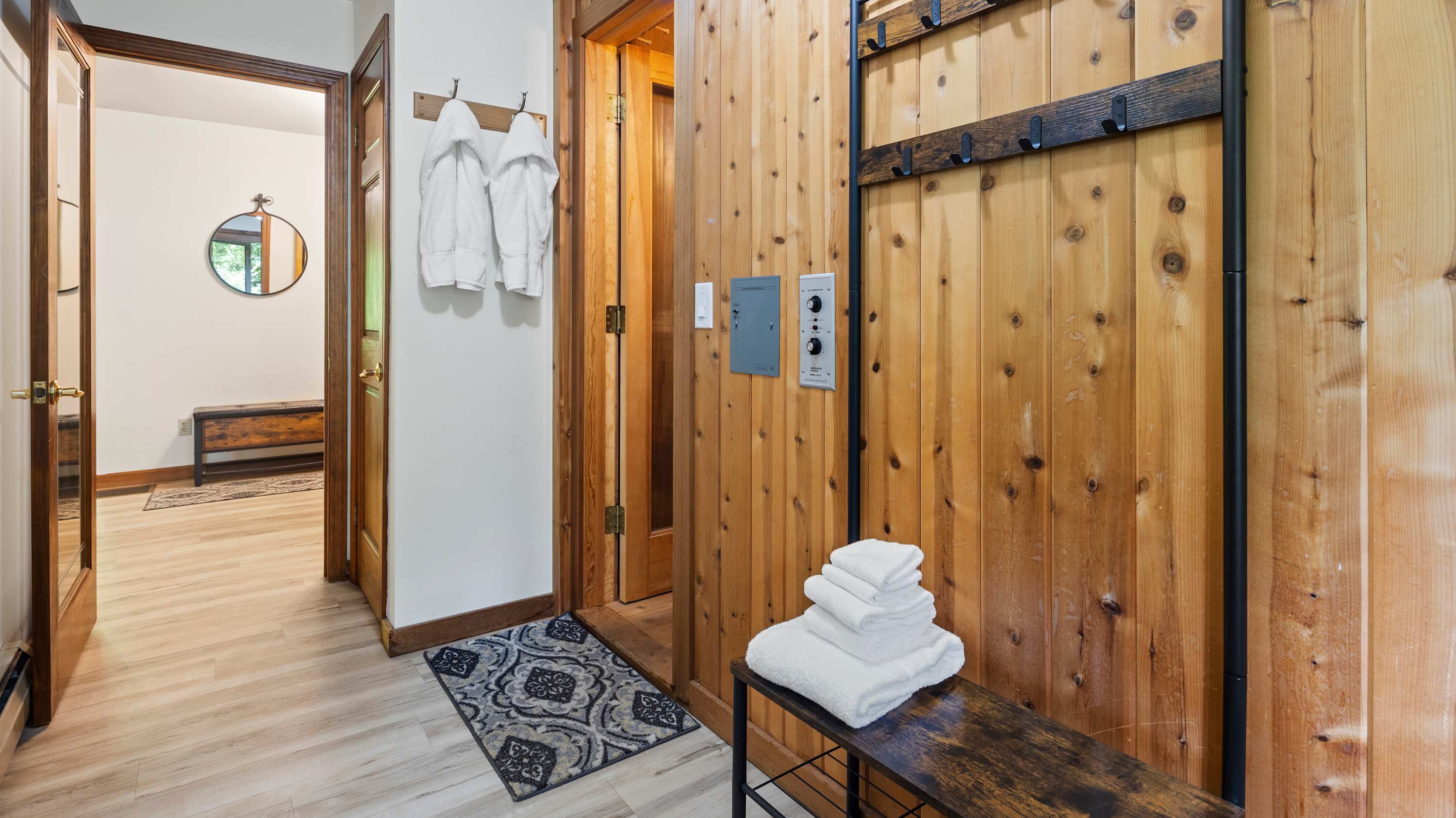 The large, spacious kitchen is fully equipped to cook for the whole group with stainless steel appliances, a gas stove, and plenty of counter space. Thoughtful touches, like stained-glass accents in the cabinets and windows, add a unique charm. Just beyond the kitchen, you'll find a large private sauna and the first of four inviting bedrooms.