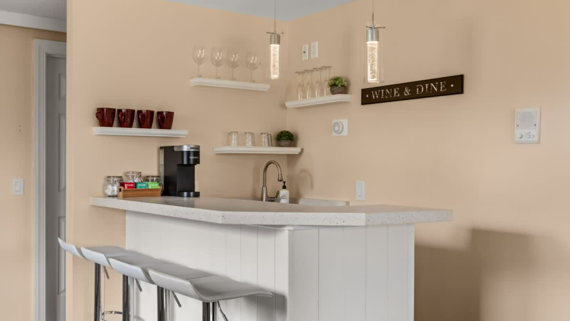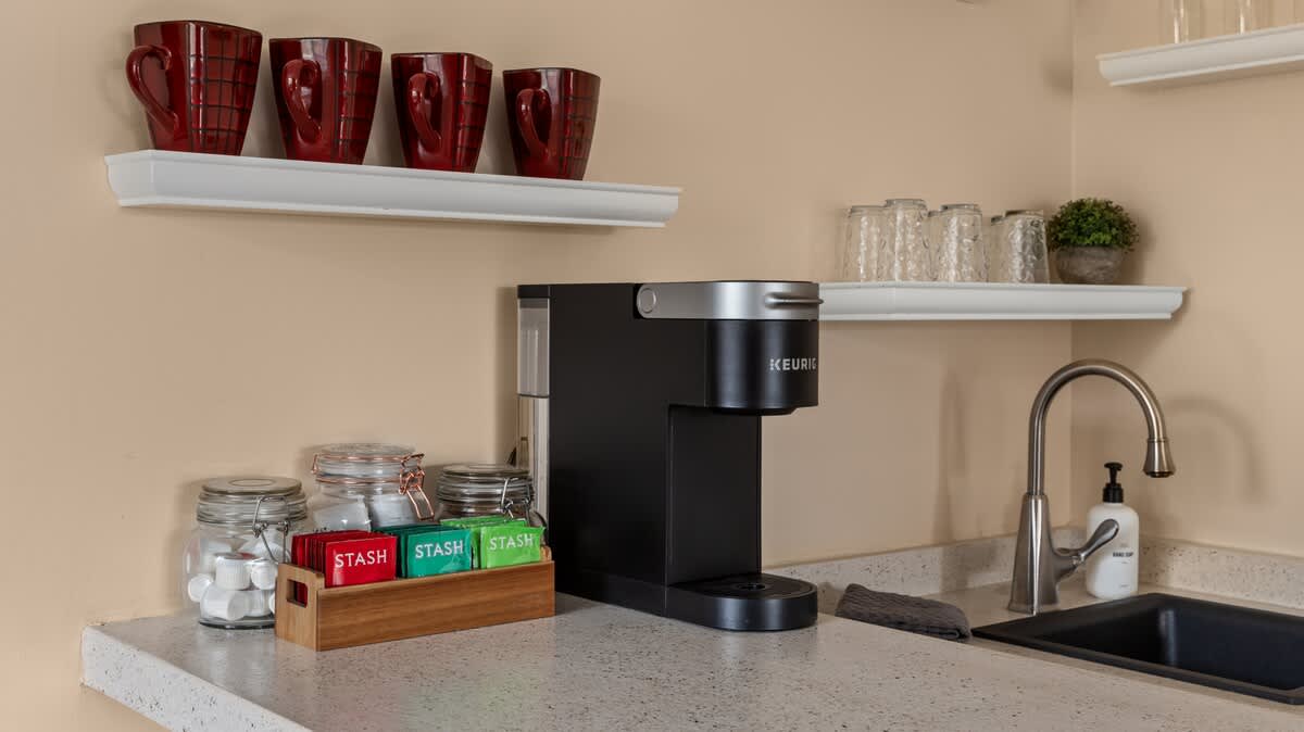 •Kitchenette / Bar Area. The bar seats 4 with a bar sink, mini-freezer, coffee machine, toaster, dishes, and utensils. Our guests typically dine out, and we recently added the Kitchenette as a backup option to cover cooking basics for occasional use. It contains a Microwave/ Convection Oven combo, a 2 burner induction cooktop, and a refrigerator.