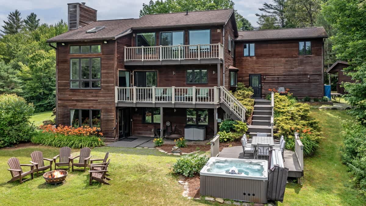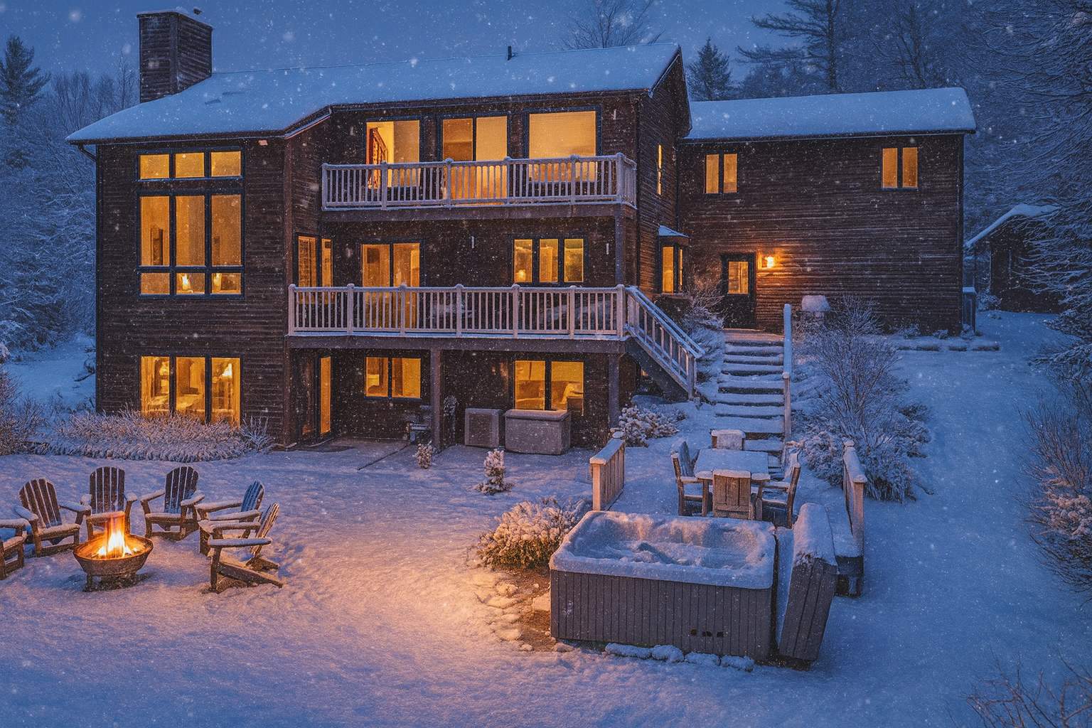 NEW PROPERTY: Luxury mountain retreat at the end of a private road in Stowe, minutes from the village. Enjoy stunning views, a private pond, two fire pits, hot tub, and spacious layout perfect for two families. Features include 4 bedrooms, 4 baths, two kitchens, wood-burning and gas fireplaces, soaking tubs, and outdoor dining. Ideal for multi-gen trips or groups wanting space and privacy in a serene setting. Check our reviews on our other listings!