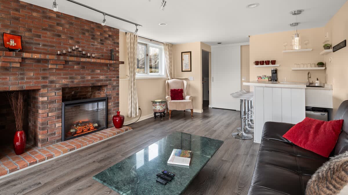 *Cozy living room** with fireplace and backyard walkout