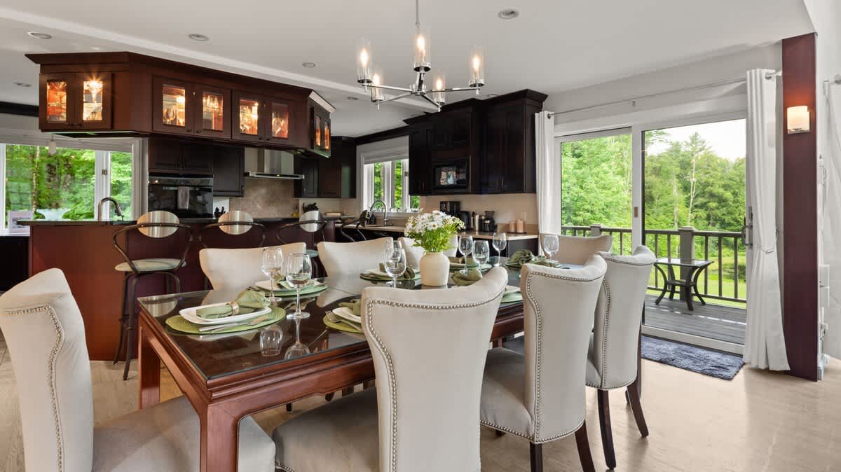 *Open-concept kitchen + dining + living area** with vaulted ceilings, a wood-burning fireplace, and panoramic windows