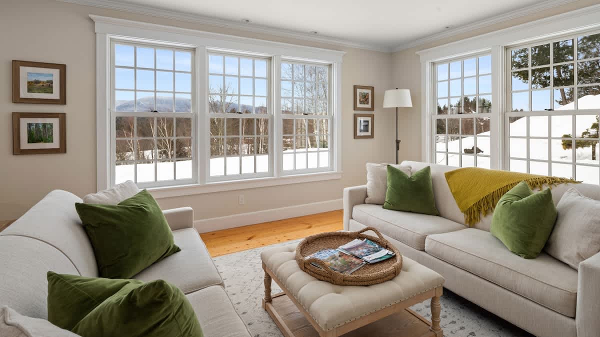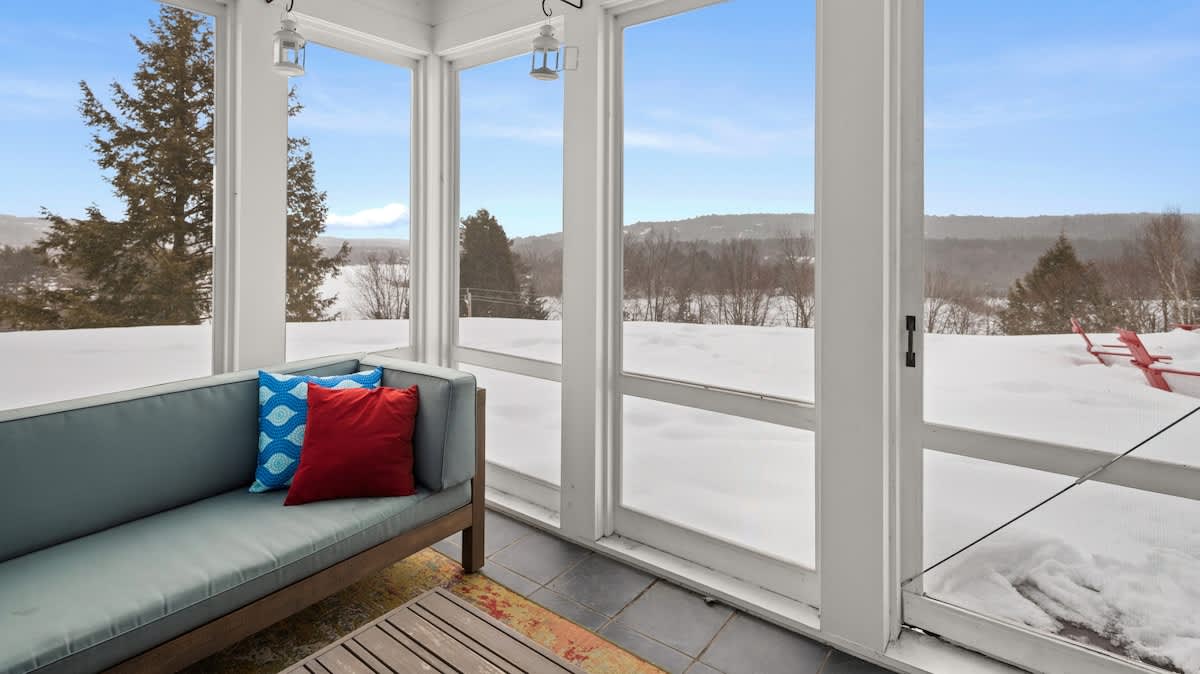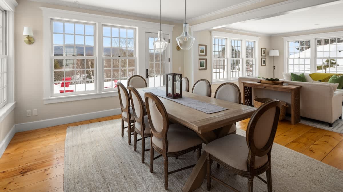 The Modern Farmhouse in Stowe sits atop 10.5 acres of finely manicured mountain landscaping and enjoys panoramic mountain views. The Modern Farmhouse is located at the end of a long private drive just off of Mountain Road. As you make your way up towards the house, the adjacent Vermont barn-style garage provides both rustic charm and covered parking for three automobiles. The house has 3 bedrooms that can sleep up to 8, and there is also a sleeper sofa available in a shared living spare.