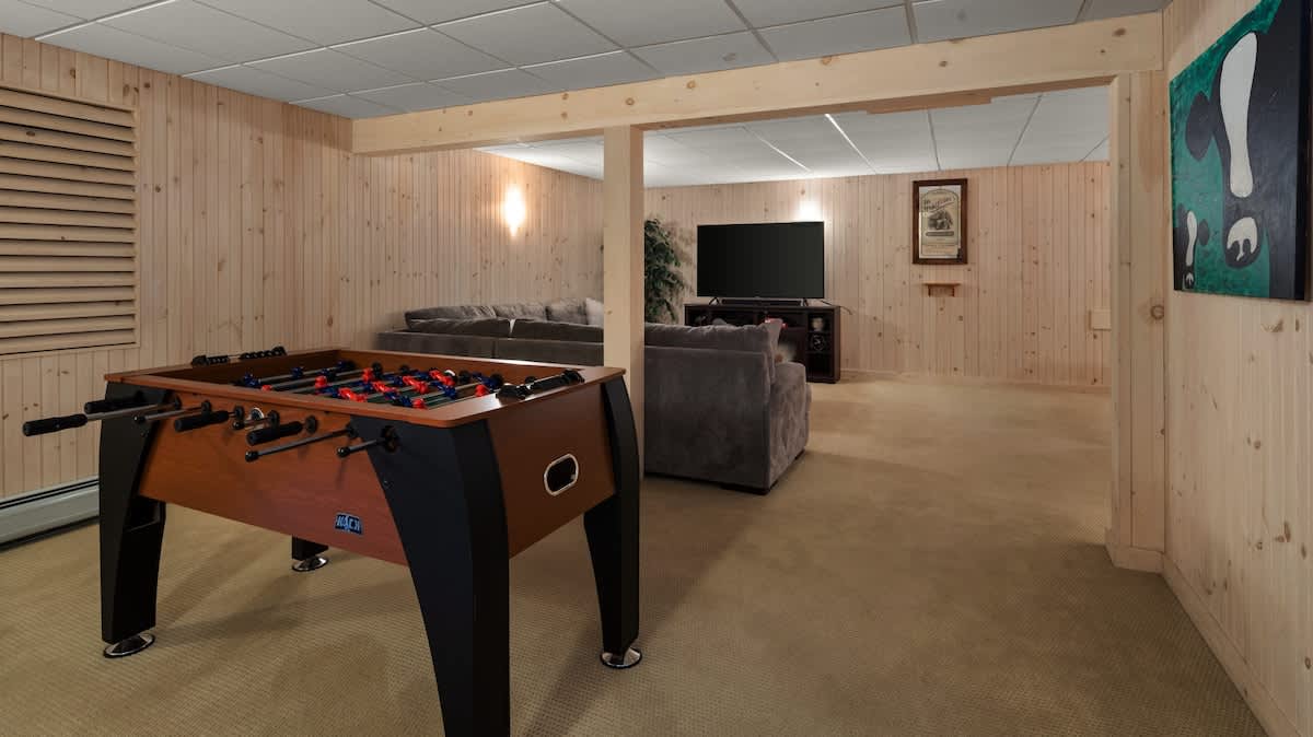 Inside, enjoy all the comforts of home paired with the latest in modern conveniences-- a fully equipped kitchen including stainless steel appliances, gas range and has an in-counter downdraft for the cooktop, Nest thermostat, gas fireplace and heated tile floors. Kick back and take a relaxing bath in the jacuzzi tub while soaking in the spectacular mountain view or settle into the den with a selection of books and games for your entertainment. The game room and lounge area is equipped with a 60 inch Samsung 4KTV with Apple TV, pool table, foosball table, and sectional sofa making it the ultimate hang out spot. Also please note that the Dish cable is not active. There is central air AC available in the summer months!