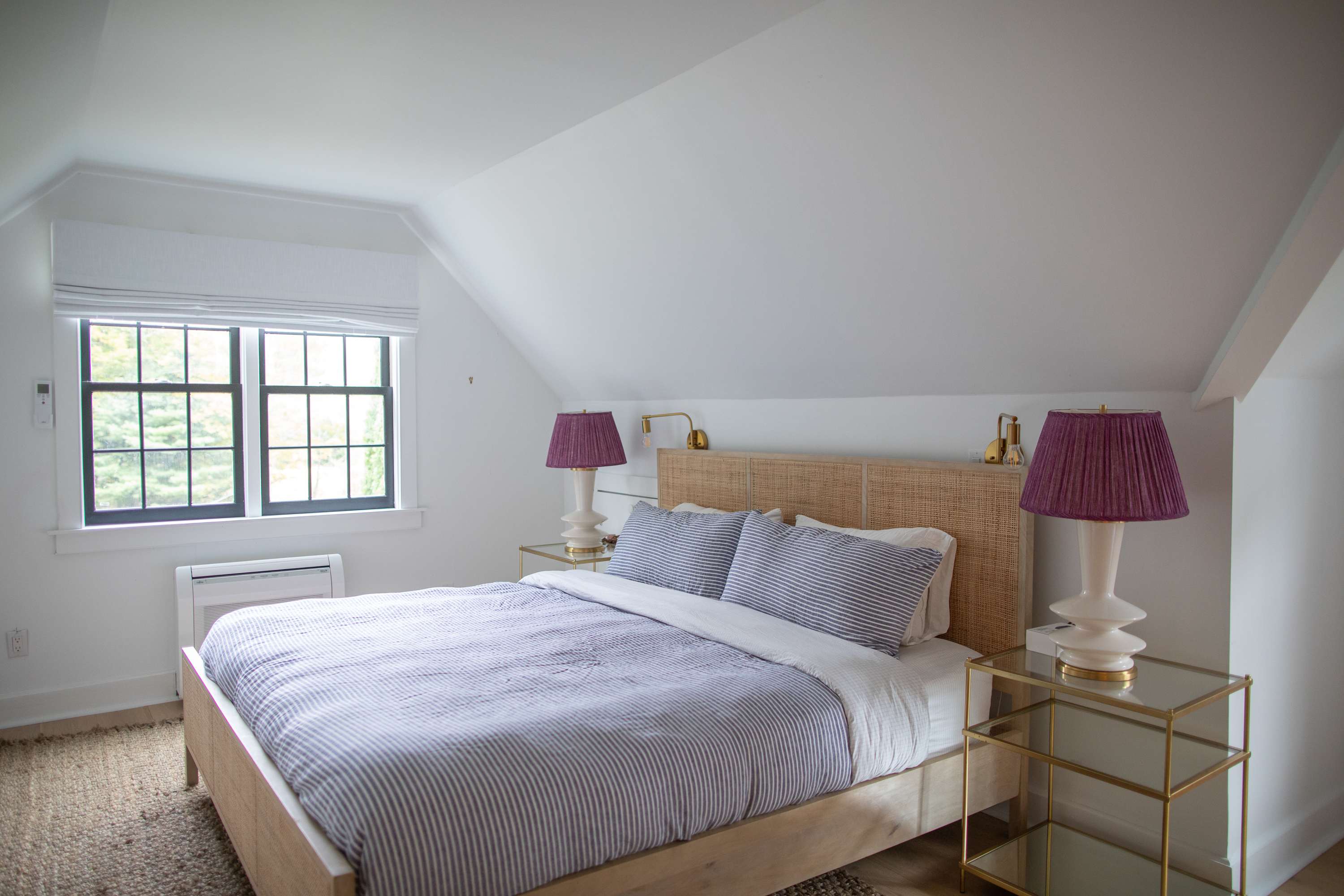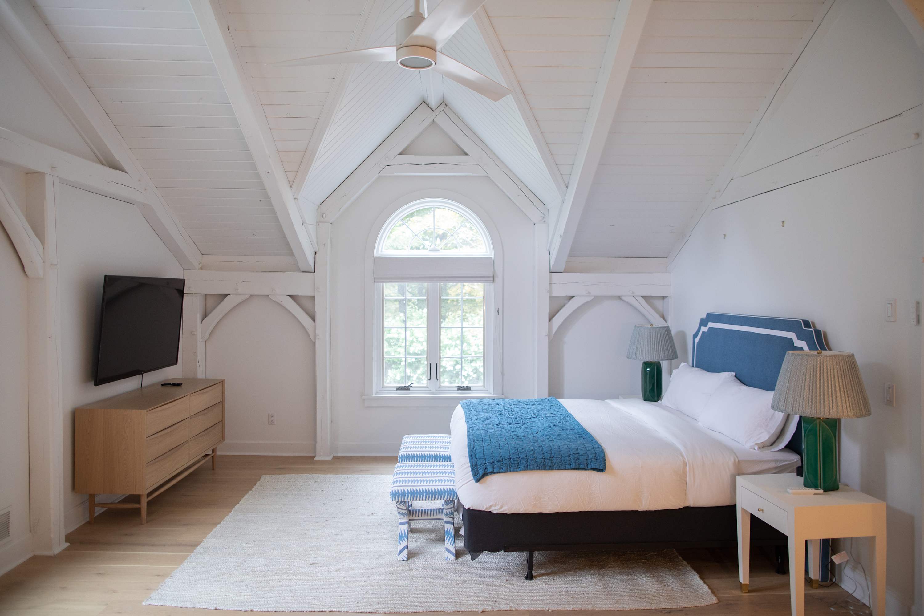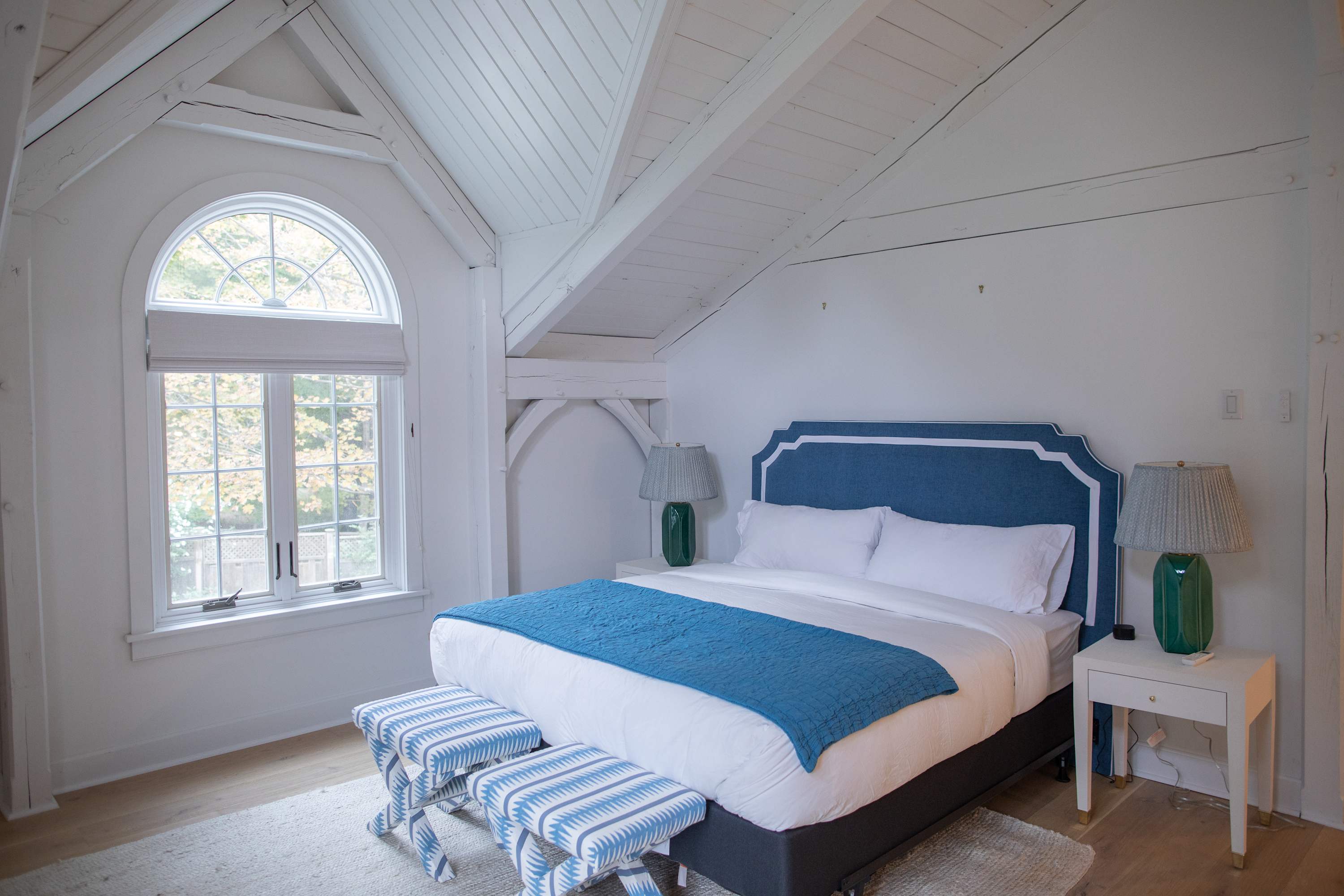 One guest bedroom is located on the main floor with a queen size bed looking out through the floor-to-ceiling bay windows with a view of the front garden. Another guest bedroom is located above the garage offering a king size bed and ensuite bathroom with a tub/shower combo.