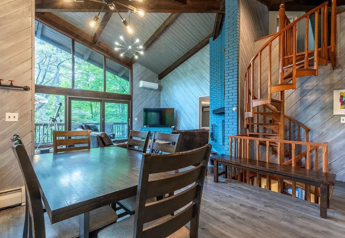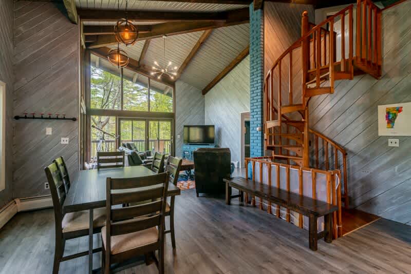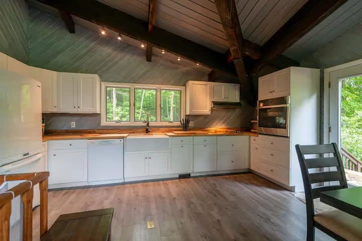 The Owl Brook house is equipped with everything you'll need for a relaxing Vermont getaway! The house offers four bedrooms (main floor: two bedrooms each with a queen bed, downstairs bedroom offers a queen bed with en suite shower bathroom and upstairs loft bedroom via spiral staircase has two queen beds with a full bathroom), three bathrooms, kitchen with stove, oven, microwave, dishwasher, and several coffee makers (Keurig/drip combo and espresso machine), WiFi, three smart TVs, washer and dryer available for guest use, an EV charger, wrap around porch, overlooking the creek for some relaxing water ambiance. Enjoy the sounds of the beautiful backyard creek, relax in the open concept living spaces and make use of the fully appointed kitchen.