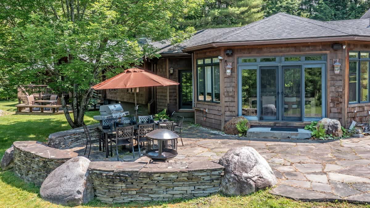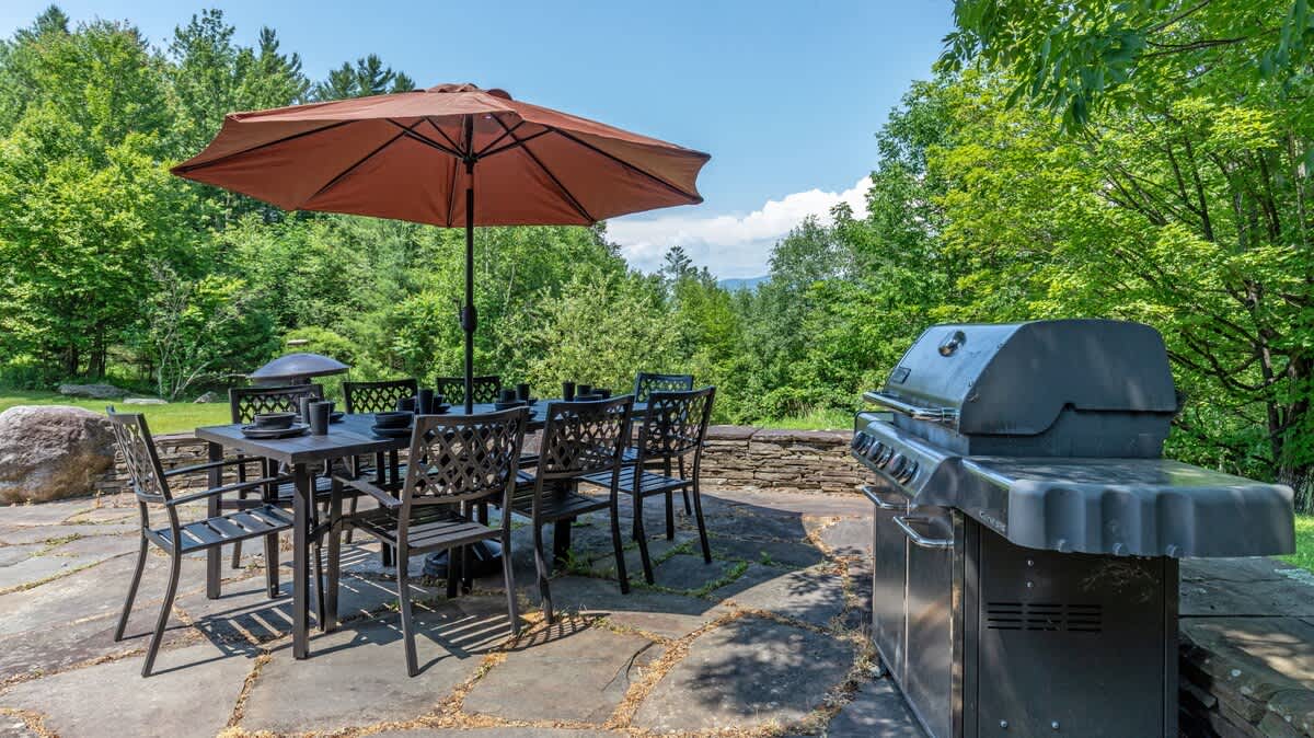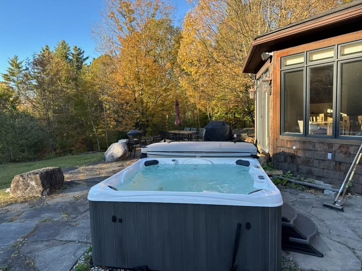 Outside on the large stone patio, there is a gas grill, hot tub and plenty of room for outdoor fun.