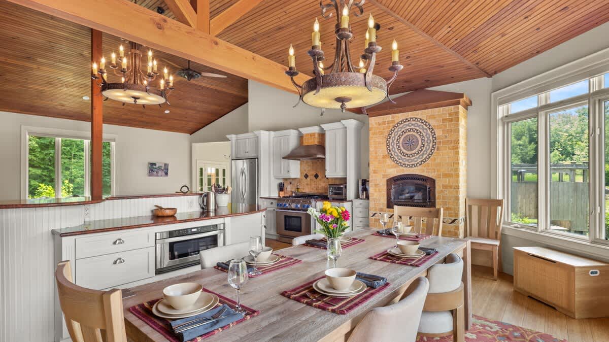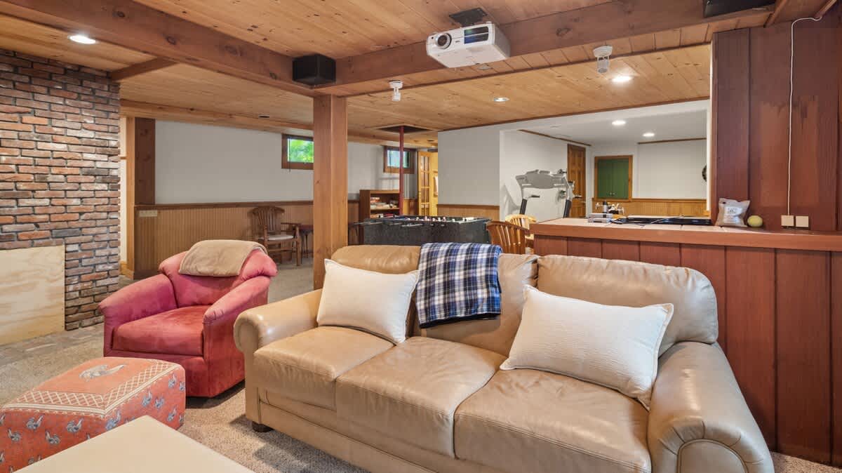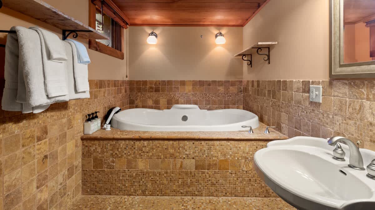 The stone fireplace room is a dream come true with spectacular views of the mountain and plenty of comfy lounging choices where you can enjoy evenings of family game / movie nights in front of a roaring fire.