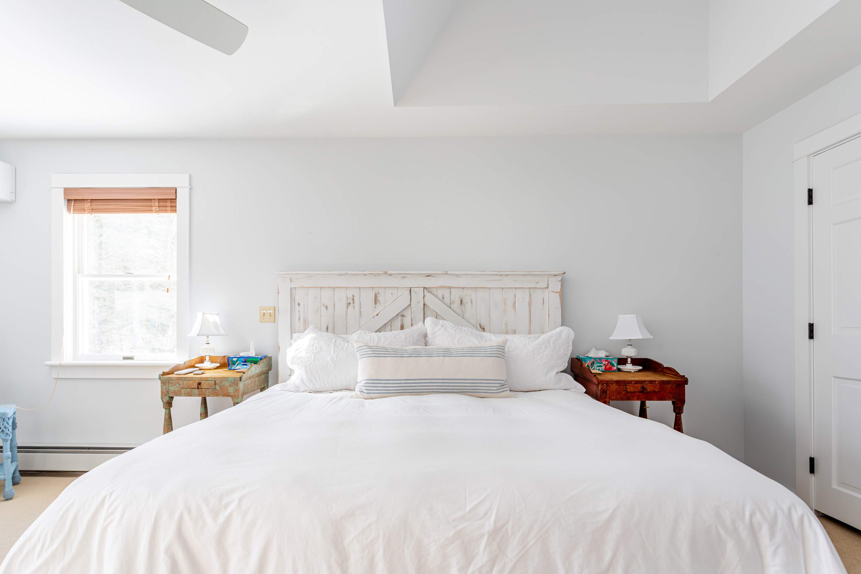 A bright and welcoming kitchen presents crisp white cabinetry, stainless steel appliances, and a central island with bar seating great for morning coffee, casual lunches, or wine while dinner simmers. The dining area pairs farmhouse warmth with classic New England character and features a solid wood dining table with bench and chair seating creating an inviting spot for shared meals or board games.