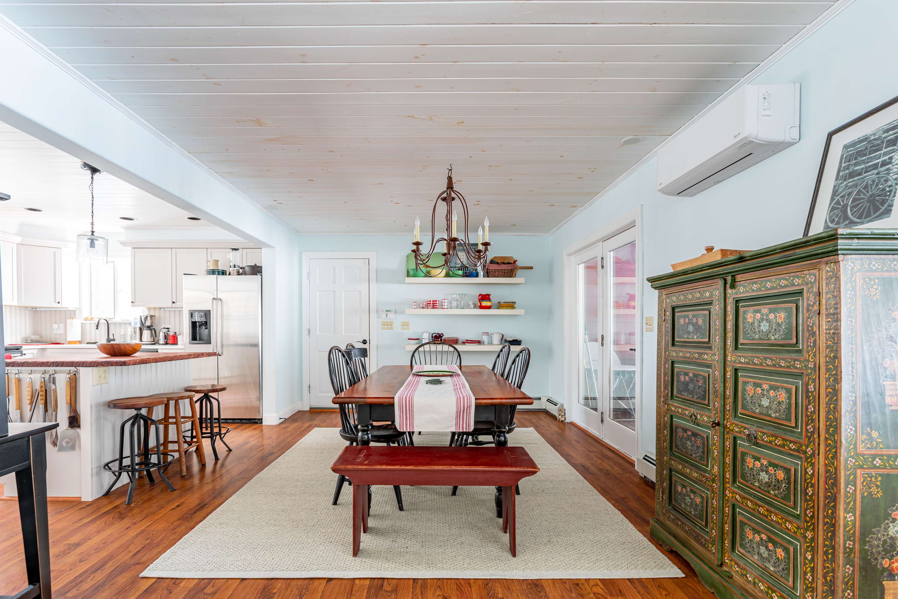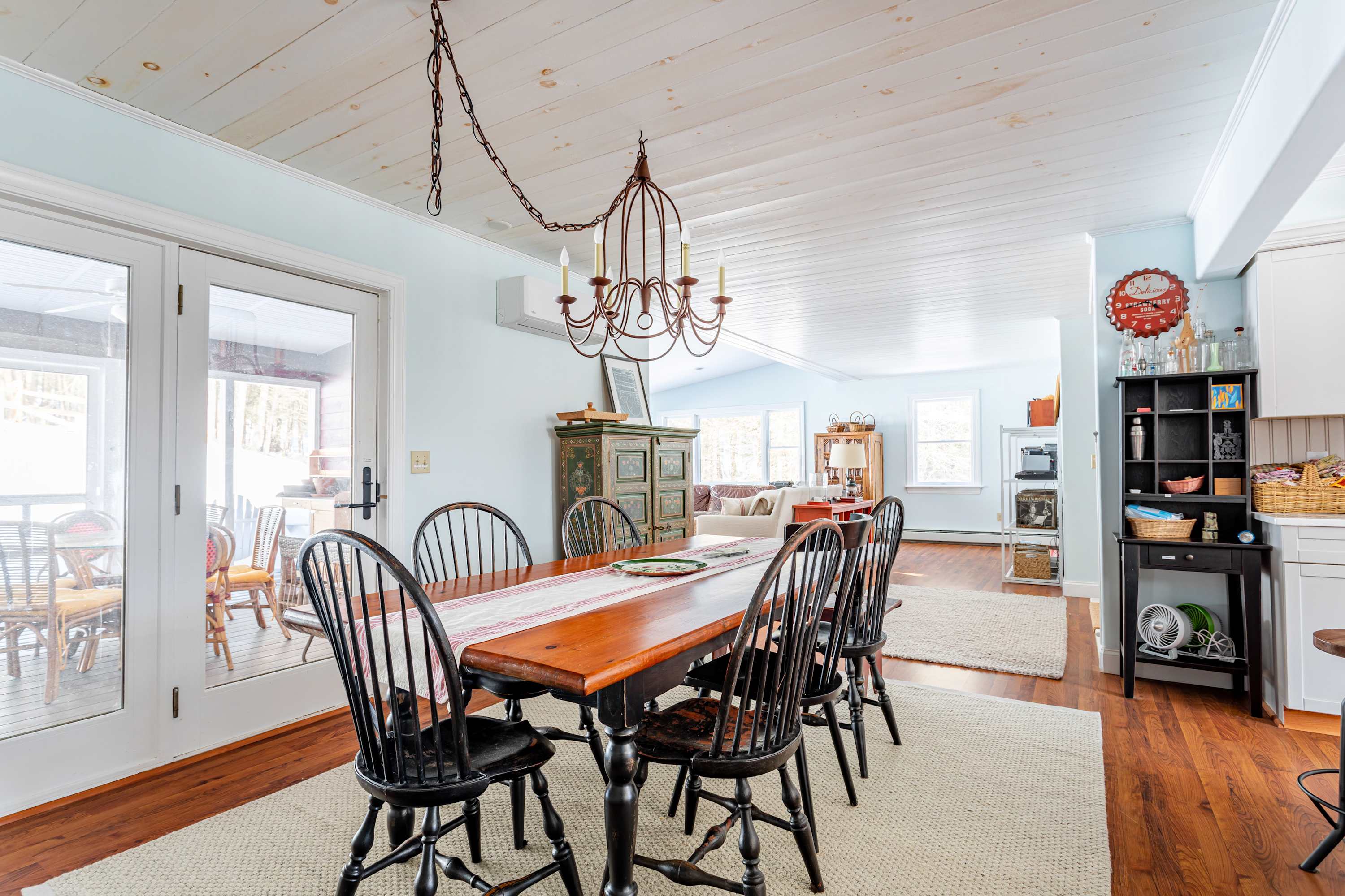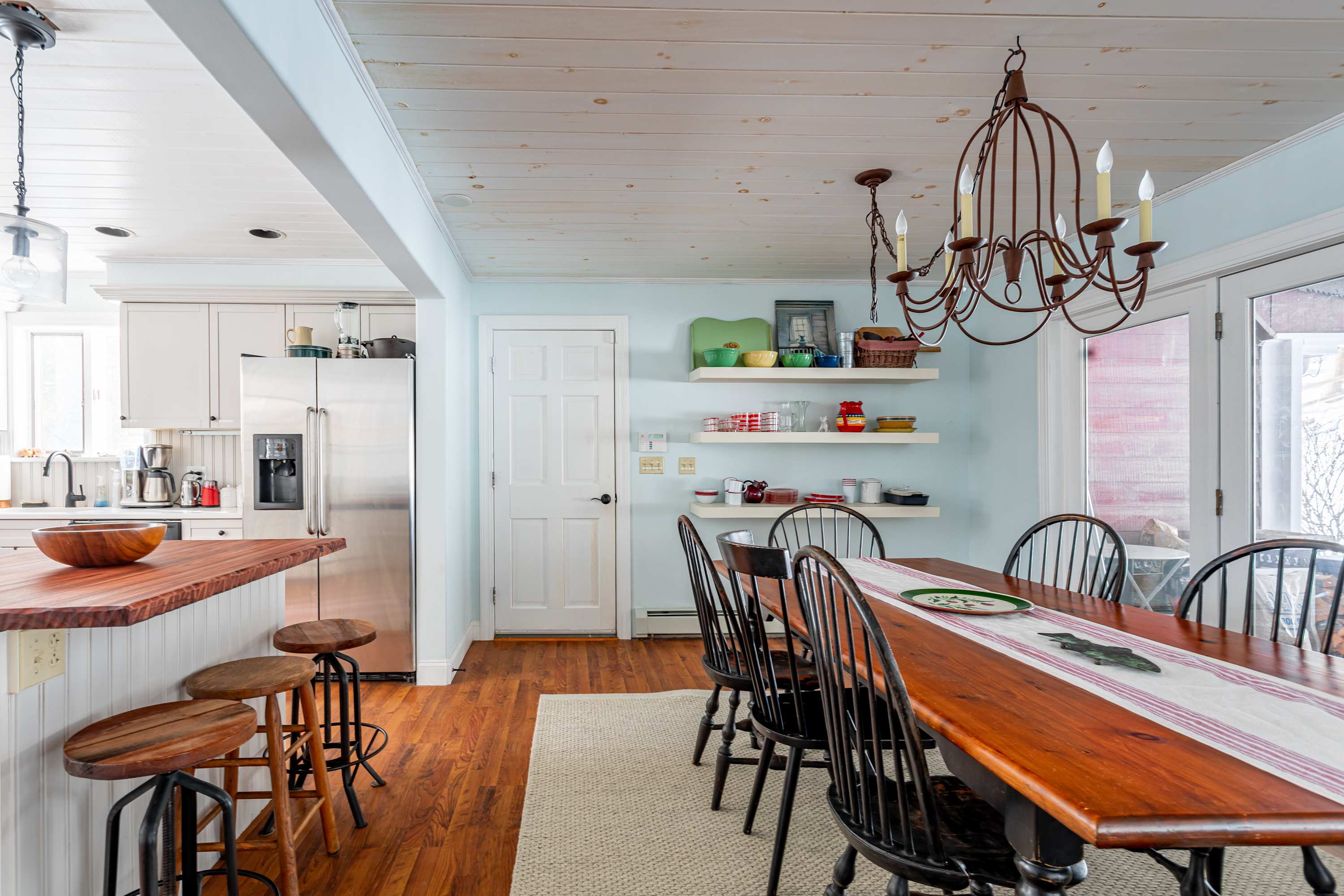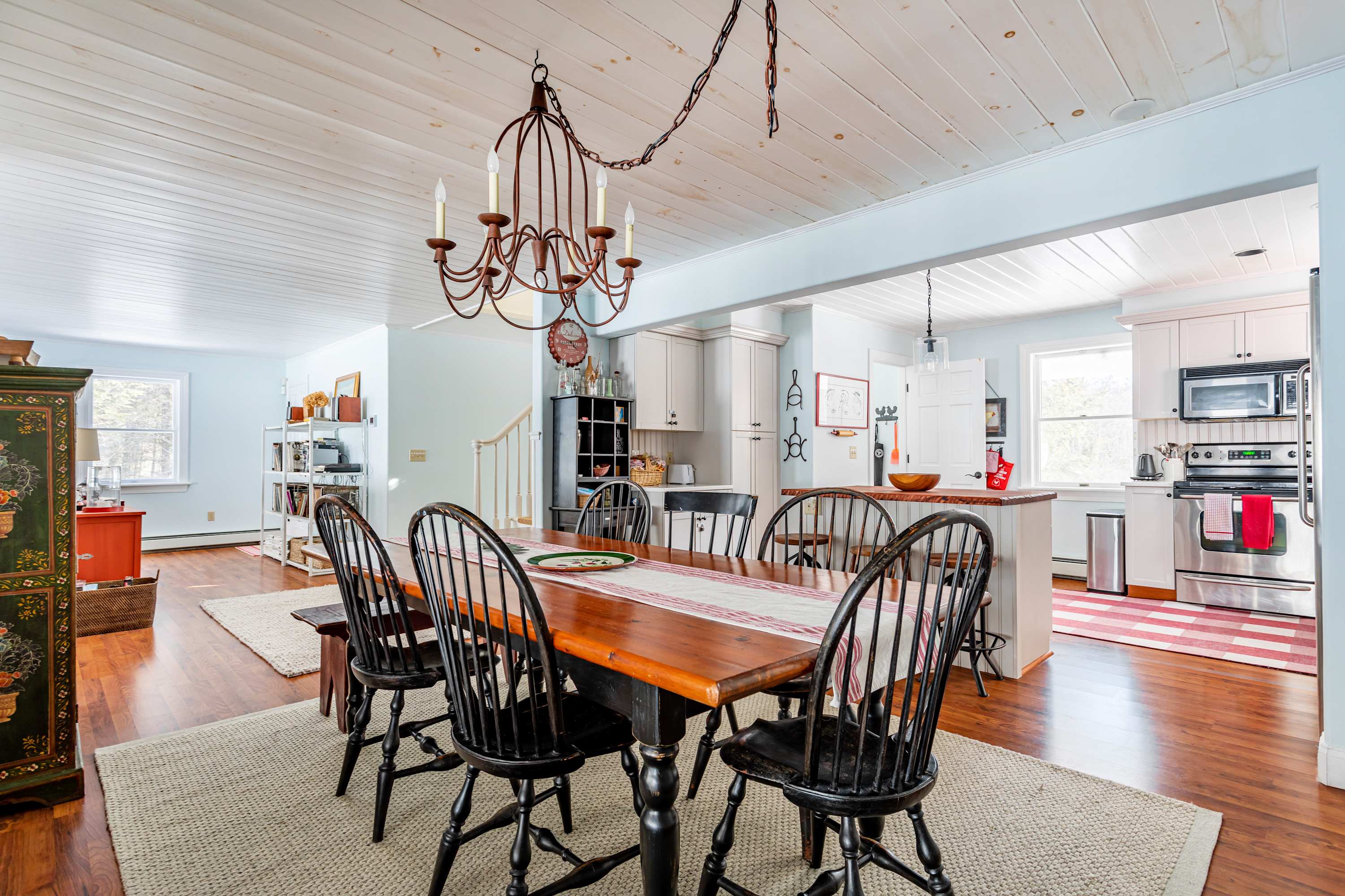 A bright and welcoming kitchen presents crisp white cabinetry, stainless steel appliances, and a central island with bar seating great for morning coffee, casual lunches, or wine while dinner simmers. The dining area pairs farmhouse warmth with classic New England character and features a solid wood dining table with bench and chair seating creating an inviting spot for shared meals or board games.