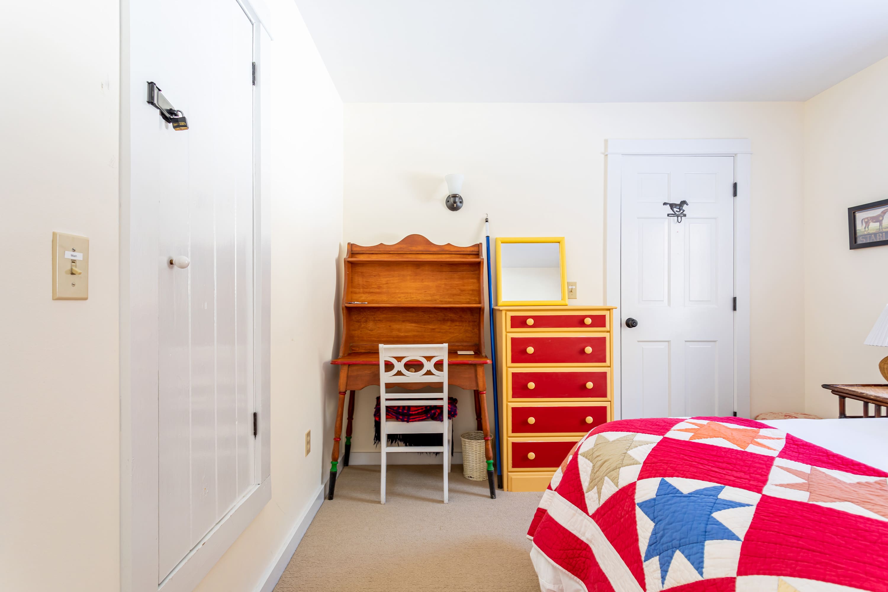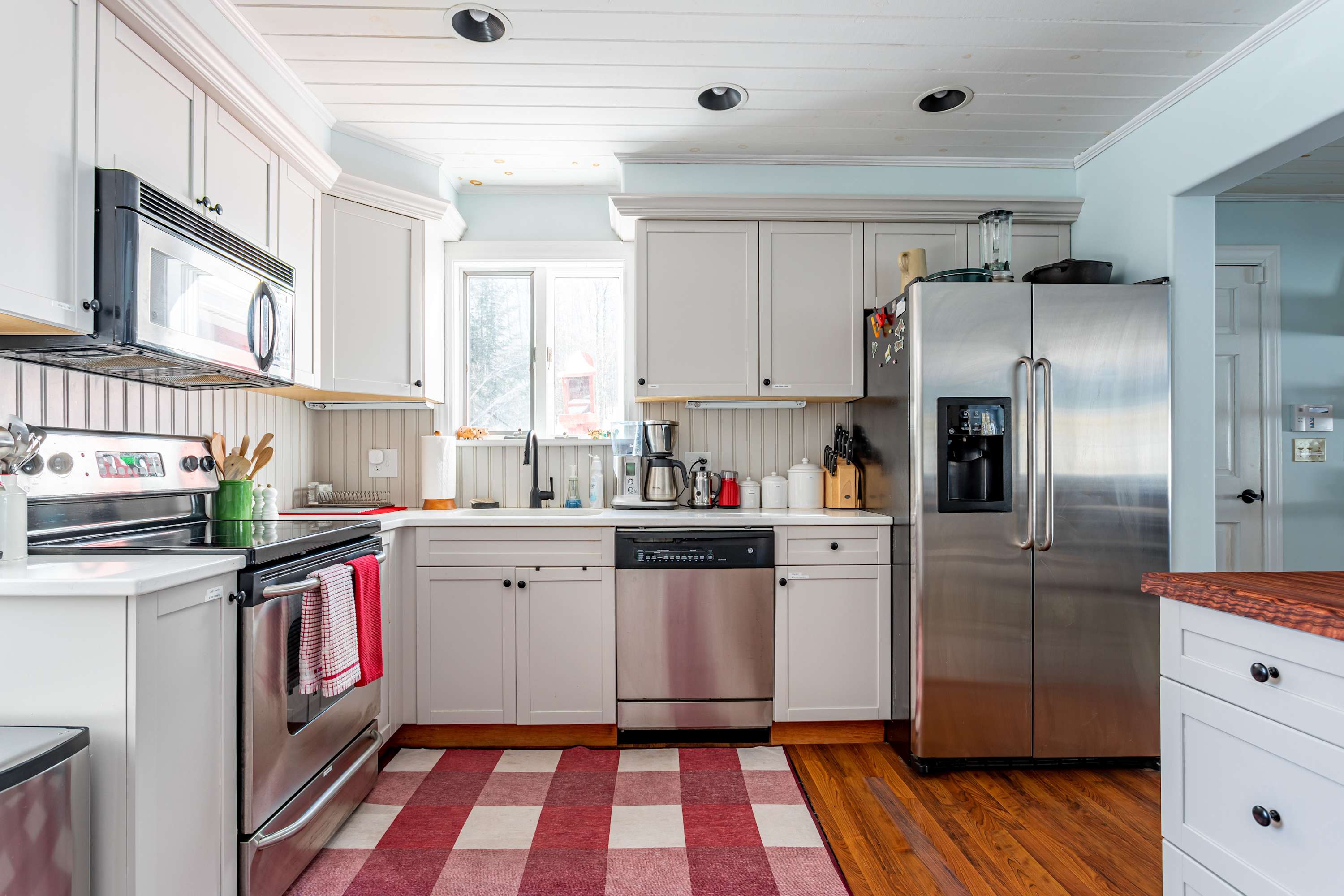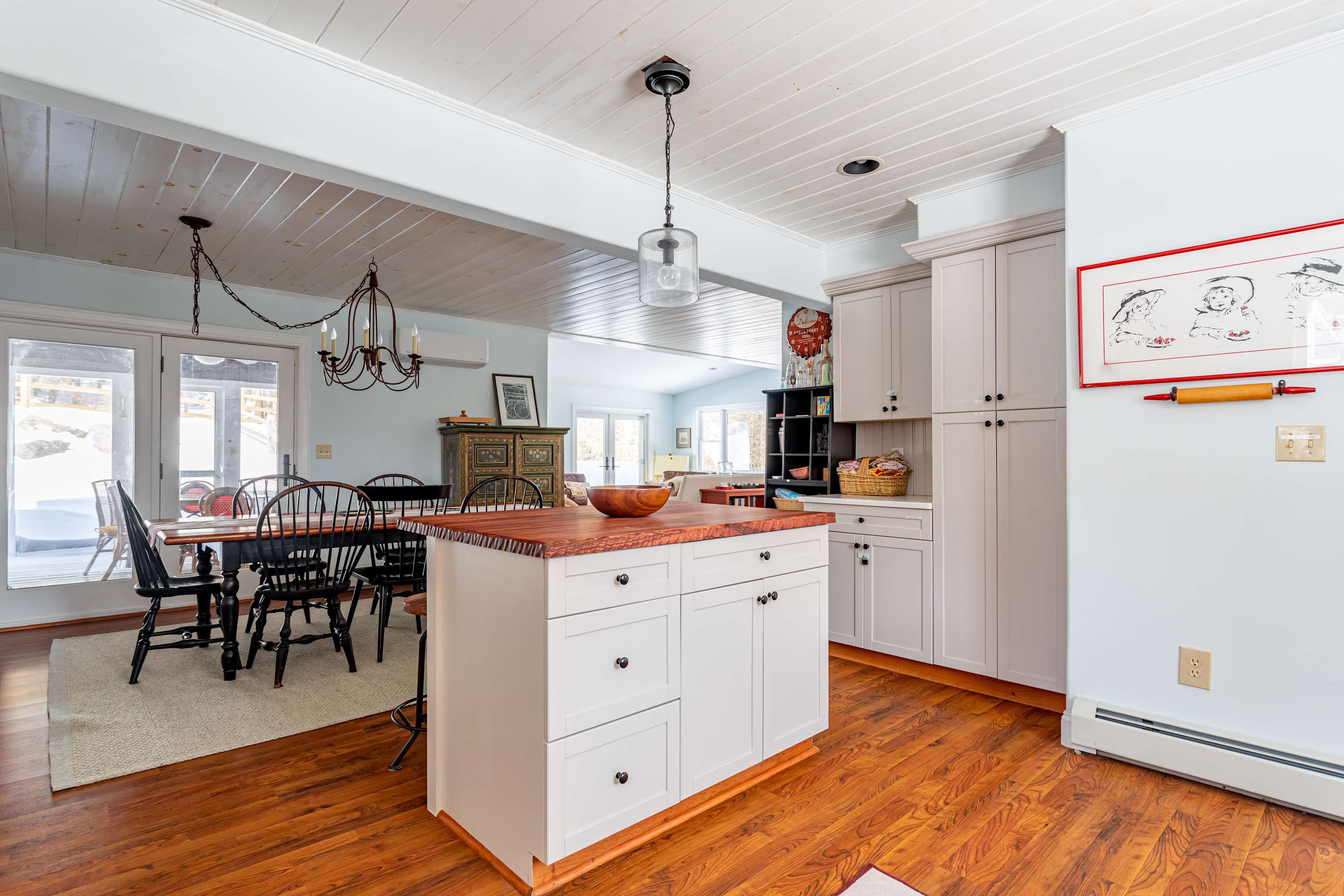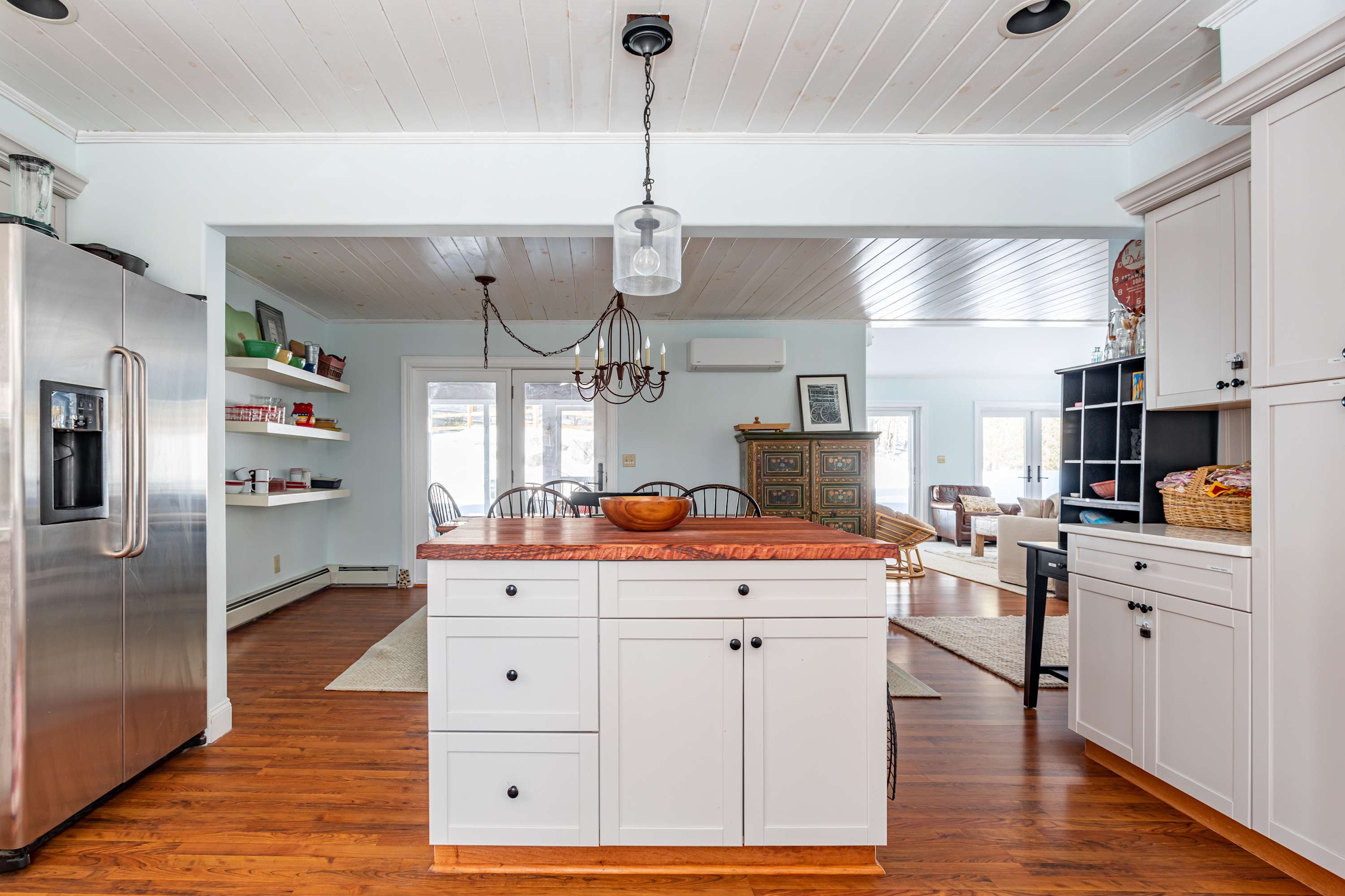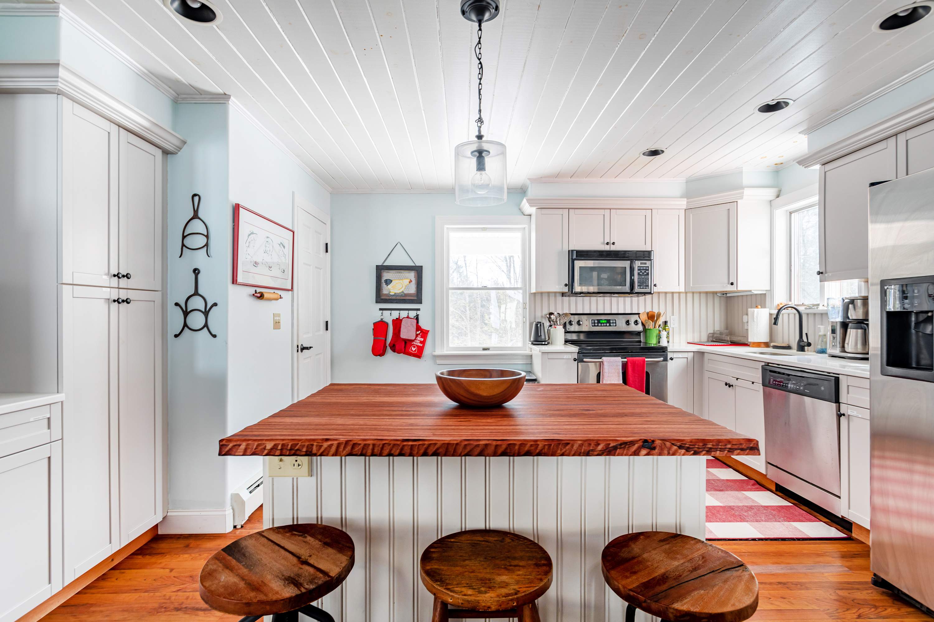 A bright and welcoming kitchen presents crisp white cabinetry, stainless steel appliances, and a central island with bar seating great for morning coffee, casual lunches, or wine while dinner simmers. The dining area pairs farmhouse warmth with classic New England character and features a solid wood dining table with bench and chair seating creating an inviting spot for shared meals or board games.