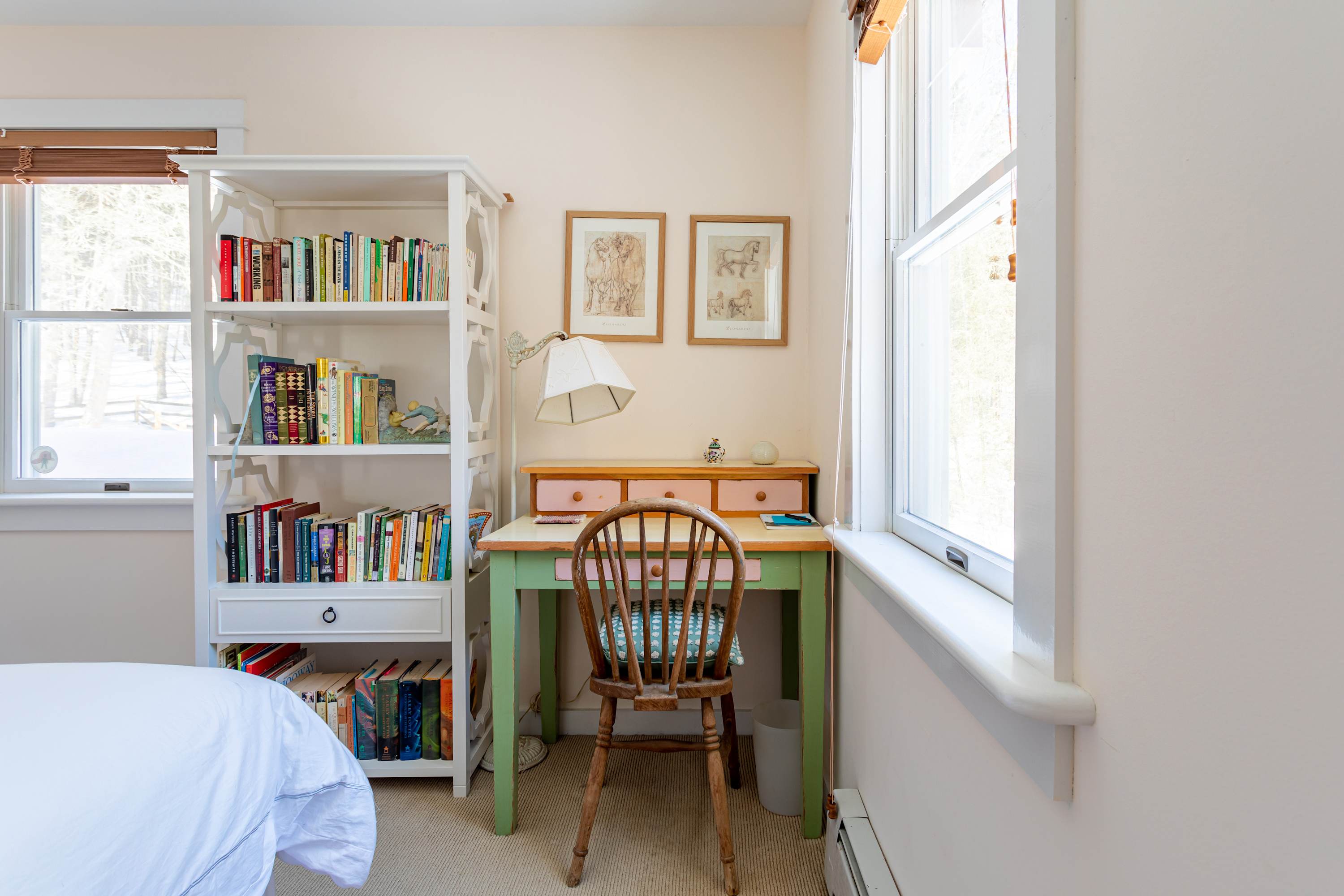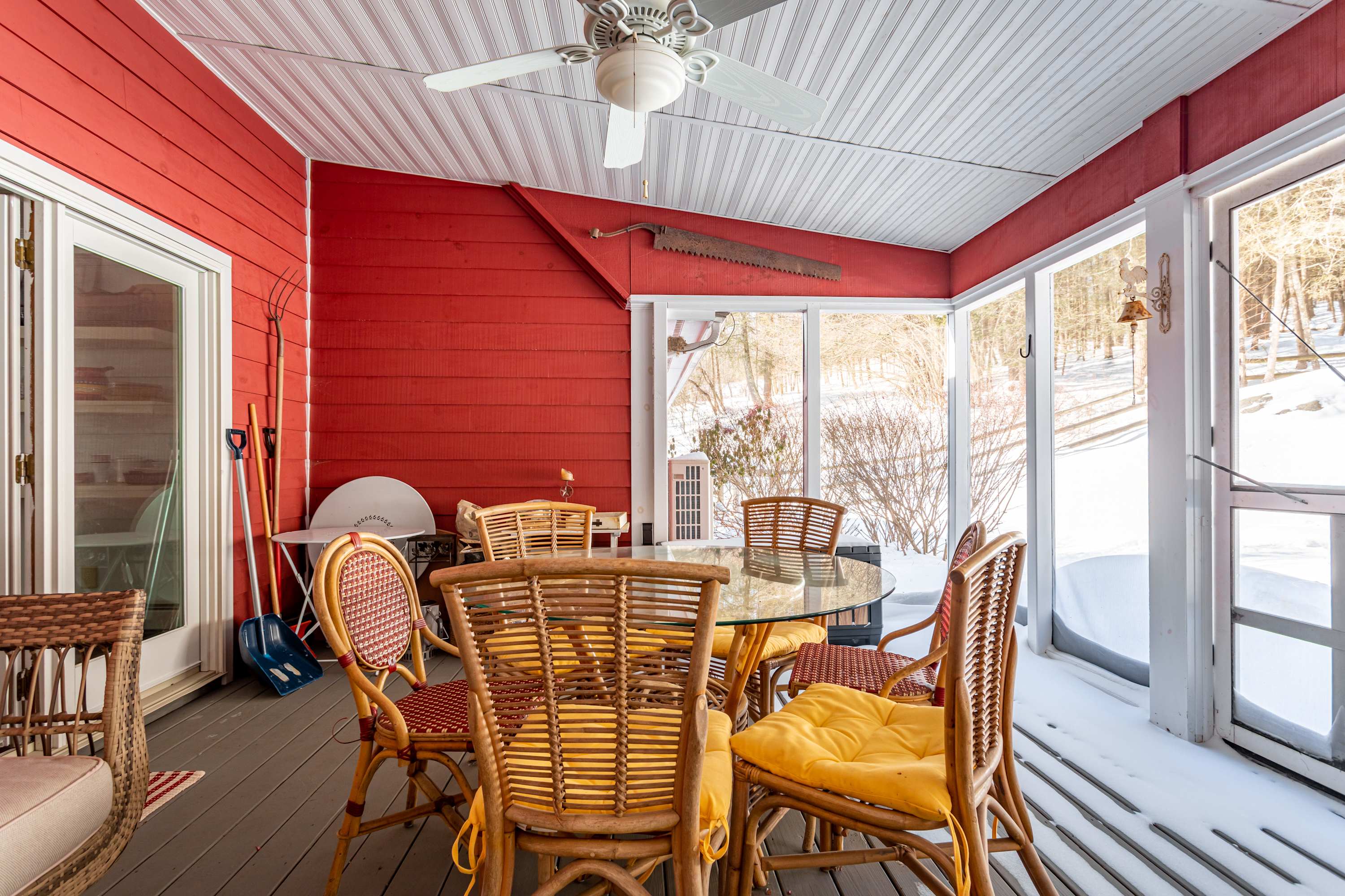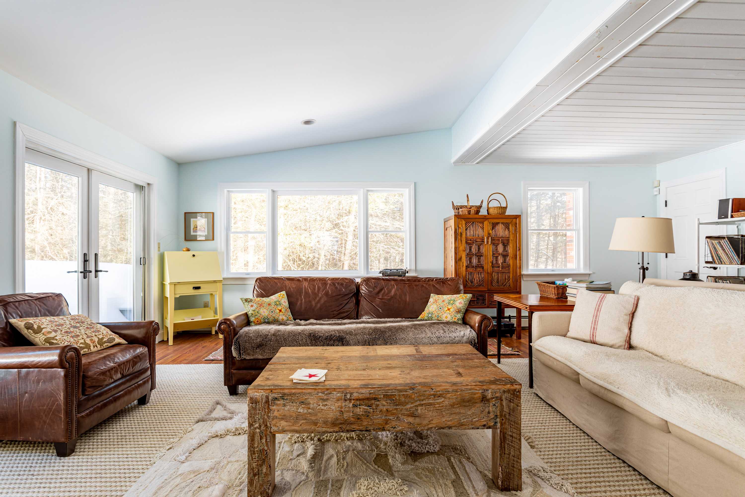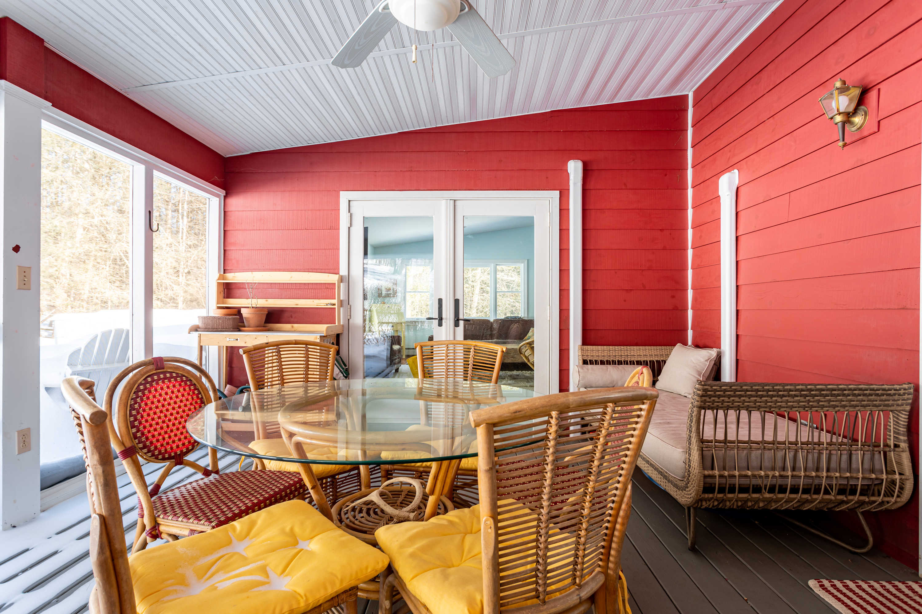 On the main floor, the living room is made for settling in. Leather armchairs, a plush sofa, and a rustic wood coffee table create a cozy setting for movie nights or quiet afternoons. A large TV and media console anchor the room, while a piano, bookshelves, artwork, and collected décor give the space a homey feel. Natural light pours in through large windows and glass doors, and direct access to the screened-in porch extends the living space even further.