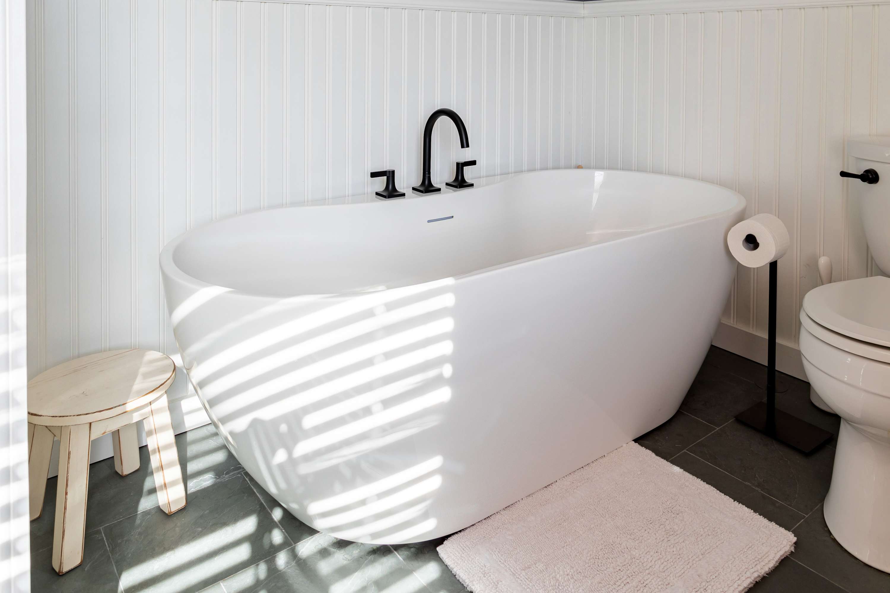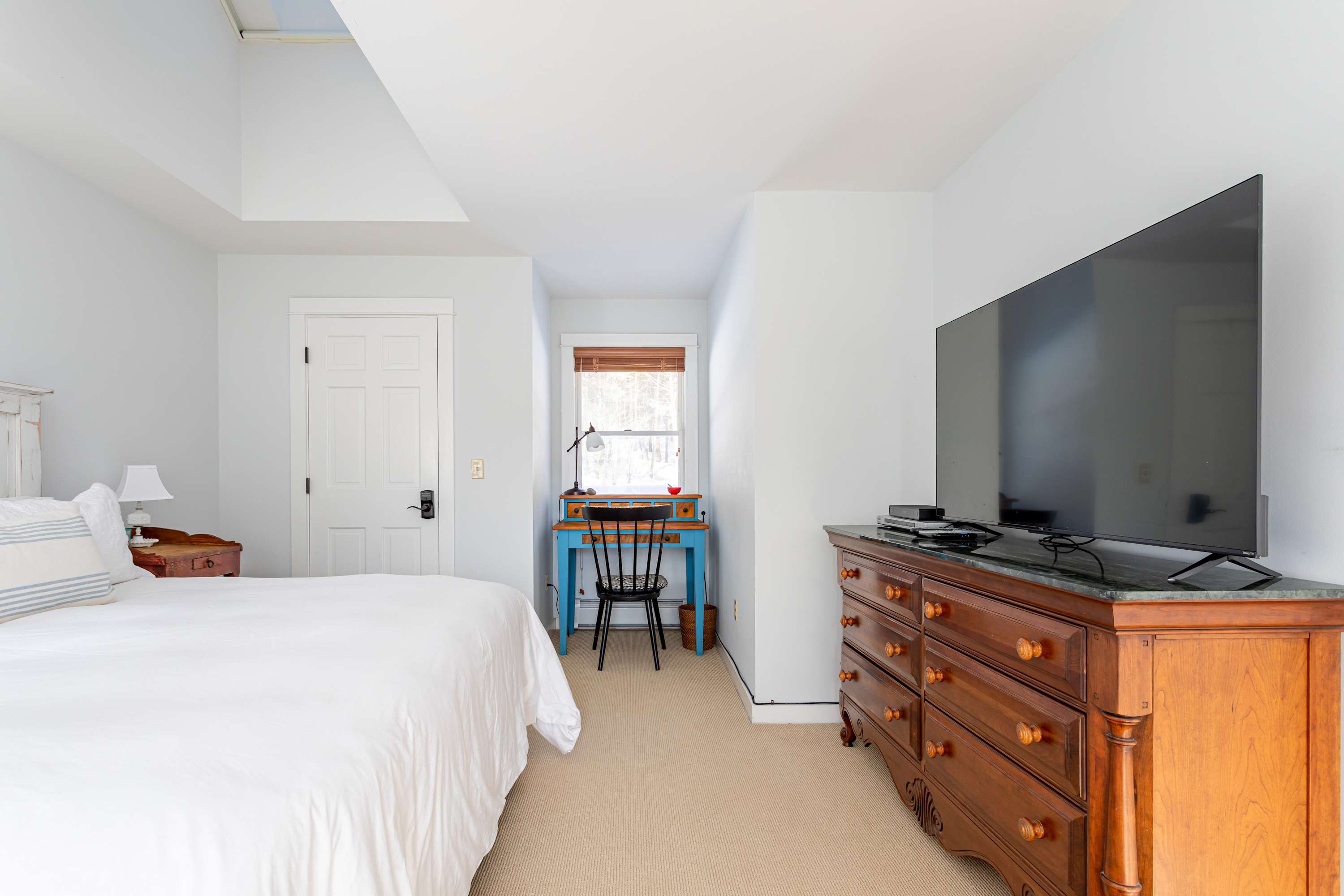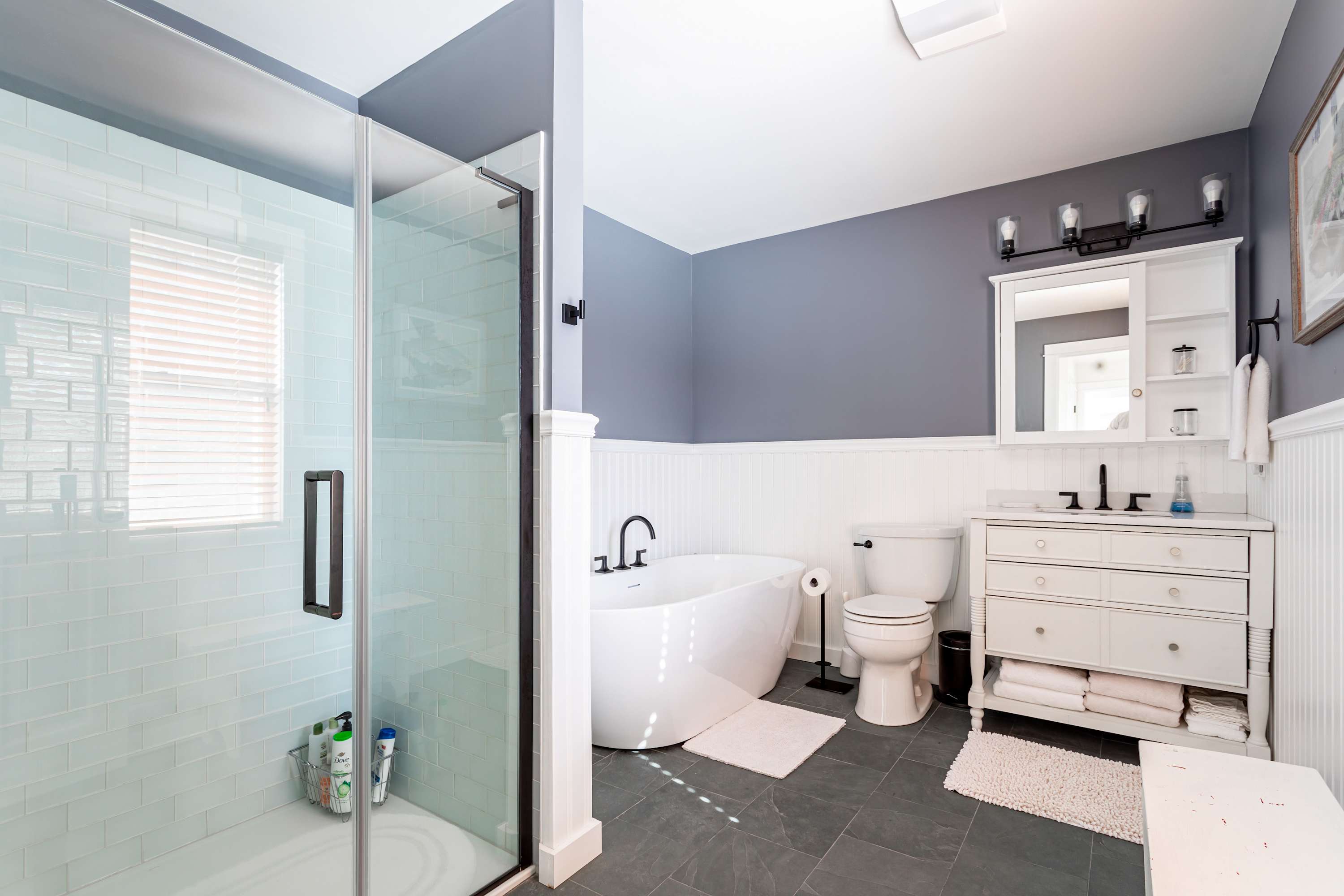 Upstairs, there are three bedrooms each with a laptop friendly workspace and a bathroom with a separate soaking tub and walk-in shower. The primary bedroom features a king size bed, TV, and a walk-in closet and the two guest bedrooms each include a full bed. On the main floor, there is an additional guest bedroom with a full bed and another bathroom with a walk-in shower.