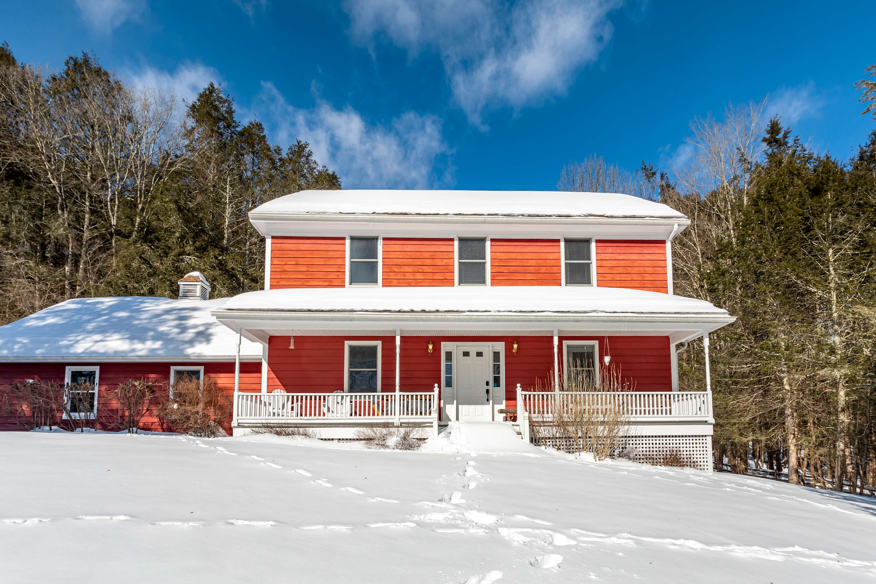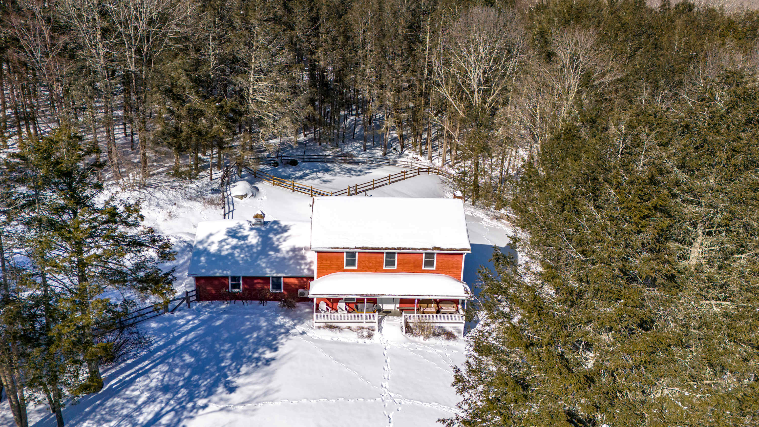 Redwood Manor is a classic two-story red farmhouse with traditional clapboard siding and a wide covered front porch offering a timeless country retreat surrounded by peaceful woodland.