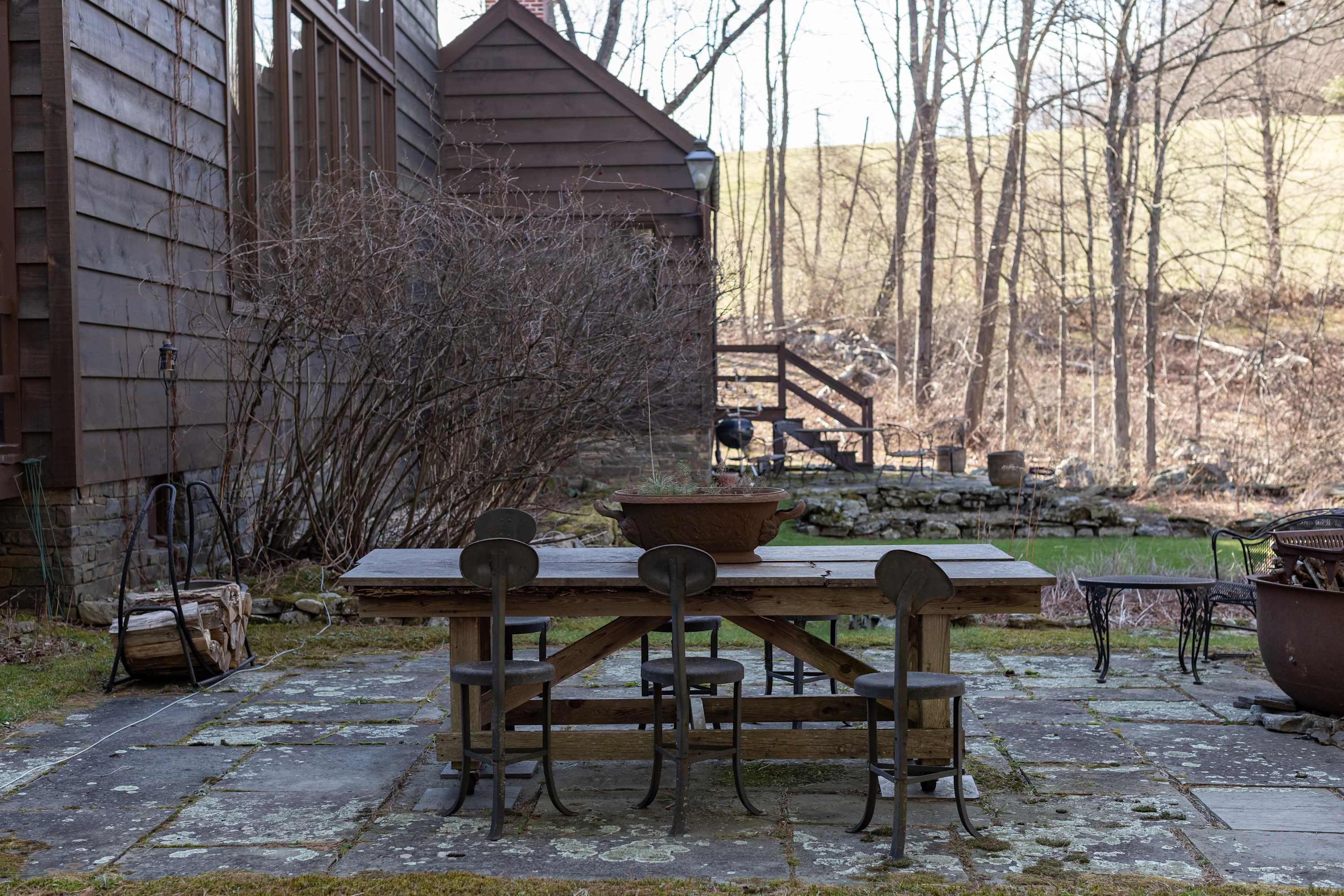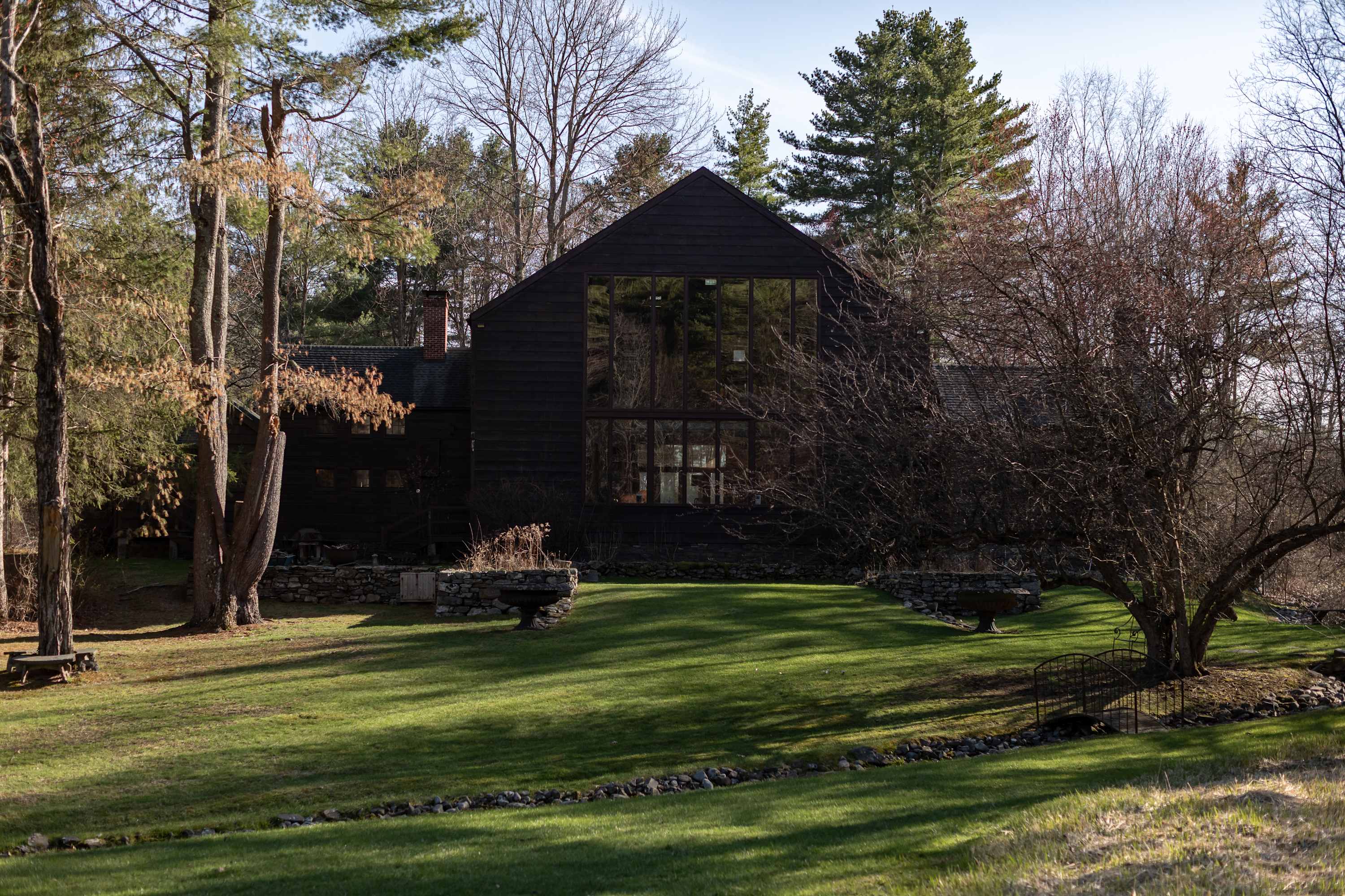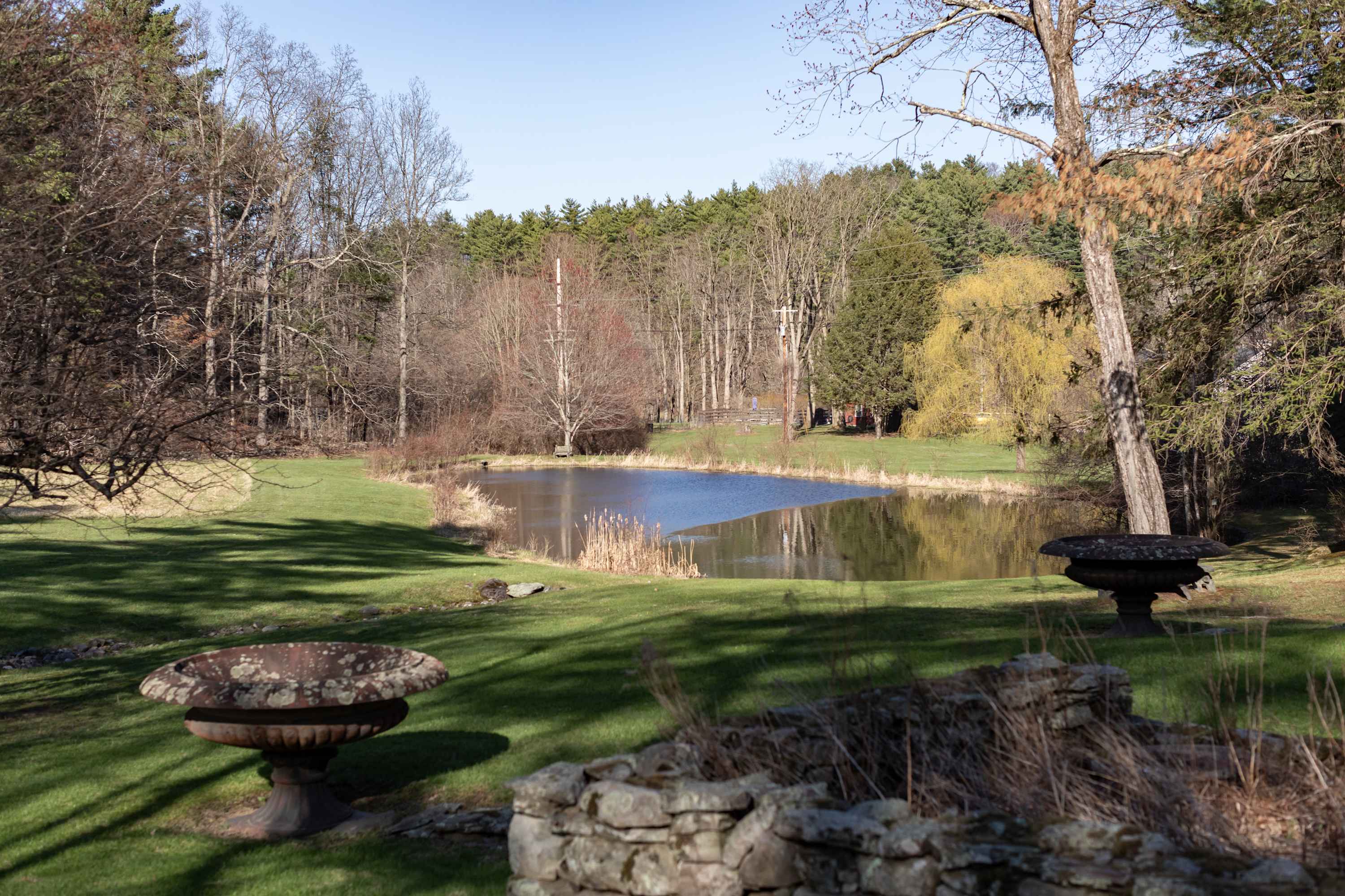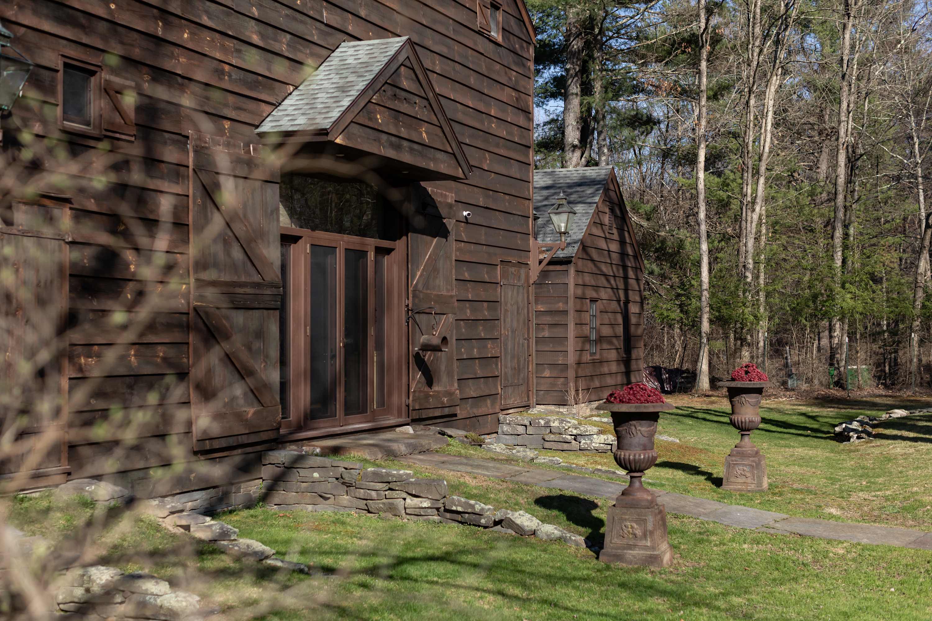 Outside, stone patios open to sweeping grounds, a pond, and a landscape that feels intentionally left to breathe. The setting offers both privacy and presence, with room to gather, wander, and take in the quiet beauty of the property. Whether you’re drawn to the architecture, the artful interiors, or the sense of escape, this is the kind of stay that feels memorable from the moment you arrive.