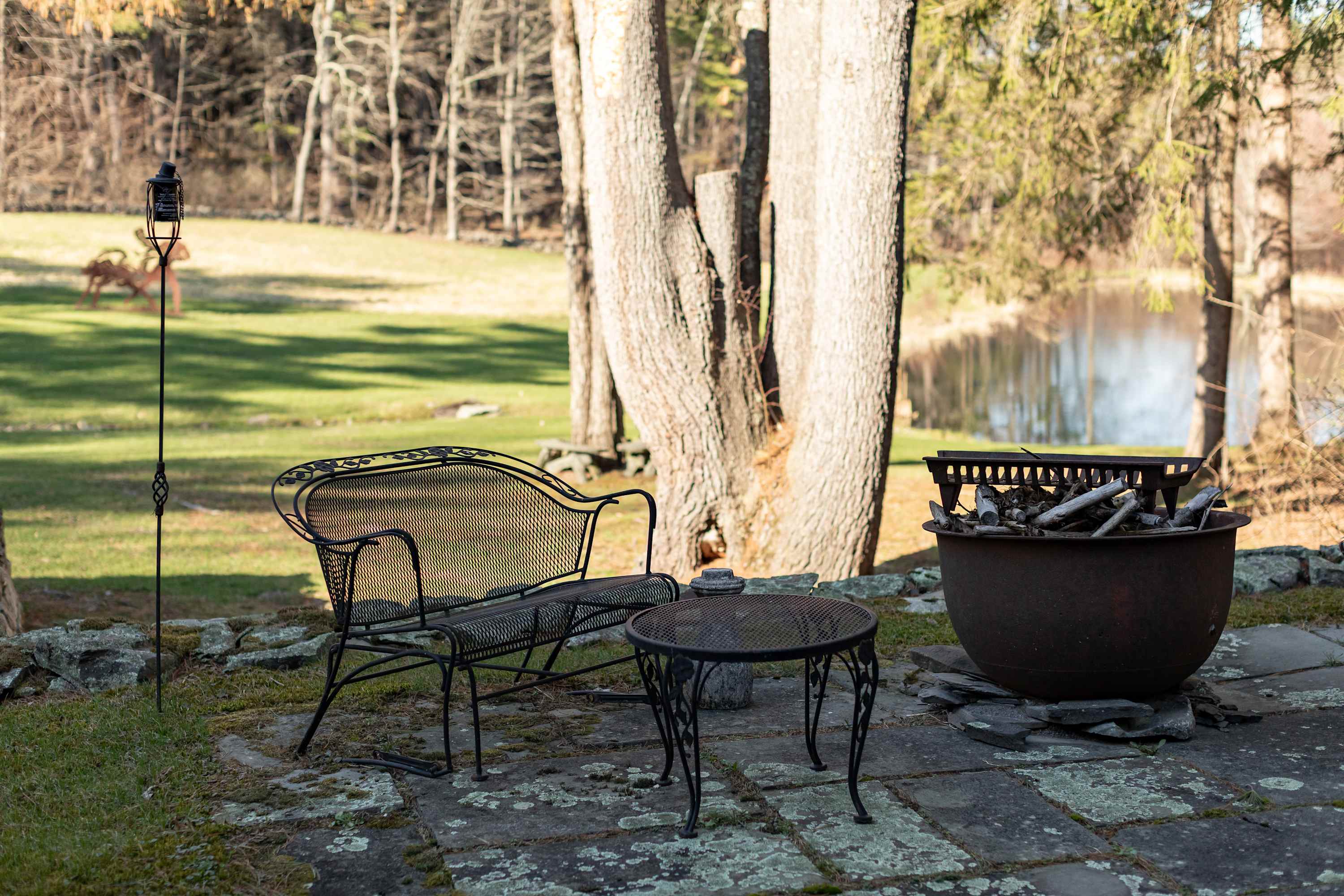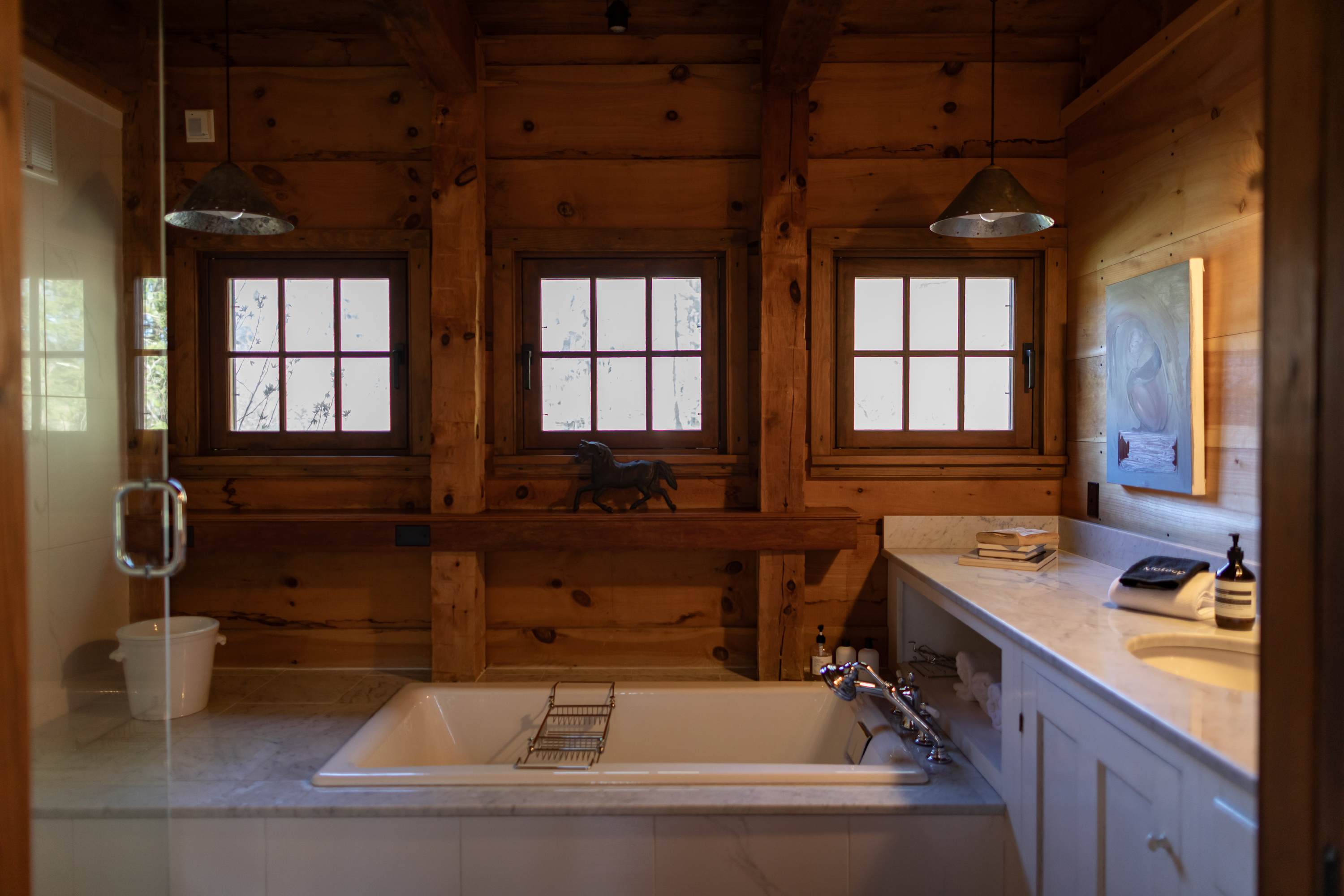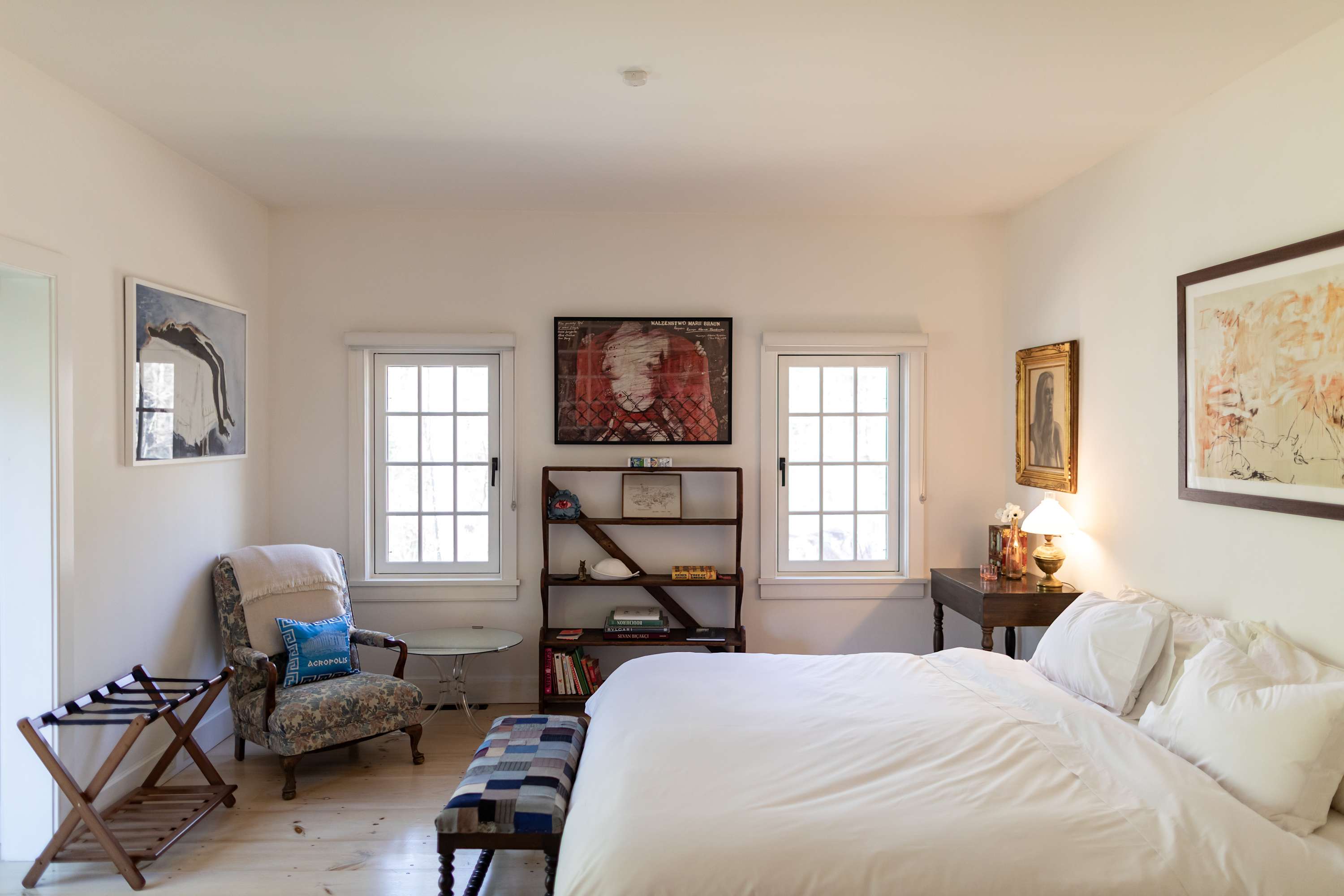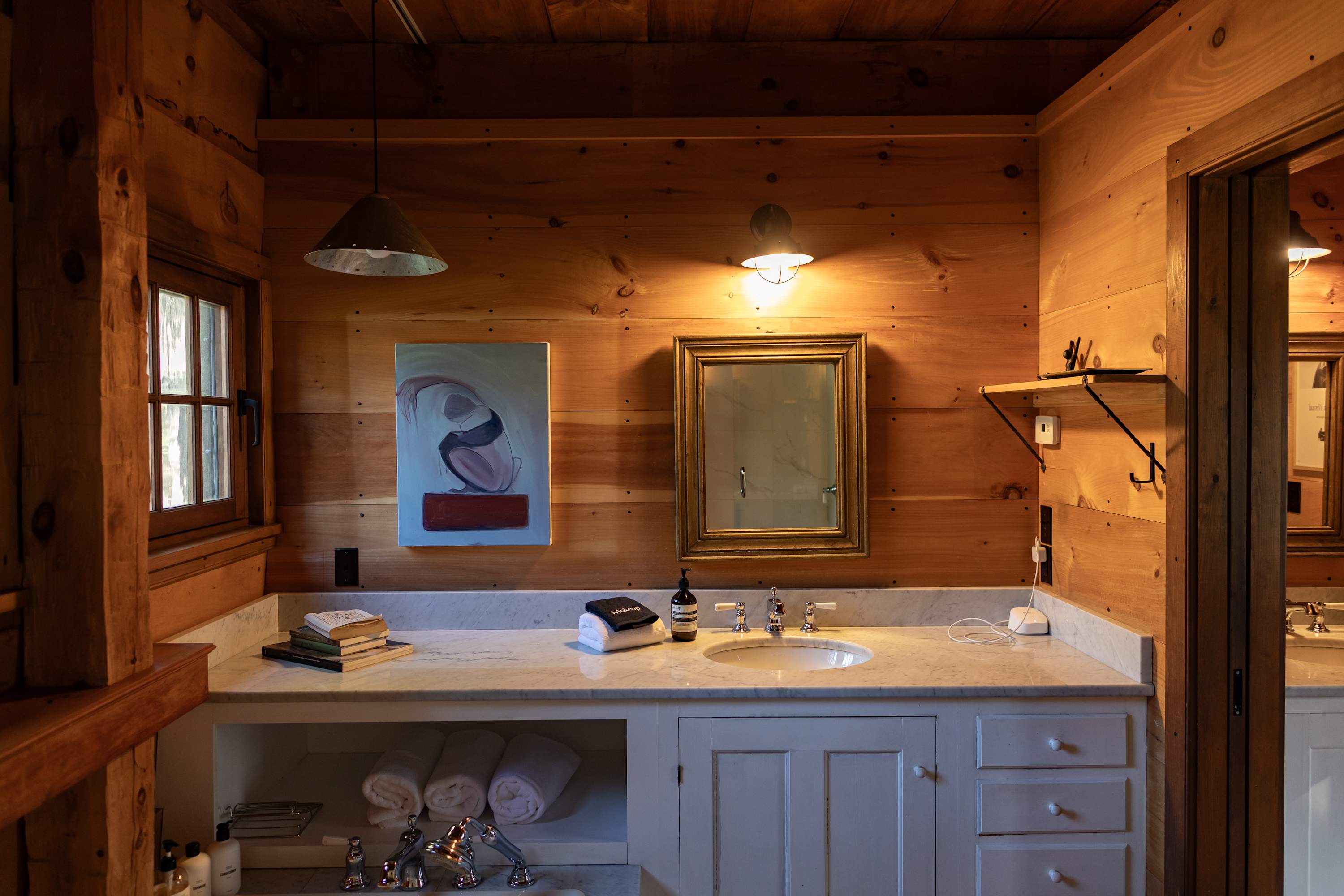 Outside, stone patios open to sweeping grounds, a pond, and a landscape that feels intentionally left to breathe. The setting offers both privacy and presence, with room to gather, wander, and take in the quiet beauty of the property. Whether you’re drawn to the architecture, the artful interiors, or the sense of escape, this is the kind of stay that feels memorable from the moment you arrive.