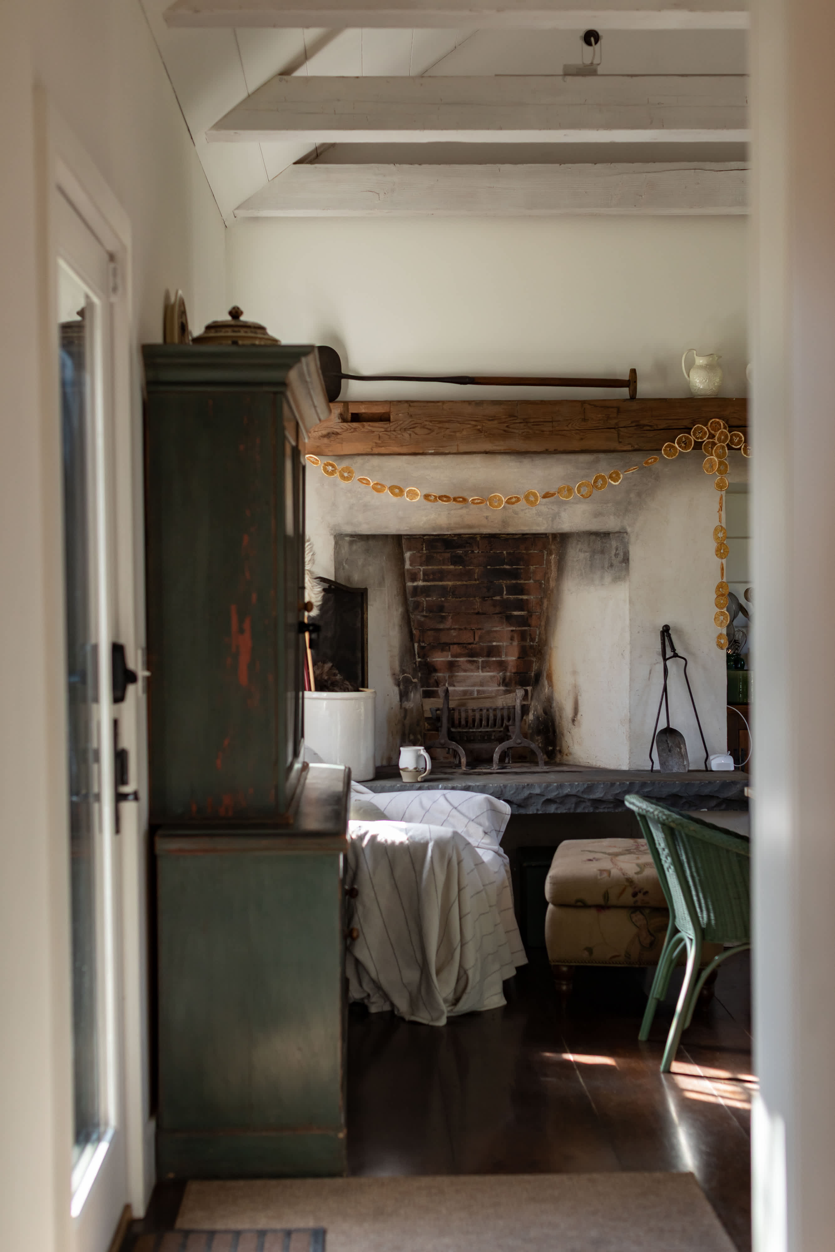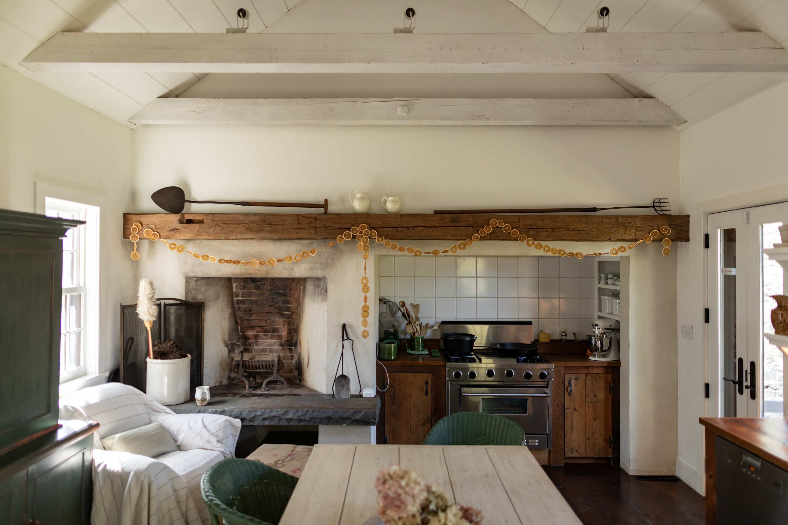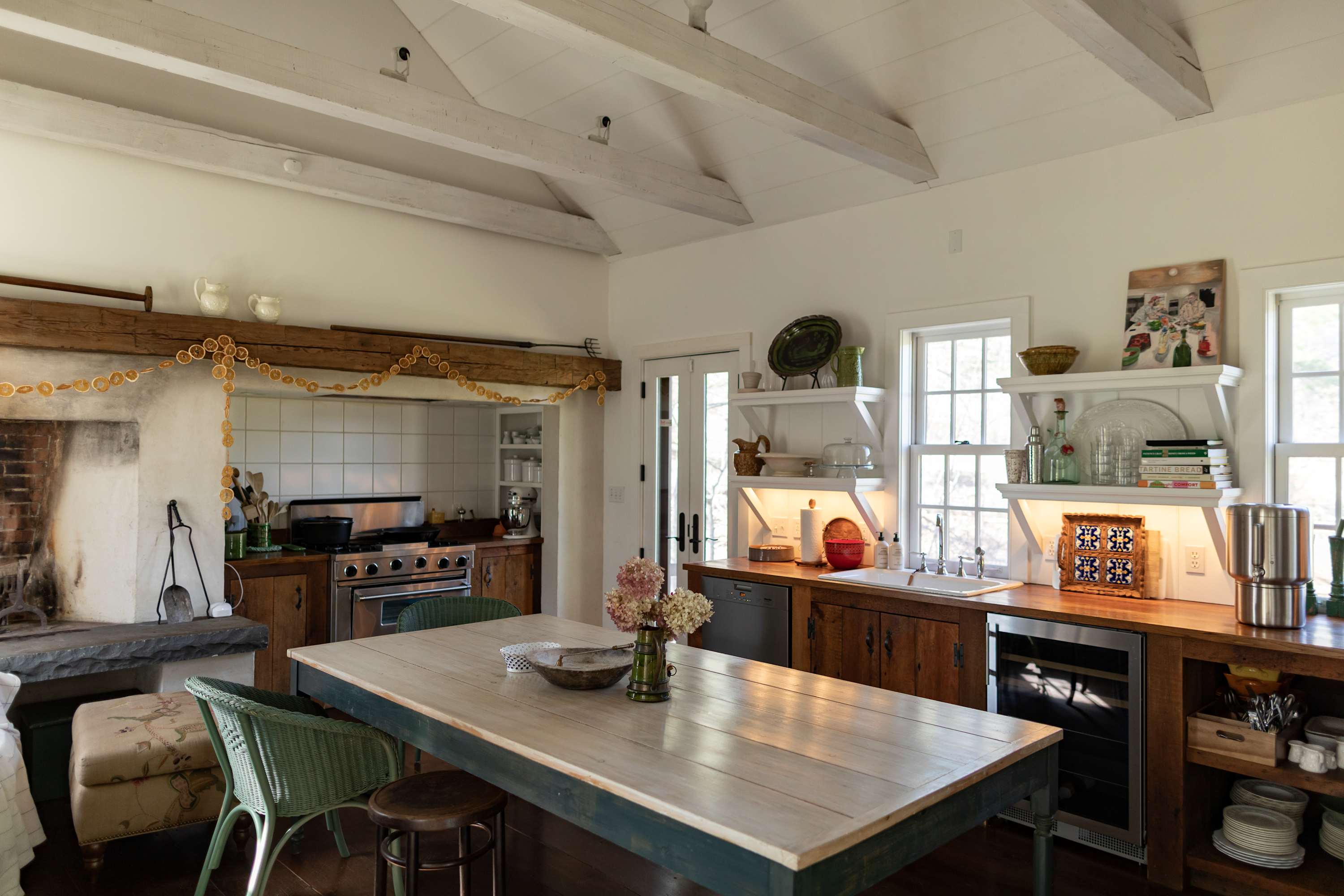 The chef's kitchen stands off the main room, and features its own fireplace. Well outfitted for culinary inclined travelers, the room is cheery and welcoming with a fire lit, coffee on, and a roast in the oven.
