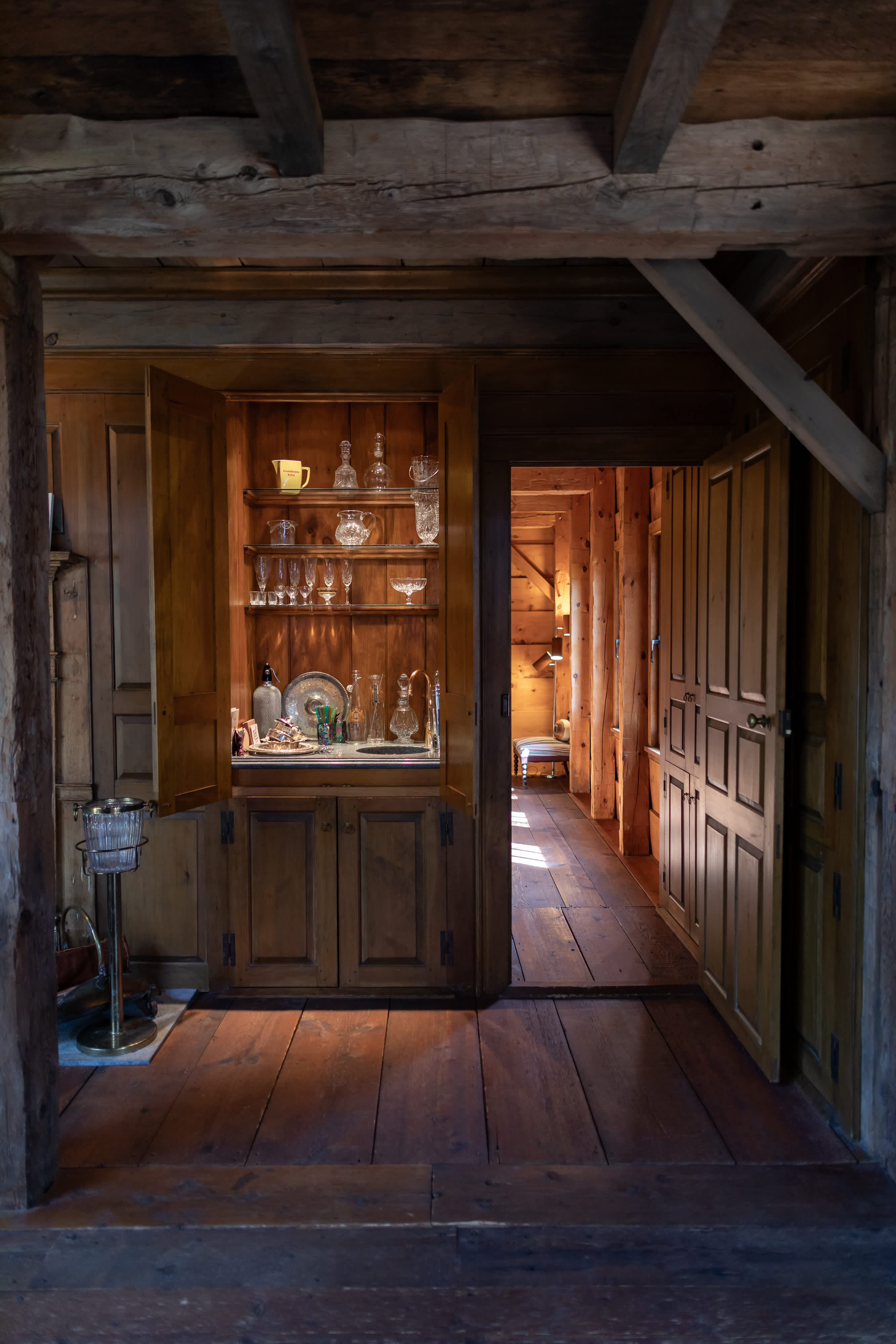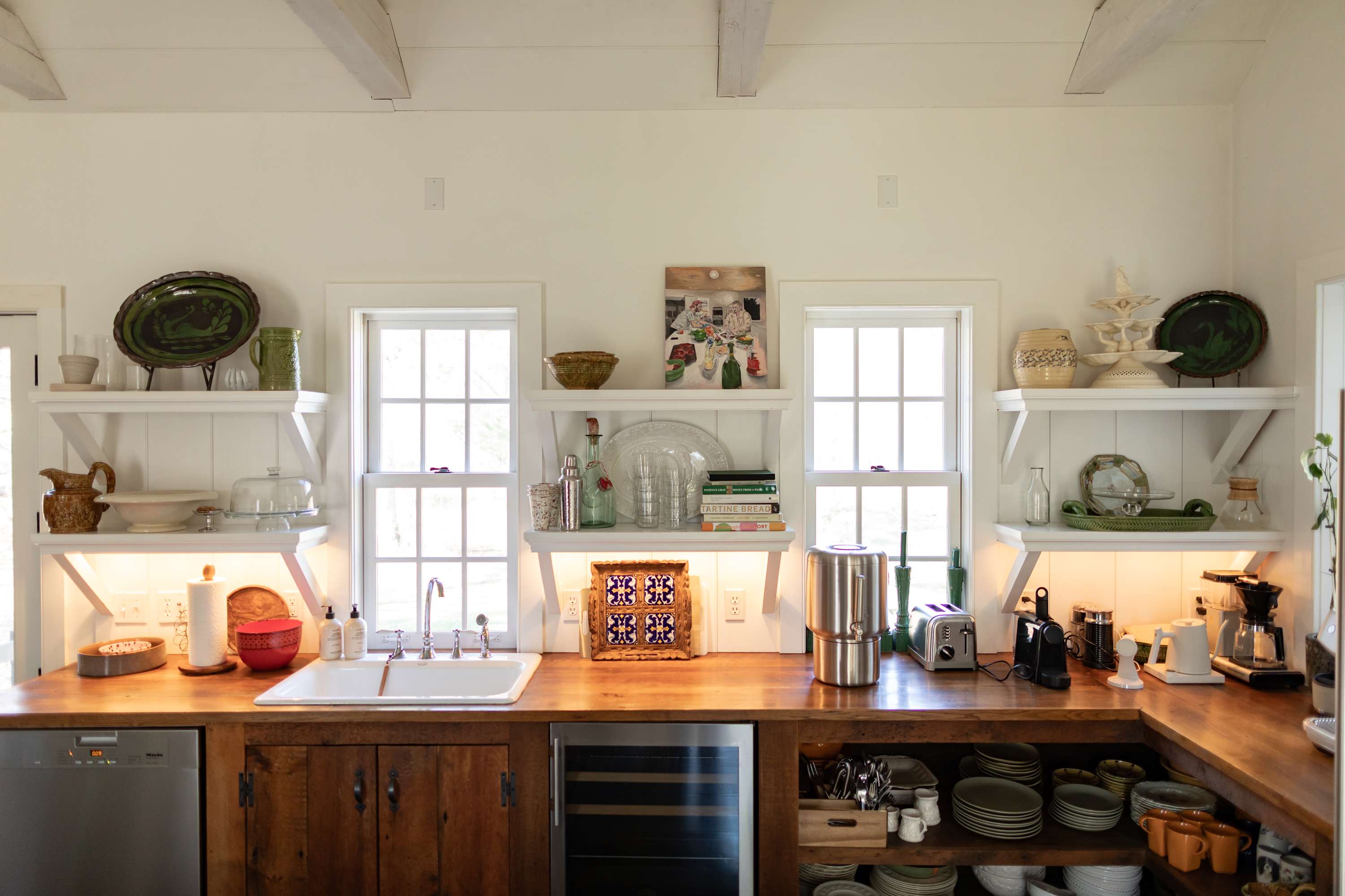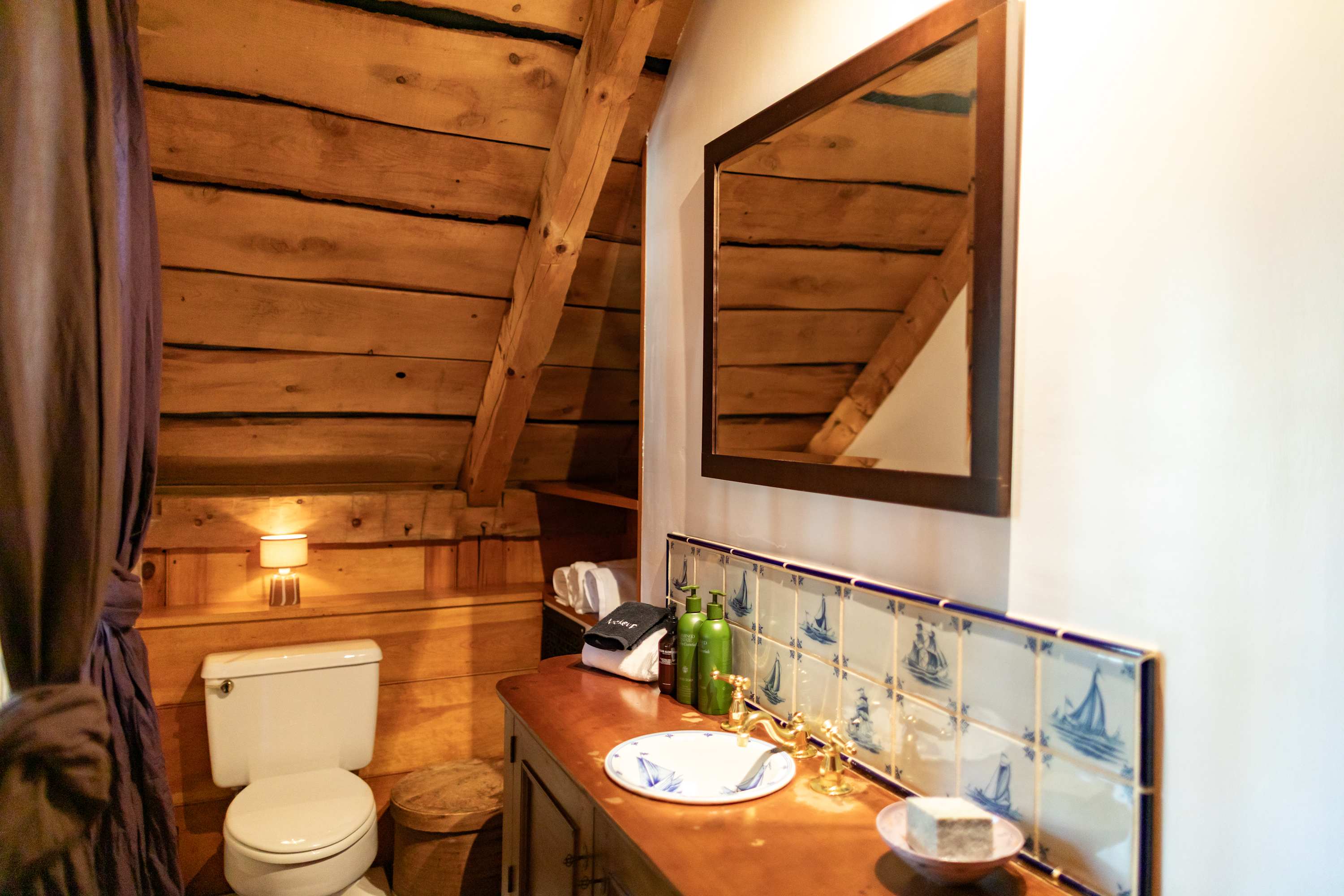 The chef's kitchen stands off the main room, and features its own fireplace. Well outfitted for culinary inclined travelers, the room is cheery and welcoming with a fire lit, coffee on, and a roast in the oven.