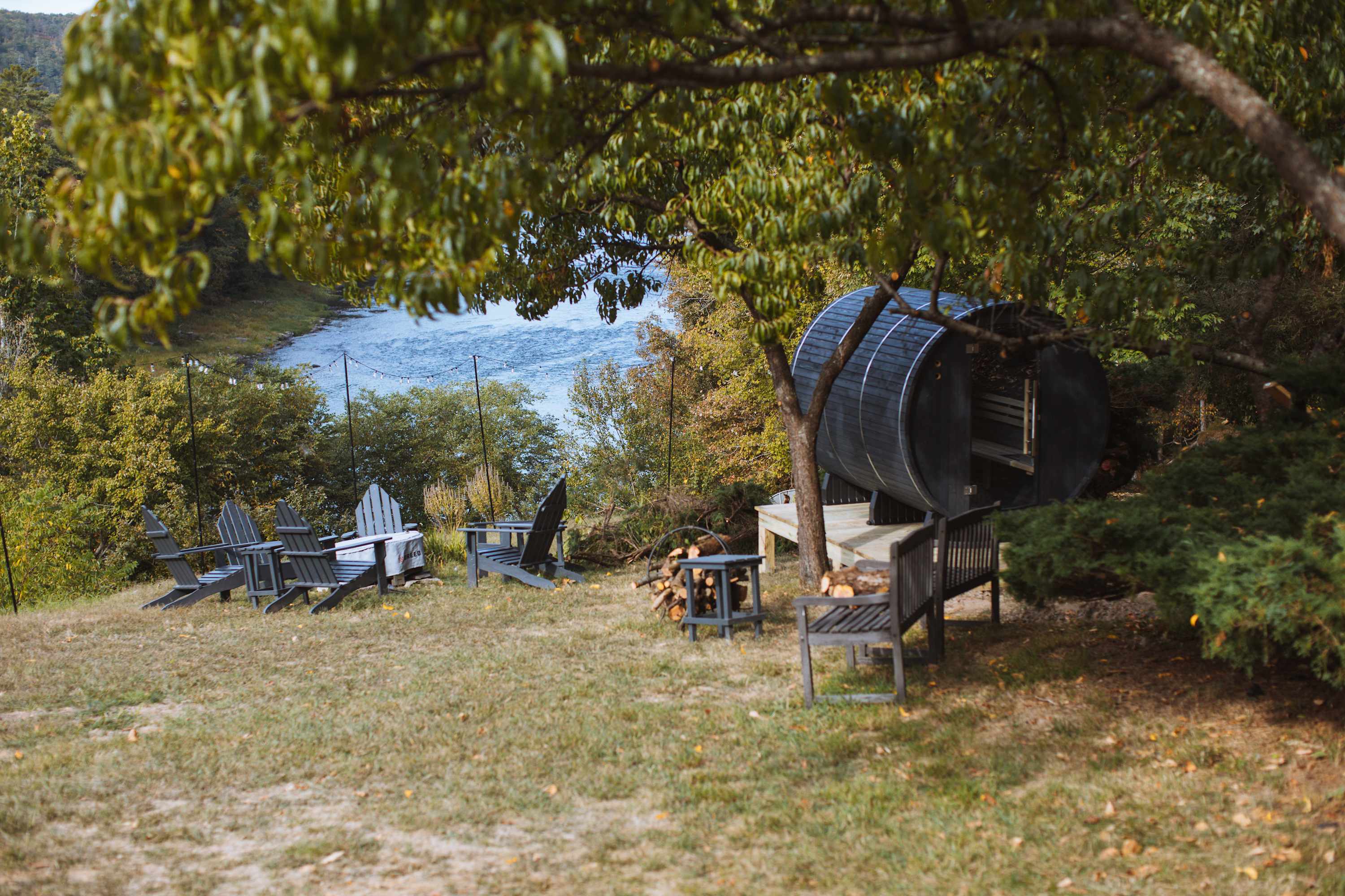 There is a spacious open-air bluestone patio with elegant black metal dining tables, lounge chairs, and a BBQ grill. The gazebo and nearby Breeo firepit with Adirondack chairs offer views of the river—the perfect spots to sit and enjoy the scenery. Guests can fish in the river or take a swim with the provided life jackets.