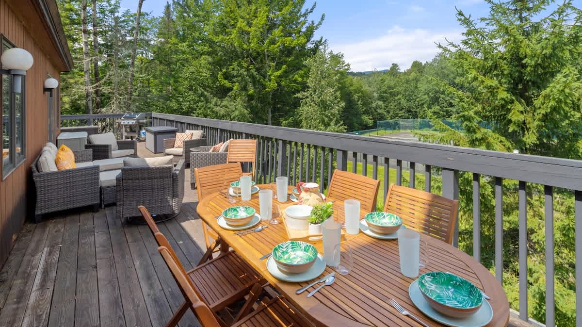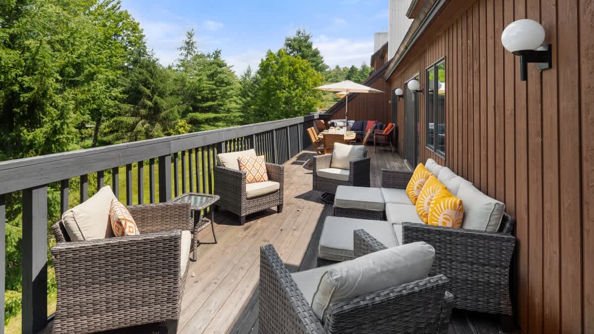 * Loads of windows and an enormous wrap-around deck with comfy outdoor furniture