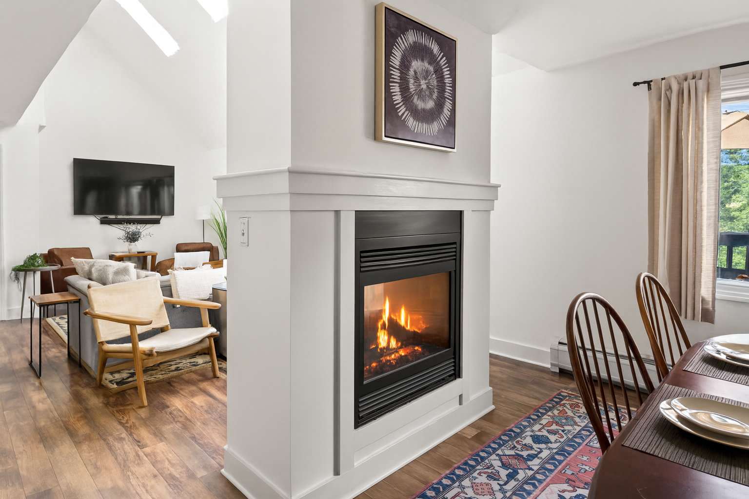 * Two-sided gas fireplace for cozy ambiance in the living room and dining area