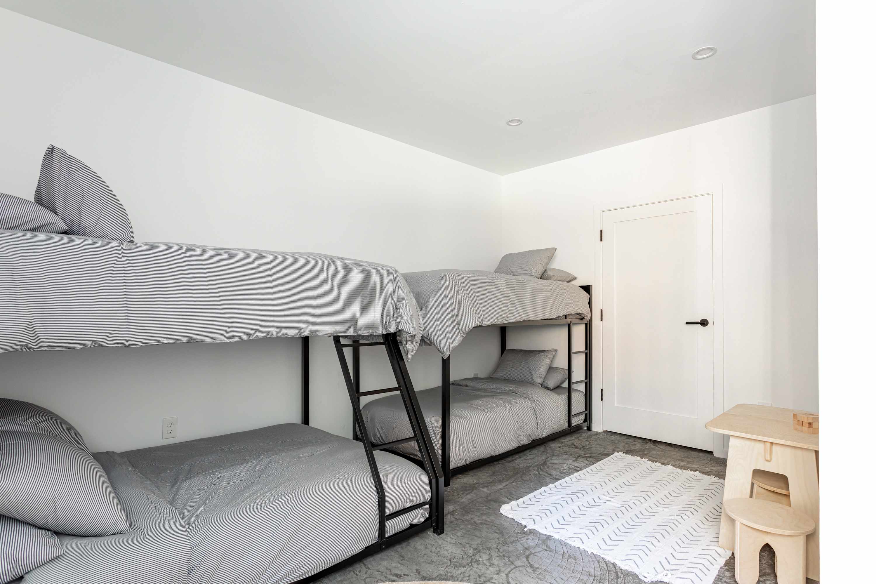 The lower-level is a cozy retreat perfect for movie nights, games night or quiet relaxation. The media lounge offers a comfy sectional couch, pool table, kitchenette, circular dining table for six and direct access to the outdoors. Also on this level is the kid’s room with 2 bunk beds and a bathroom with dual sinks and a walk-in shower.