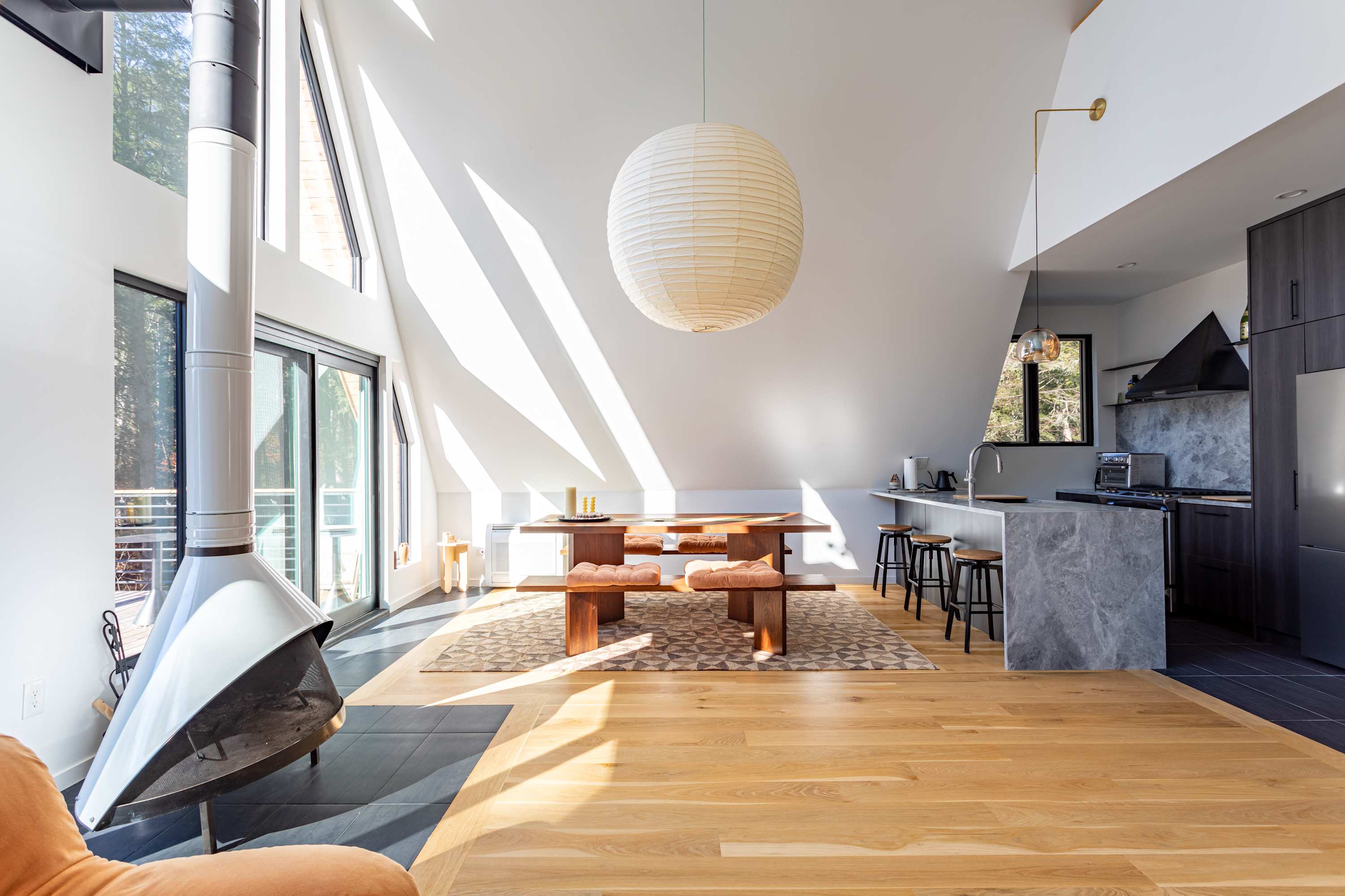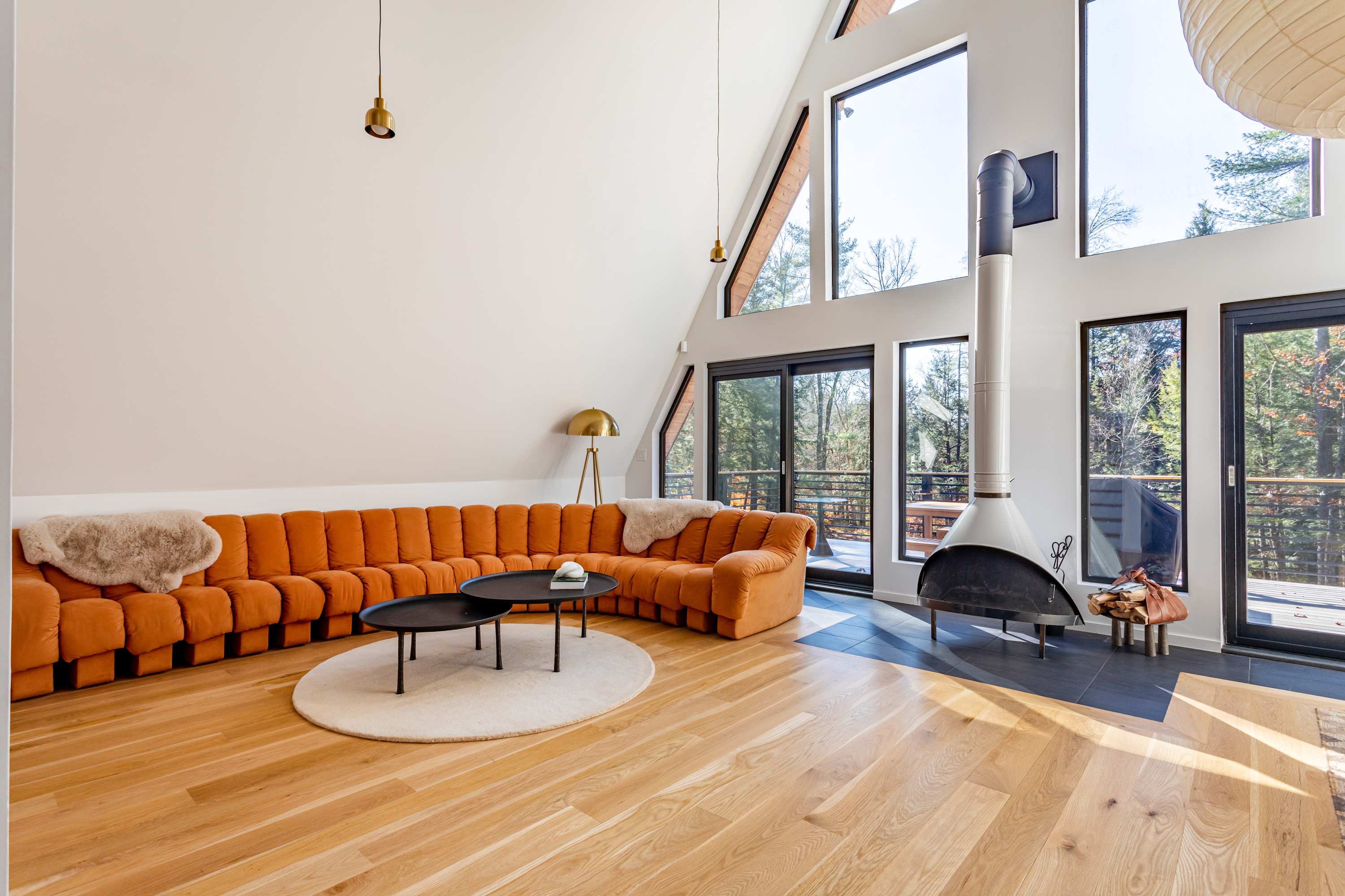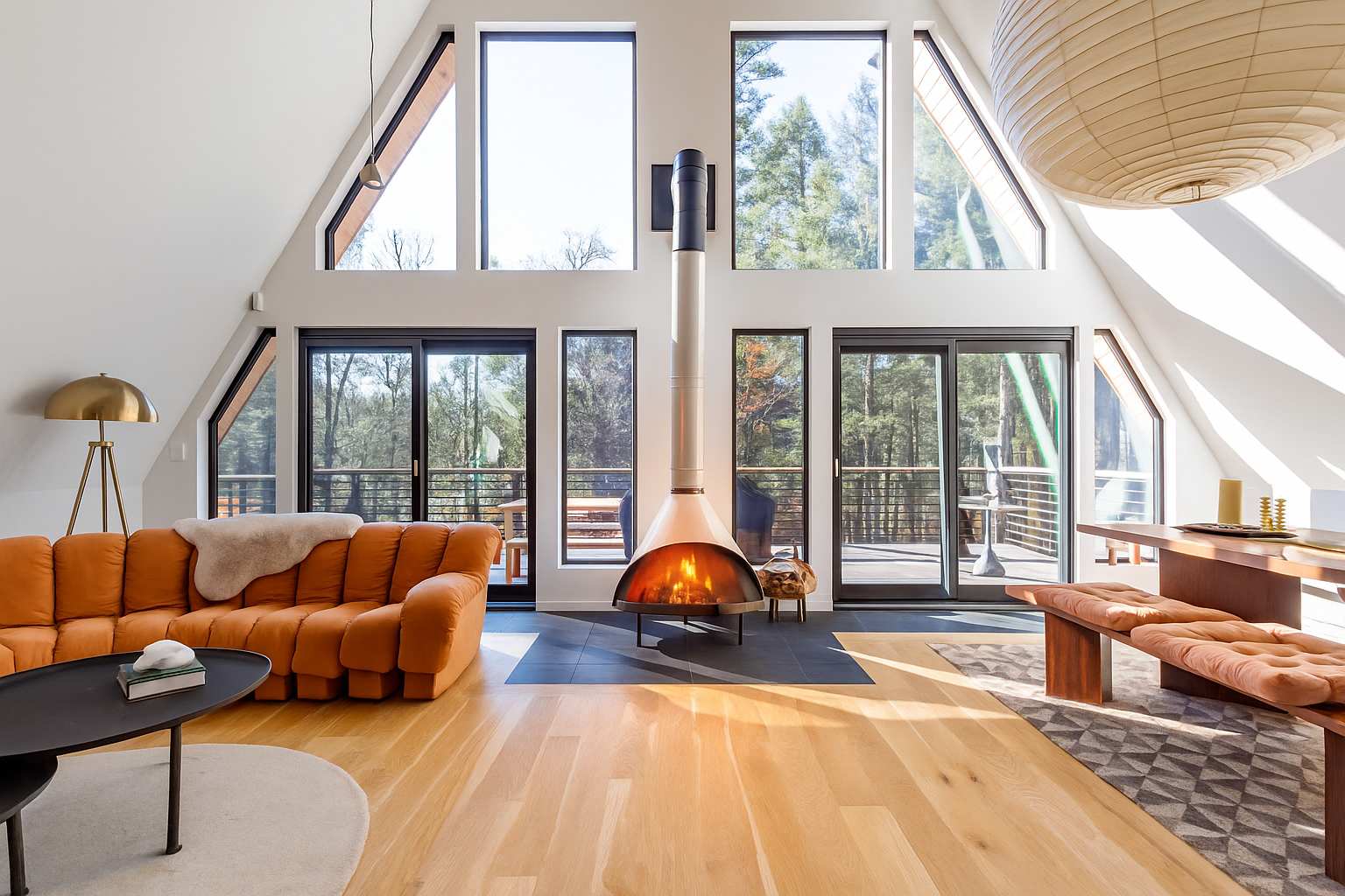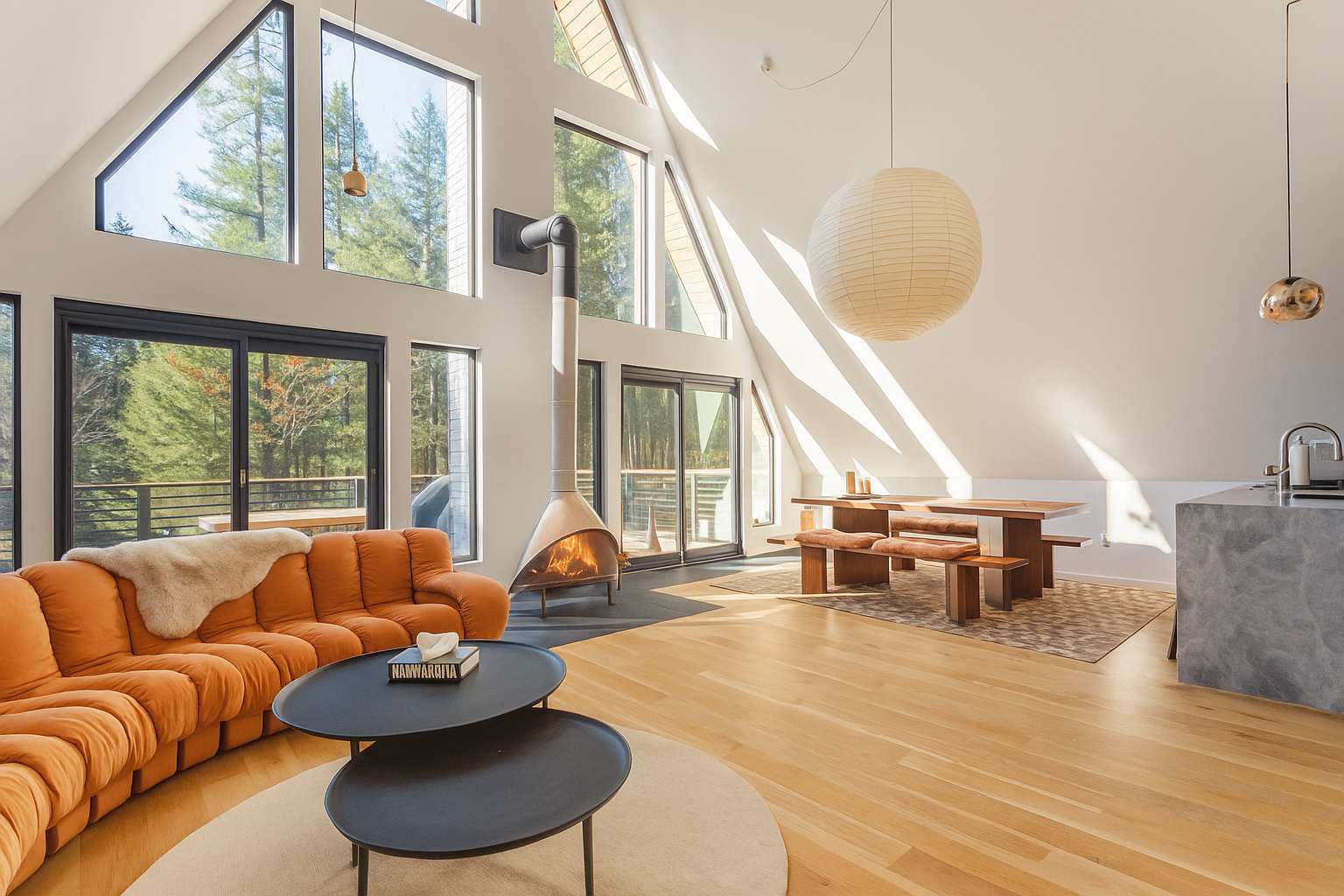 The open-concept main floor is bright, airy, and beautifully designed for gathering and relaxation. The living area features a striking A-frame ceiling with expansive windows that fill the space with natural light and frame views of the surrounding forest. A plush, rust-colored curved sectional invites you to unwind by the suspended fireplace, creating a cozy focal point for evenings in.