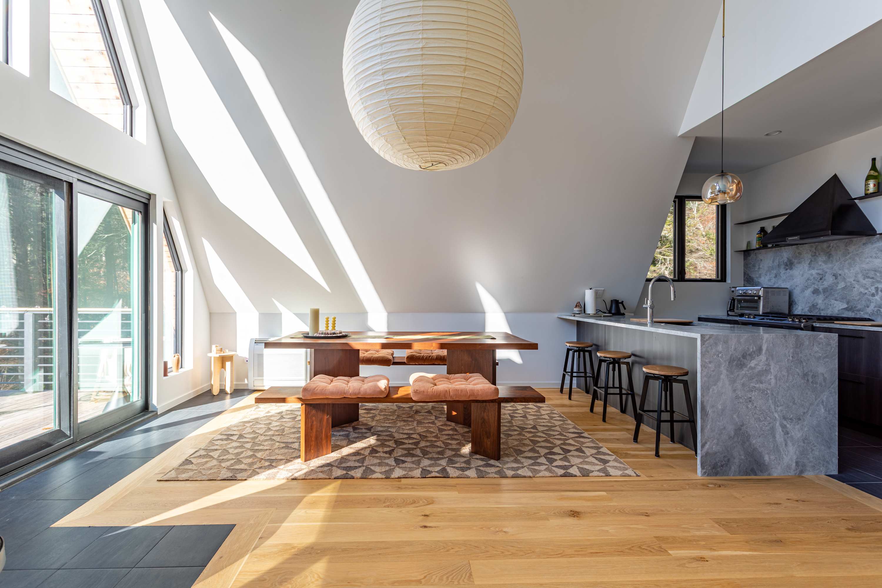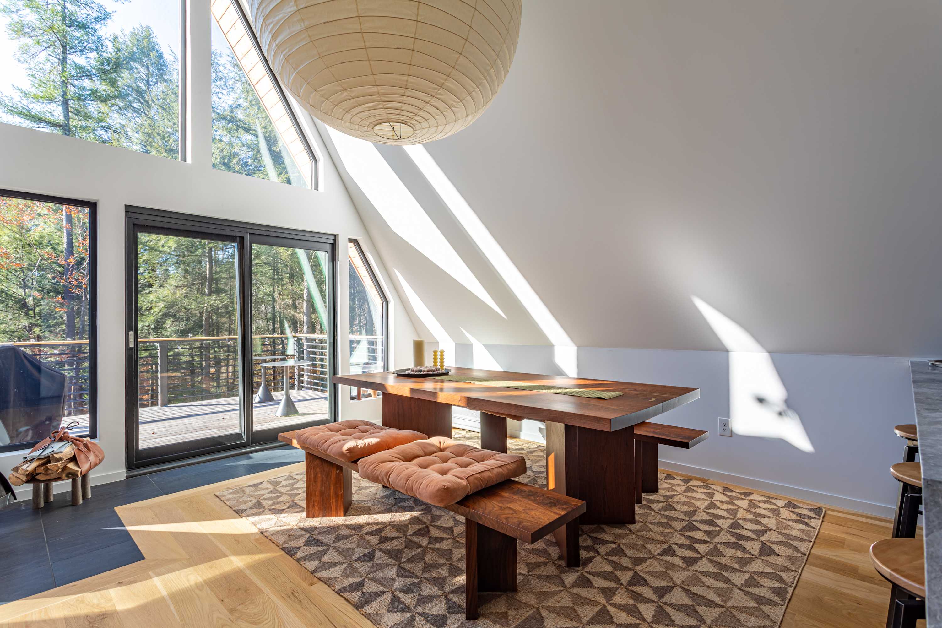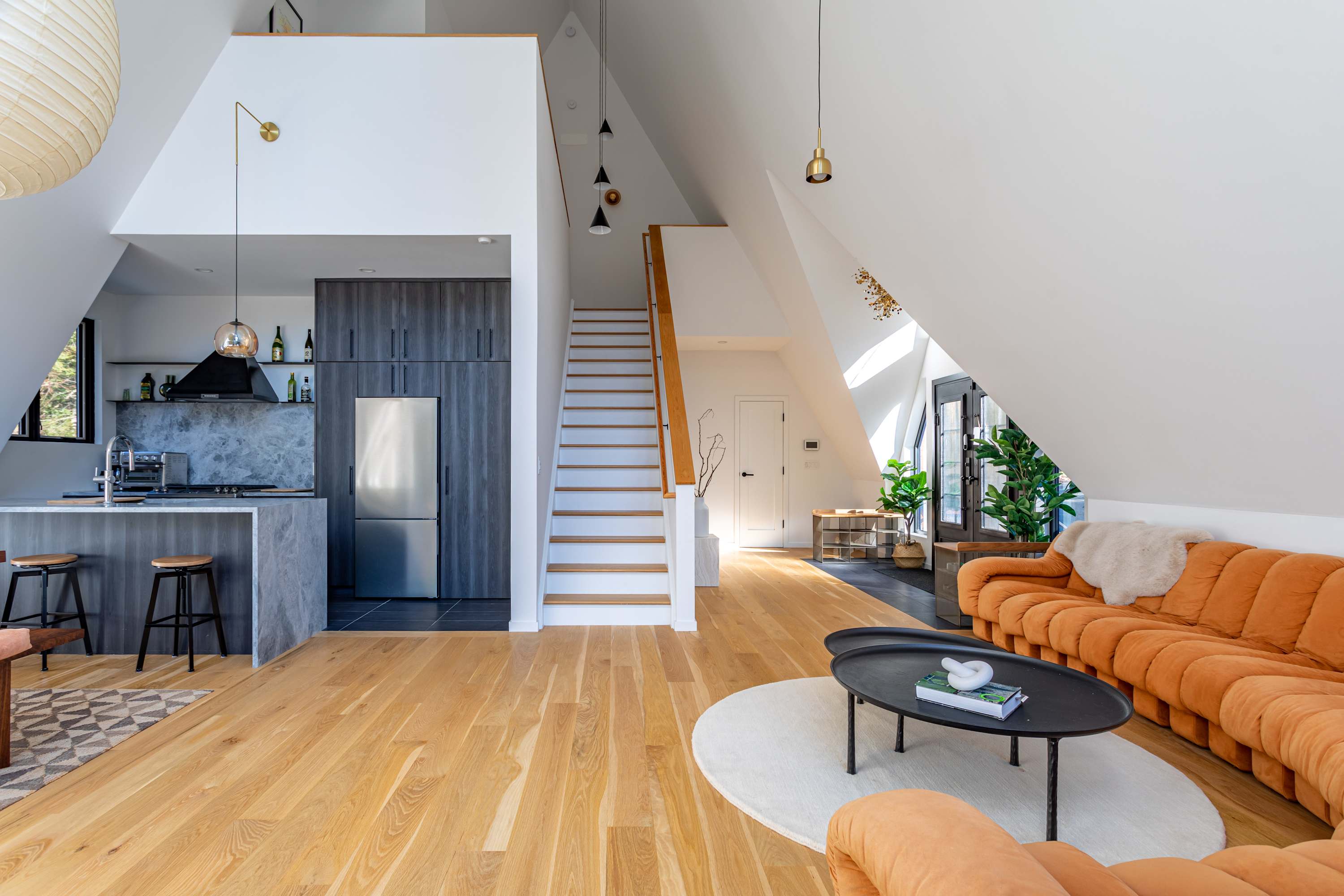 The open-concept main floor is bright, airy, and beautifully designed for gathering and relaxation. The living area features a striking A-frame ceiling with expansive windows that fill the space with natural light and frame views of the surrounding forest. A plush, rust-colored curved sectional invites you to unwind by the suspended fireplace, creating a cozy focal point for evenings in.